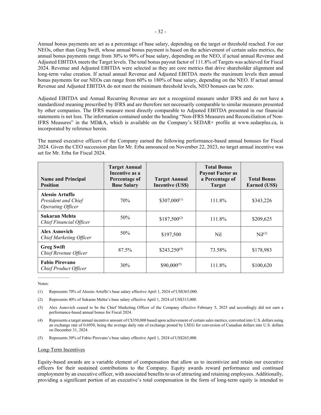 - 32 - Annual bonus payments are set as a percentage of base salary, depending on the target or threshold reached. For our NEOs, other than Greg Swift, whose annual bonus payment is based on the achievement of certain sales metrics, the annual bonus payments range from 30% to 90% of base salary, depending on the NEO, if actual annual Revenue and Adjusted EBITDA meets the Target levels. The total bonus payout factor of 111.8% of Targets was achieved for Fiscal 2024. Revenue and Adjusted EBITDA were selected as they are core metrics that drive shareholder alignment and long-term value creation. If actual annual Revenue and Adjusted EBITDA meets the maximum levels then annual bonus payments for our NEOs can range from 60% to 180% of base salary, depending on the NEO. If actual annual Revenue and Adjusted EBITDA do not meet the minimum threshold levels, NEO bonuses can be zero. Adjusted EBITDA and Annual Recurring Revenue are not a recognized measure under IFRS and do not have a standardized meaning prescribed by IFRS and are therefore not necessarily comparable to similar measures presented by other companies. The IFRS measure most directly comparable to Adjusted EBITDA presented in our financial statements is net loss. The information contained under the heading “Non-IFRS Measures and Reconciliation of Non- IFRS Measures” in the MD&A, which is available on the Company’s SEDAR+ profile at www.sedarplus.ca, is incorporated by reference herein. The named executive officers of the Company earned the following performance-based annual bonuses for Fiscal 2024. Given the CEO succession plan for Mr. Erba announced on November 22, 2023, no target annual incentive was set for Mr. Erba for Fiscal 2024. Name and Principal Position Target Annual Incentive as a Percentage of Base Salary Target Annual Incentive (US$) Total Bonus Payout Factor as a Percentage of Target Total Bonus Earned (US$) Alessio Artuffo President and Chief Operating Officer 70% $307,000(1) 111.8% $343,226 Sukaran Mehta Chief Financial Officer 50% $187,500(2) 111.8% $209,625 Alex Asnovich Chief Marketing Officer 50% $197,500 Nil Nil(3) Greg Swift Chief Revenue Officer 87.5% $243,250(4) 73.58% $178,983 Fabio Pirovano Chief Product Officer 30% $90,000(5) 111.8% $100,620 _______________ Notes: (1) Represents 70% of Alessio Artuffo’s base salary effective April 1, 2024 of US$365,000. (2) Represents 40% of Sukaran Mehta’s base salary effective April 1, 2024 of US$315,000. (3) Alex Asnovich ceased to be the Chief Marketing Officer of the Company effective February 5, 2025 and accordingly did not earn a performance-based annual bonus for Fiscal 2024. (4) Represents a target annual incentive amount of C$350,000 based upon achievement of certain sales metrics, converted into U.S. dollars using an exchange rate of 0.6950, being the average daily rate of exchange posted by LSEG for conversion of Canadian dollars into U.S. dollars on December 31, 2024. (5) Represents 30% of Fabio Pirovano’s base salary effective April 1, 2024 of US$265,000. Long-Term Incentives Equity-based awards are a variable element of compensation that allow us to incentivize and retain our executive officers for their sustained contributions to the Company. Equity awards reward performance and continued employment by an executive officer, with associated benefits to us of attracting and retaining employees. Additionally, providing a significant portion of an executive’s total compensation in the form of long-term equity is intended to