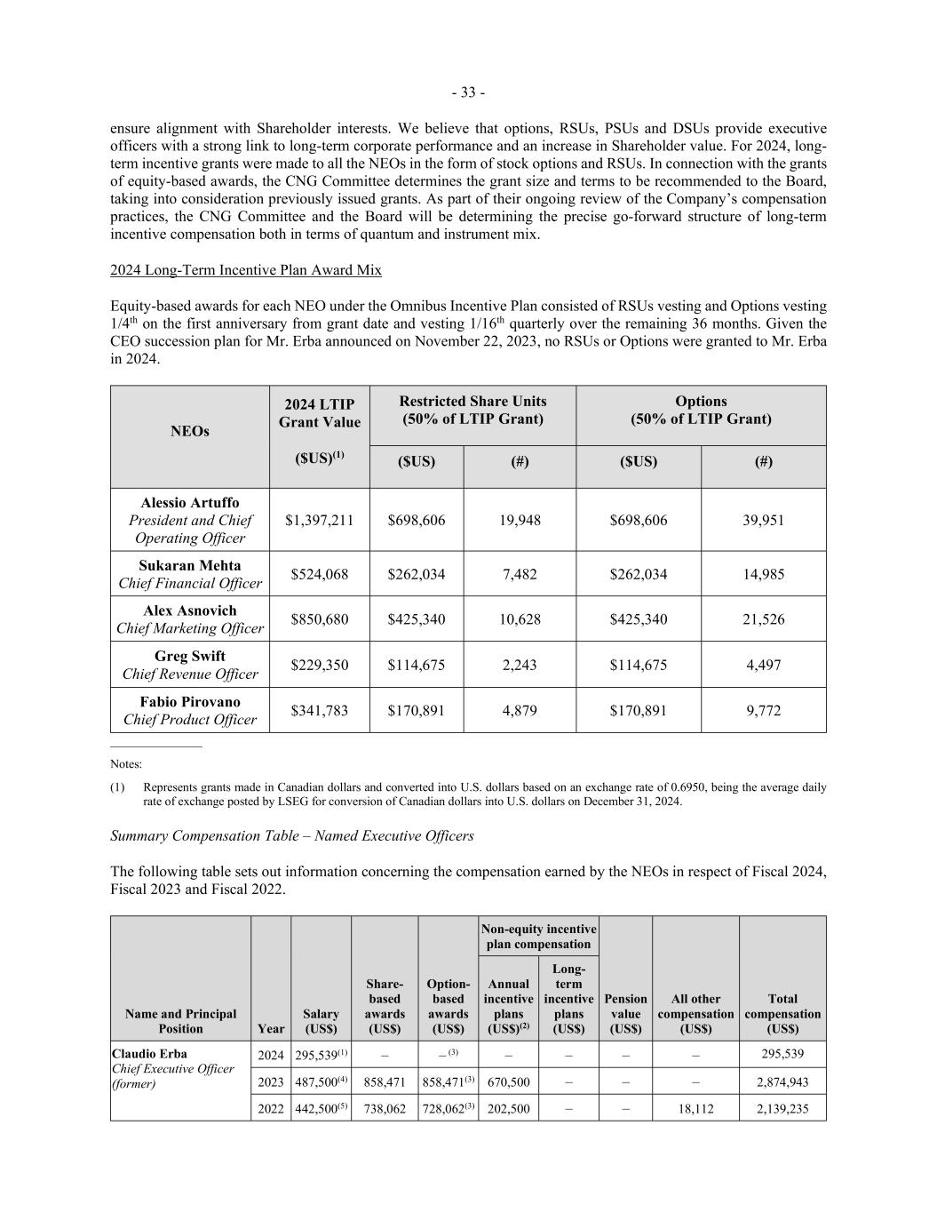 - 33 - ensure alignment with Shareholder interests. We believe that options, RSUs, PSUs and DSUs provide executive officers with a strong link to long-term corporate performance and an increase in Shareholder value. For 2024, long- term incentive grants were made to all the NEOs in the form of stock options and RSUs. In connection with the grants of equity-based awards, the CNG Committee determines the grant size and terms to be recommended to the Board, taking into consideration previously issued grants. As part of their ongoing review of the Company’s compensation practices, the CNG Committee and the Board will be determining the precise go-forward structure of long-term incentive compensation both in terms of quantum and instrument mix. 2024 Long-Term Incentive Plan Award Mix Equity-based awards for each NEO under the Omnibus Incentive Plan consisted of RSUs vesting and Options vesting 1/4th on the first anniversary from grant date and vesting 1/16th quarterly over the remaining 36 months. Given the CEO succession plan for Mr. Erba announced on November 22, 2023, no RSUs or Options were granted to Mr. Erba in 2024. NEOs 2024 LTIP Grant Value ($US)(1) Restricted Share Units (50% of LTIP Grant) Options (50% of LTIP Grant) ($US) (#) ($US) (#) Alessio Artuffo President and Chief Operating Officer $1,397,211 $698,606 19,948 $698,606 39,951 Sukaran Mehta Chief Financial Officer $524,068 $262,034 7,482 $262,034 14,985 Alex Asnovich Chief Marketing Officer $850,680 $425,340 10,628 $425,340 21,526 Greg Swift Chief Revenue Officer $229,350 $114,675 2,243 $114,675 4,497 Fabio Pirovano Chief Product Officer $341,783 $170,891 4,879 $170,891 9,772 _______________ Notes: (1) Represents grants made in Canadian dollars and converted into U.S. dollars based on an exchange rate of 0.6950, being the average daily rate of exchange posted by LSEG for conversion of Canadian dollars into U.S. dollars on December 31, 2024. Summary Compensation Table – Named Executive Officers The following table sets out information concerning the compensation earned by the NEOs in respect of Fiscal 2024, Fiscal 2023 and Fiscal 2022. Name and Principal Position Year Salary (US$) Share- based awards (US$) Option- based awards (US$) Non-equity incentive plan compensation Pension value (US$) All other compensation (US$) Total compensation (US$) Annual incentive plans (US$)(2) Long- term incentive plans (US$) Claudio Erba Chief Executive Officer (former) 2024 295,539(1) – – (3) – – – – 295,539 2023 487,500(4) 858,471 858,471(3) 670,500 – – – 2,874,943 2022 442,500(5) 738,062 728,062(3) 202,500 – – 18,112 2,139,235