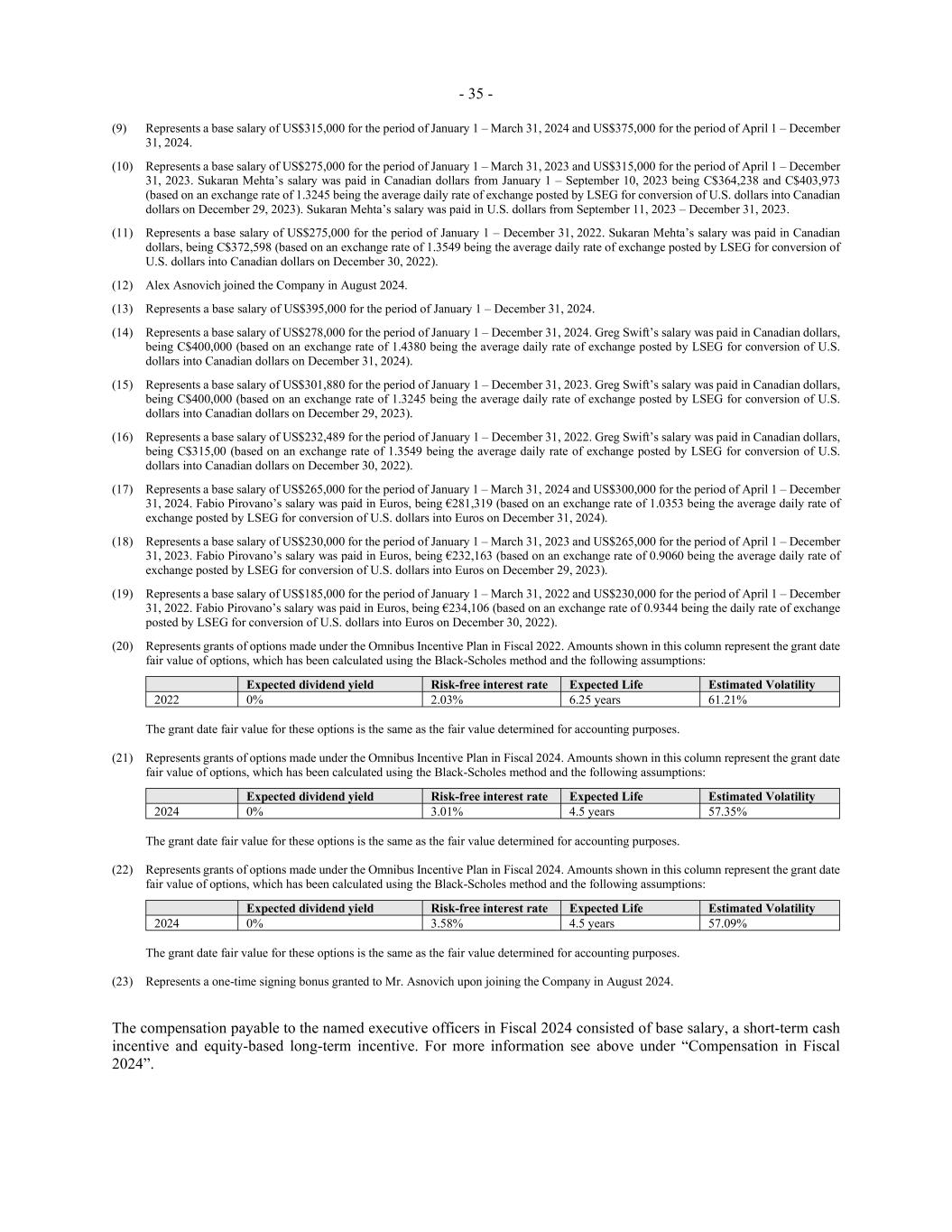- 35 - (9) Represents a base salary of US$315,000 for the period of January 1 – March 31, 2024 and US$375,000 for the period of April 1 – December 31, 2024. (10) Represents a base salary of US$275,000 for the period of January 1 – March 31, 2023 and US$315,000 for the period of April 1 – December 31, 2023. Sukaran Mehta’s salary was paid in Canadian dollars from January 1 – September 10, 2023 being C$364,238 and C$403,973 (based on an exchange rate of 1.3245 being the average daily rate of exchange posted by LSEG for conversion of U.S. dollars into Canadian dollars on December 29, 2023). Sukaran Mehta’s salary was paid in U.S. dollars from September 11, 2023 – December 31, 2023. (11) Represents a base salary of US$275,000 for the period of January 1 – December 31, 2022. Sukaran Mehta’s salary was paid in Canadian dollars, being C$372,598 (based on an exchange rate of 1.3549 being the average daily rate of exchange posted by LSEG for conversion of U.S. dollars into Canadian dollars on December 30, 2022). (12) Alex Asnovich joined the Company in August 2024. (13) Represents a base salary of US$395,000 for the period of January 1 – December 31, 2024. (14) Represents a base salary of US$278,000 for the period of January 1 – December 31, 2024. Greg Swift’s salary was paid in Canadian dollars, being C$400,000 (based on an exchange rate of 1.4380 being the average daily rate of exchange posted by LSEG for conversion of U.S. dollars into Canadian dollars on December 31, 2024). (15) Represents a base salary of US$301,880 for the period of January 1 – December 31, 2023. Greg Swift’s salary was paid in Canadian dollars, being C$400,000 (based on an exchange rate of 1.3245 being the average daily rate of exchange posted by LSEG for conversion of U.S. dollars into Canadian dollars on December 29, 2023). (16) Represents a base salary of US$232,489 for the period of January 1 – December 31, 2022. Greg Swift’s salary was paid in Canadian dollars, being C$315,00 (based on an exchange rate of 1.3549 being the average daily rate of exchange posted by LSEG for conversion of U.S. dollars into Canadian dollars on December 30, 2022). (17) Represents a base salary of US$265,000 for the period of January 1 – March 31, 2024 and US$300,000 for the period of April 1 – December 31, 2024. Fabio Pirovano’s salary was paid in Euros, being €281,319 (based on an exchange rate of 1.0353 being the average daily rate of exchange posted by LSEG for conversion of U.S. dollars into Euros on December 31, 2024). (18) Represents a base salary of US$230,000 for the period of January 1 – March 31, 2023 and US$265,000 for the period of April 1 – December 31, 2023. Fabio Pirovano’s salary was paid in Euros, being €232,163 (based on an exchange rate of 0.9060 being the average daily rate of exchange posted by LSEG for conversion of U.S. dollars into Euros on December 29, 2023). (19) Represents a base salary of US$185,000 for the period of January 1 – March 31, 2022 and US$230,000 for the period of April 1 – December 31, 2022. Fabio Pirovano’s salary was paid in Euros, being €234,106 (based on an exchange rate of 0.9344 being the daily rate of exchange posted by LSEG for conversion of U.S. dollars into Euros on December 30, 2022). (20) Represents grants of options made under the Omnibus Incentive Plan in Fiscal 2022. Amounts shown in this column represent the grant date fair value of options, which has been calculated using the Black-Scholes method and the following assumptions: Expected dividend yield Risk-free interest rate Expected Life Estimated Volatility 2022 0% 2.03% 6.25 years 61.21% The grant date fair value for these options is the same as the fair value determined for accounting purposes. (21) Represents grants of options made under the Omnibus Incentive Plan in Fiscal 2024. Amounts shown in this column represent the grant date fair value of options, which has been calculated using the Black-Scholes method and the following assumptions: Expected dividend yield Risk-free interest rate Expected Life Estimated Volatility 2024 0% 3.01% 4.5 years 57.35% The grant date fair value for these options is the same as the fair value determined for accounting purposes. (22) Represents grants of options made under the Omnibus Incentive Plan in Fiscal 2024. Amounts shown in this column represent the grant date fair value of options, which has been calculated using the Black-Scholes method and the following assumptions: Expected dividend yield Risk-free interest rate Expected Life Estimated Volatility 2024 0% 3.58% 4.5 years 57.09% The grant date fair value for these options is the same as the fair value determined for accounting purposes. (23) Represents a one-time signing bonus granted to Mr. Asnovich upon joining the Company in August 2024. The compensation payable to the named executive officers in Fiscal 2024 consisted of base salary, a short-term cash incentive and equity-based long-term incentive. For more information see above under “Compensation in Fiscal 2024”.