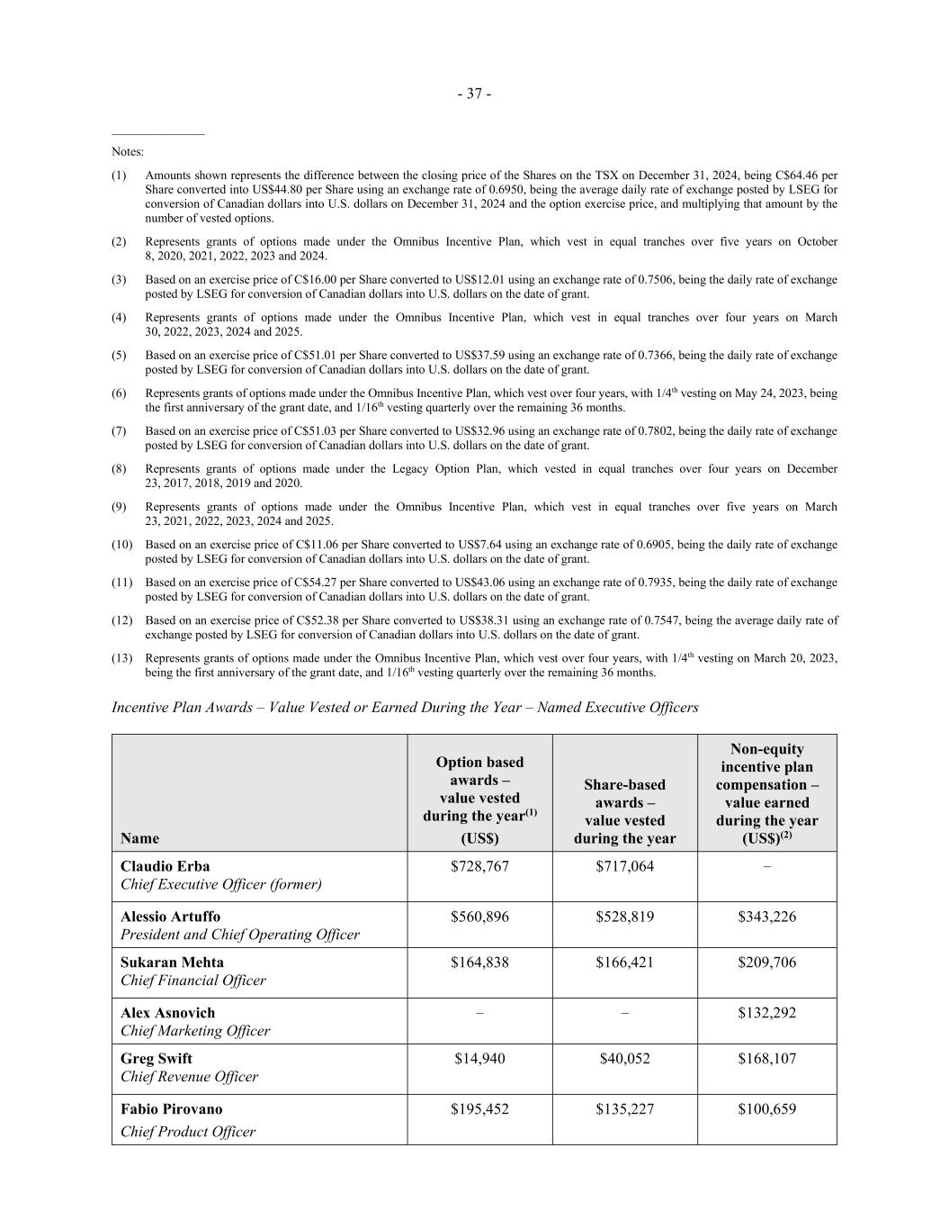 - 37 - _______________ Notes: (1) Amounts shown represents the difference between the closing price of the Shares on the TSX on December 31, 2024, being C$64.46 per Share converted into US$44.80 per Share using an exchange rate of 0.6950, being the average daily rate of exchange posted by LSEG for conversion of Canadian dollars into U.S. dollars on December 31, 2024 and the option exercise price, and multiplying that amount by the number of vested options. (2) Represents grants of options made under the Omnibus Incentive Plan, which vest in equal tranches over five years on October 8, 2020, 2021, 2022, 2023 and 2024. (3) Based on an exercise price of C$16.00 per Share converted to US$12.01 using an exchange rate of 0.7506, being the daily rate of exchange posted by LSEG for conversion of Canadian dollars into U.S. dollars on the date of grant. (4) Represents grants of options made under the Omnibus Incentive Plan, which vest in equal tranches over four years on March 30, 2022, 2023, 2024 and 2025. (5) Based on an exercise price of C$51.01 per Share converted to US$37.59 using an exchange rate of 0.7366, being the daily rate of exchange posted by LSEG for conversion of Canadian dollars into U.S. dollars on the date of grant. (6) Represents grants of options made under the Omnibus Incentive Plan, which vest over four years, with 1/4th vesting on May 24, 2023, being the first anniversary of the grant date, and 1/16th vesting quarterly over the remaining 36 months. (7) Based on an exercise price of C$51.03 per Share converted to US$32.96 using an exchange rate of 0.7802, being the daily rate of exchange posted by LSEG for conversion of Canadian dollars into U.S. dollars on the date of grant. (8) Represents grants of options made under the Legacy Option Plan, which vested in equal tranches over four years on December 23, 2017, 2018, 2019 and 2020. (9) Represents grants of options made under the Omnibus Incentive Plan, which vest in equal tranches over five years on March 23, 2021, 2022, 2023, 2024 and 2025. (10) Based on an exercise price of C$11.06 per Share converted to US$7.64 using an exchange rate of 0.6905, being the daily rate of exchange posted by LSEG for conversion of Canadian dollars into U.S. dollars on the date of grant. (11) Based on an exercise price of C$54.27 per Share converted to US$43.06 using an exchange rate of 0.7935, being the daily rate of exchange posted by LSEG for conversion of Canadian dollars into U.S. dollars on the date of grant. (12) Based on an exercise price of C$52.38 per Share converted to US$38.31 using an exchange rate of 0.7547, being the average daily rate of exchange posted by LSEG for conversion of Canadian dollars into U.S. dollars on the date of grant. (13) Represents grants of options made under the Omnibus Incentive Plan, which vest over four years, with 1/4th vesting on March 20, 2023, being the first anniversary of the grant date, and 1/16th vesting quarterly over the remaining 36 months. Incentive Plan Awards – Value Vested or Earned During the Year – Named Executive Officers Name Option based awards – value vested during the year(1) (US$) Share-based awards – value vested during the year Non-equity incentive plan compensation – value earned during the year (US$)(2) Claudio Erba Chief Executive Officer (former) $728,767 $717,064 – Alessio Artuffo President and Chief Operating Officer $560,896 $528,819 $343,226 Sukaran Mehta Chief Financial Officer $164,838 $166,421 $209,706 Alex Asnovich Chief Marketing Officer – – $132,292 Greg Swift Chief Revenue Officer $14,940 $40,052 $168,107 Fabio Pirovano Chief Product Officer $195,452 $135,227 $100,659
