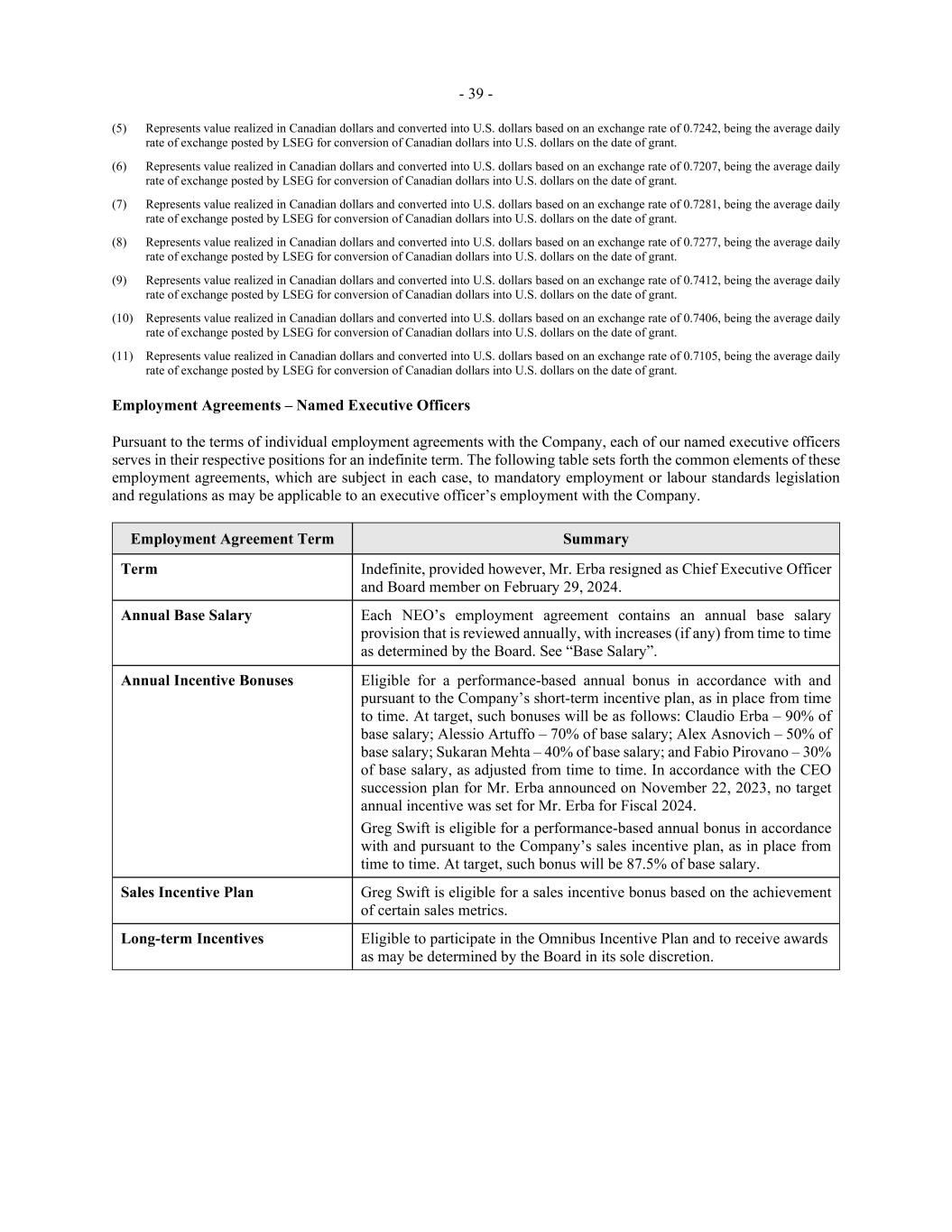 - 39 - (5) Represents value realized in Canadian dollars and converted into U.S. dollars based on an exchange rate of 0.7242, being the average daily rate of exchange posted by LSEG for conversion of Canadian dollars into U.S. dollars on the date of grant. (6) Represents value realized in Canadian dollars and converted into U.S. dollars based on an exchange rate of 0.7207, being the average daily rate of exchange posted by LSEG for conversion of Canadian dollars into U.S. dollars on the date of grant. (7) Represents value realized in Canadian dollars and converted into U.S. dollars based on an exchange rate of 0.7281, being the average daily rate of exchange posted by LSEG for conversion of Canadian dollars into U.S. dollars on the date of grant. (8) Represents value realized in Canadian dollars and converted into U.S. dollars based on an exchange rate of 0.7277, being the average daily rate of exchange posted by LSEG for conversion of Canadian dollars into U.S. dollars on the date of grant. (9) Represents value realized in Canadian dollars and converted into U.S. dollars based on an exchange rate of 0.7412, being the average daily rate of exchange posted by LSEG for conversion of Canadian dollars into U.S. dollars on the date of grant. (10) Represents value realized in Canadian dollars and converted into U.S. dollars based on an exchange rate of 0.7406, being the average daily rate of exchange posted by LSEG for conversion of Canadian dollars into U.S. dollars on the date of grant. (11) Represents value realized in Canadian dollars and converted into U.S. dollars based on an exchange rate of 0.7105, being the average daily rate of exchange posted by LSEG for conversion of Canadian dollars into U.S. dollars on the date of grant. Employment Agreements – Named Executive Officers Pursuant to the terms of individual employment agreements with the Company, each of our named executive officers serves in their respective positions for an indefinite term. The following table sets forth the common elements of these employment agreements, which are subject in each case, to mandatory employment or labour standards legislation and regulations as may be applicable to an executive officer’s employment with the Company. Employment Agreement Term Summary Term Indefinite, provided however, Mr. Erba resigned as Chief Executive Officer and Board member on February 29, 2024. Annual Base Salary Each NEO’s employment agreement contains an annual base salary provision that is reviewed annually, with increases (if any) from time to time as determined by the Board. See “Base Salary”. Annual Incentive Bonuses Eligible for a performance-based annual bonus in accordance with and pursuant to the Company’s short-term incentive plan, as in place from time to time. At target, such bonuses will be as follows: Claudio Erba – 90% of base salary; Alessio Artuffo – 70% of base salary; Alex Asnovich – 50% of base salary; Sukaran Mehta – 40% of base salary; and Fabio Pirovano – 30% of base salary, as adjusted from time to time. In accordance with the CEO succession plan for Mr. Erba announced on November 22, 2023, no target annual incentive was set for Mr. Erba for Fiscal 2024. Greg Swift is eligible for a performance-based annual bonus in accordance with and pursuant to the Company’s sales incentive plan, as in place from time to time. At target, such bonus will be 87.5% of base salary. Sales Incentive Plan Greg Swift is eligible for a sales incentive bonus based on the achievement of certain sales metrics. Long-term Incentives Eligible to participate in the Omnibus Incentive Plan and to receive awards as may be determined by the Board in its sole discretion.