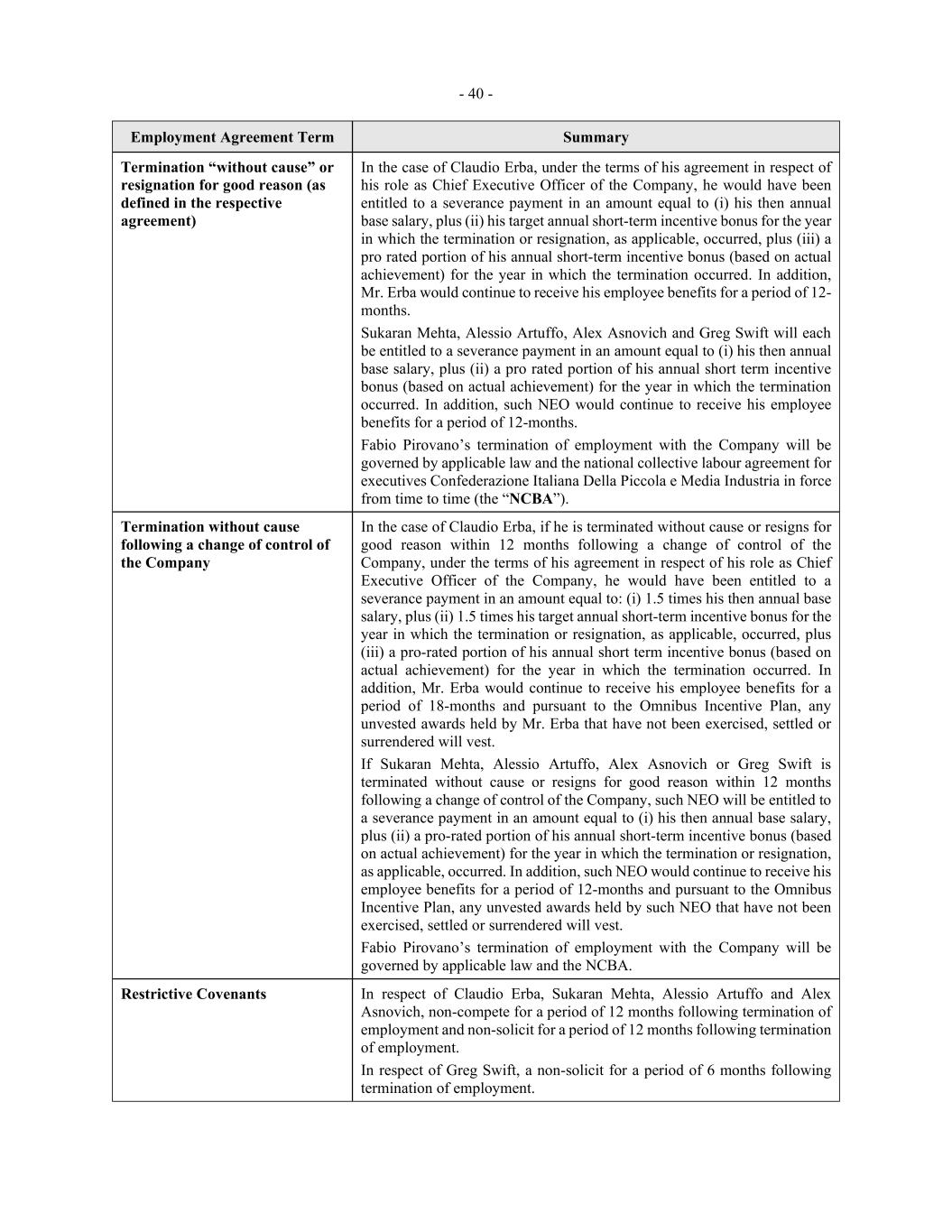 - 40 - Employment Agreement Term Summary Termination “without cause” or resignation for good reason (as defined in the respective agreement) In the case of Claudio Erba, under the terms of his agreement in respect of his role as Chief Executive Officer of the Company, he would have been entitled to a severance payment in an amount equal to (i) his then annual base salary, plus (ii) his target annual short-term incentive bonus for the year in which the termination or resignation, as applicable, occurred, plus (iii) a pro rated portion of his annual short-term incentive bonus (based on actual achievement) for the year in which the termination occurred. In addition, Mr. Erba would continue to receive his employee benefits for a period of 12- months. Sukaran Mehta, Alessio Artuffo, Alex Asnovich and Greg Swift will each be entitled to a severance payment in an amount equal to (i) his then annual base salary, plus (ii) a pro rated portion of his annual short term incentive bonus (based on actual achievement) for the year in which the termination occurred. In addition, such NEO would continue to receive his employee benefits for a period of 12-months. Fabio Pirovano’s termination of employment with the Company will be governed by applicable law and the national collective labour agreement for executives Confederazione Italiana Della Piccola e Media Industria in force from time to time (the “NCBA”). Termination without cause following a change of control of the Company In the case of Claudio Erba, if he is terminated without cause or resigns for good reason within 12 months following a change of control of the Company, under the terms of his agreement in respect of his role as Chief Executive Officer of the Company, he would have been entitled to a severance payment in an amount equal to: (i) 1.5 times his then annual base salary, plus (ii) 1.5 times his target annual short-term incentive bonus for the year in which the termination or resignation, as applicable, occurred, plus (iii) a pro-rated portion of his annual short term incentive bonus (based on actual achievement) for the year in which the termination occurred. In addition, Mr. Erba would continue to receive his employee benefits for a period of 18-months and pursuant to the Omnibus Incentive Plan, any unvested awards held by Mr. Erba that have not been exercised, settled or surrendered will vest. If Sukaran Mehta, Alessio Artuffo, Alex Asnovich or Greg Swift is terminated without cause or resigns for good reason within 12 months following a change of control of the Company, such NEO will be entitled to a severance payment in an amount equal to (i) his then annual base salary, plus (ii) a pro-rated portion of his annual short-term incentive bonus (based on actual achievement) for the year in which the termination or resignation, as applicable, occurred. In addition, such NEO would continue to receive his employee benefits for a period of 12-months and pursuant to the Omnibus Incentive Plan, any unvested awards held by such NEO that have not been exercised, settled or surrendered will vest. Fabio Pirovano’s termination of employment with the Company will be governed by applicable law and the NCBA. Restrictive Covenants In respect of Claudio Erba, Sukaran Mehta, Alessio Artuffo and Alex Asnovich, non-compete for a period of 12 months following termination of employment and non-solicit for a period of 12 months following termination of employment. In respect of Greg Swift, a non-solicit for a period of 6 months following termination of employment.