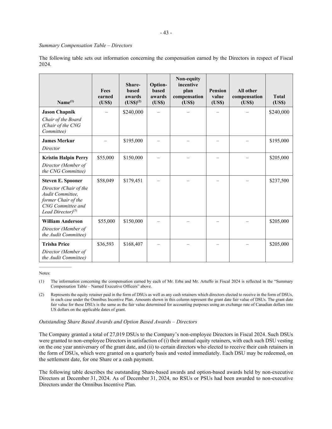 - 43 - Summary Compensation Table – Directors The following table sets out information concerning the compensation earned by the Directors in respect of Fiscal 2024. Name(1) Fees earned (US$) Share- based awards (US$)(2) Option- based awards (US$) Non-equity incentive plan compensation (US$) Pension value (US$) All other compensation (US$) Total (US$) Jason Chapnik Chair of the Board (Chair of the CNG Committee) – $240,000 – – – – $240,000 James Merkur Director – $195,000 – – – – $195,000 Kristin Halpin Perry Director (Member of the CNG Committee) $55,000 $150,000 – – – – $205,000 Steven E. Spooner Director (Chair of the Audit Committee, former Chair of the CNG Committee and Lead Director)(5) $58,049 $179,451 – – – – $237,500 William Anderson Director (Member of the Audit Committee) $55,000 $150,000 – – – – $205,000 Trisha Price Director (Member of the Audit Committee) $36,593 $168,407 – – – – $205,000 _______________ Notes: (1) The information concerning the compensation earned by each of Mr. Erba and Mr. Artuffo in Fiscal 2024 is reflected in the “Summary Compensation Table – Named Executive Officers” above. (2) Represents the equity retainer paid in the form of DSUs as well as any cash retainers which directors elected to receive in the form of DSUs, in each case under the Omnibus Incentive Plan. Amounts shown in this column represent the grant date fair value of DSUs. The grant date fair value for these DSUs is the same as the fair value determined for accounting purposes using an exchange rate of Canadian dollars into US dollars on the applicable dates of grant. Outstanding Share Based Awards and Option Based Awards – Directors The Company granted a total of 27,019 DSUs to the Company’s non-employee Directors in Fiscal 2024. Such DSUs were granted to non-employee Directors in satisfaction of (i) their annual equity retainers, with each such DSU vesting on the one year anniversary of the grant date, and (ii) to certain directors who elected to receive their cash retainers in the form of DSUs, which were granted on a quarterly basis and vested immediately. Each DSU may be redeemed, on the settlement date, for one Share or a cash payment. The following table describes the outstanding Share-based awards and option-based awards held by non-executive Directors at December 31, 2024. As of December 31, 2024, no RSUs or PSUs had been awarded to non-executive Directors under the Omnibus Incentive Plan.