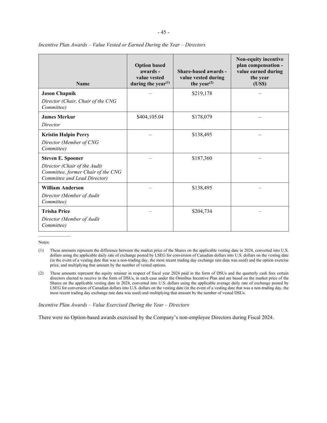 - 45 - Incentive Plan Awards – Value Vested or Earned During the Year – Directors Name Option based awards - value vested during the year(1) Share-based awards - value vested during the year(2) Non-equity incentive plan compensation - value earned during the year (US$) Jason Chapnik Director (Chair, Chair of the CNG Committee) – $219,178 – James Merkur Director $404,105.04 $178,079 – Kristin Halpin Perry Director (Member of CNG Committee) – $138,495 – Steven E. Spooner Director (Chair of the Audit Committee, former Chair of the CNG Committee and Lead Director) – $187,360 – William Anderson Director (Member of Audit Committee) – $138,495 – Trisha Price Director (Member of Audit Committee) – $204,734 – _______________ Notes: (1) These amounts represent the difference between the market price of the Shares on the applicable vesting date in 2024, converted into U.S. dollars using the applicable daily rate of exchange posted by LSEG for conversion of Canadian dollars into U.S. dollars on the vesting date (in the event of a vesting date that was a non-trading day, the most recent trading day exchange rate data was used) and the option exercise price, and multiplying that amount by the number of vested options. (2) These amounts represent the equity retainer in respect of fiscal year 2024 paid in the form of DSUs and the quarterly cash fees certain directors elected to receive in the form of DSUs, in each case under the Omnibus Incentive Plan and are based on the market price of the Shares on the applicable vesting date in 2024, converted into U.S. dollars using the applicable average daily rate of exchange posted by LSEG for conversion of Canadian dollars into U.S. dollars on the vesting date (in the event of a vesting date that was a non-trading day, the most recent trading day exchange rate data was used) and multiplying that amount by the number of vested DSUs. Incentive Plan Awards – Value Exercised During the Year – Directors There were no Option-based awards exercised by the Company’s non-employee Directors during Fiscal 2024.