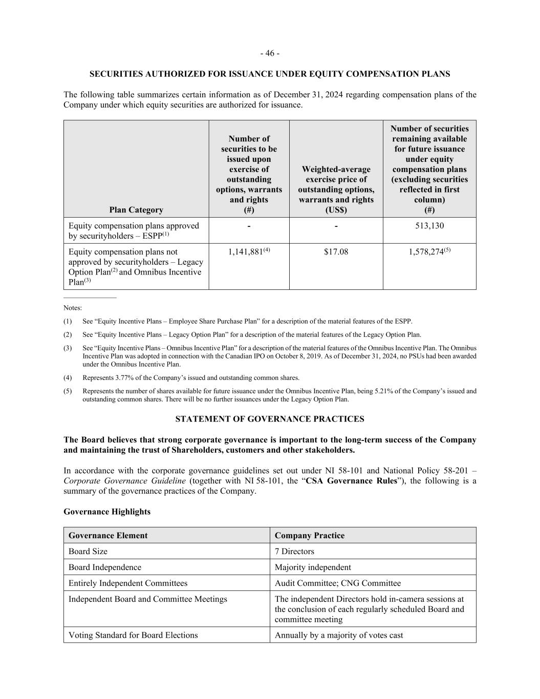 - 46 - SECURITIES AUTHORIZED FOR ISSUANCE UNDER EQUITY COMPENSATION PLANS The following table summarizes certain information as of December 31, 2024 regarding compensation plans of the Company under which equity securities are authorized for issuance. Plan Category Number of securities to be issued upon exercise of outstanding options, warrants and rights (#) Weighted-average exercise price of outstanding options, warrants and rights (US$) Number of securities remaining available for future issuance under equity compensation plans (excluding securities reflected in first column) (#) Equity compensation plans approved by securityholders – ESPP(1) - - 513,130 Equity compensation plans not approved by securityholders – Legacy Option Plan(2) and Omnibus Incentive Plan(3) 1,141,881(4) $17.08 1,578,274(5) _______________ Notes: (1) See “Equity Incentive Plans – Employee Share Purchase Plan” for a description of the material features of the ESPP. (2) See “Equity Incentive Plans – Legacy Option Plan” for a description of the material features of the Legacy Option Plan. (3) See “Equity Incentive Plans – Omnibus Incentive Plan” for a description of the material features of the Omnibus Incentive Plan. The Omnibus Incentive Plan was adopted in connection with the Canadian IPO on October 8, 2019. As of December 31, 2024, no PSUs had been awarded under the Omnibus Incentive Plan. (4) Represents 3.77% of the Company’s issued and outstanding common shares. (5) Represents the number of shares available for future issuance under the Omnibus Incentive Plan, being 5.21% of the Company’s issued and outstanding common shares. There will be no further issuances under the Legacy Option Plan. STATEMENT OF GOVERNANCE PRACTICES The Board believes that strong corporate governance is important to the long-term success of the Company and maintaining the trust of Shareholders, customers and other stakeholders. In accordance with the corporate governance guidelines set out under NI 58-101 and National Policy 58-201 – Corporate Governance Guideline (together with NI 58-101, the “CSA Governance Rules”), the following is a summary of the governance practices of the Company. Governance Highlights Governance Element Company Practice Board Size 7 Directors Board Independence Majority independent Entirely Independent Committees Audit Committee; CNG Committee Independent Board and Committee Meetings The independent Directors hold in-camera sessions at the conclusion of each regularly scheduled Board and committee meeting Voting Standard for Board Elections Annually by a majority of votes cast