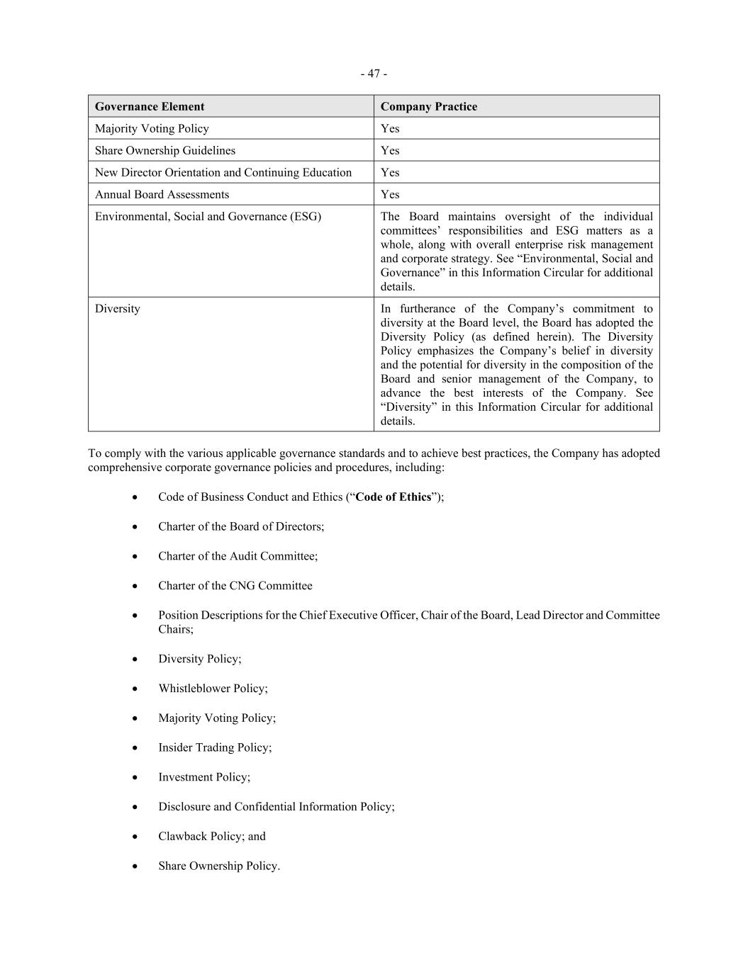 - 47 - Governance Element Company Practice Majority Voting Policy Yes Share Ownership Guidelines Yes New Director Orientation and Continuing Education Yes Annual Board Assessments Yes Environmental, Social and Governance (ESG) The Board maintains oversight of the individual committees’ responsibilities and ESG matters as a whole, along with overall enterprise risk management and corporate strategy. See “Environmental, Social and Governance” in this Information Circular for additional details. Diversity In furtherance of the Company’s commitment to diversity at the Board level, the Board has adopted the Diversity Policy (as defined herein). The Diversity Policy emphasizes the Company’s belief in diversity and the potential for diversity in the composition of the Board and senior management of the Company, to advance the best interests of the Company. See “Diversity” in this Information Circular for additional details. To comply with the various applicable governance standards and to achieve best practices, the Company has adopted comprehensive corporate governance policies and procedures, including: • Code of Business Conduct and Ethics (“Code of Ethics”); • Charter of the Board of Directors; • Charter of the Audit Committee; • Charter of the CNG Committee • Position Descriptions for the Chief Executive Officer, Chair of the Board, Lead Director and Committee Chairs; • Diversity Policy; • Whistleblower Policy; • Majority Voting Policy; • Insider Trading Policy; • Investment Policy; • Disclosure and Confidential Information Policy; • Clawback Policy; and • Share Ownership Policy.