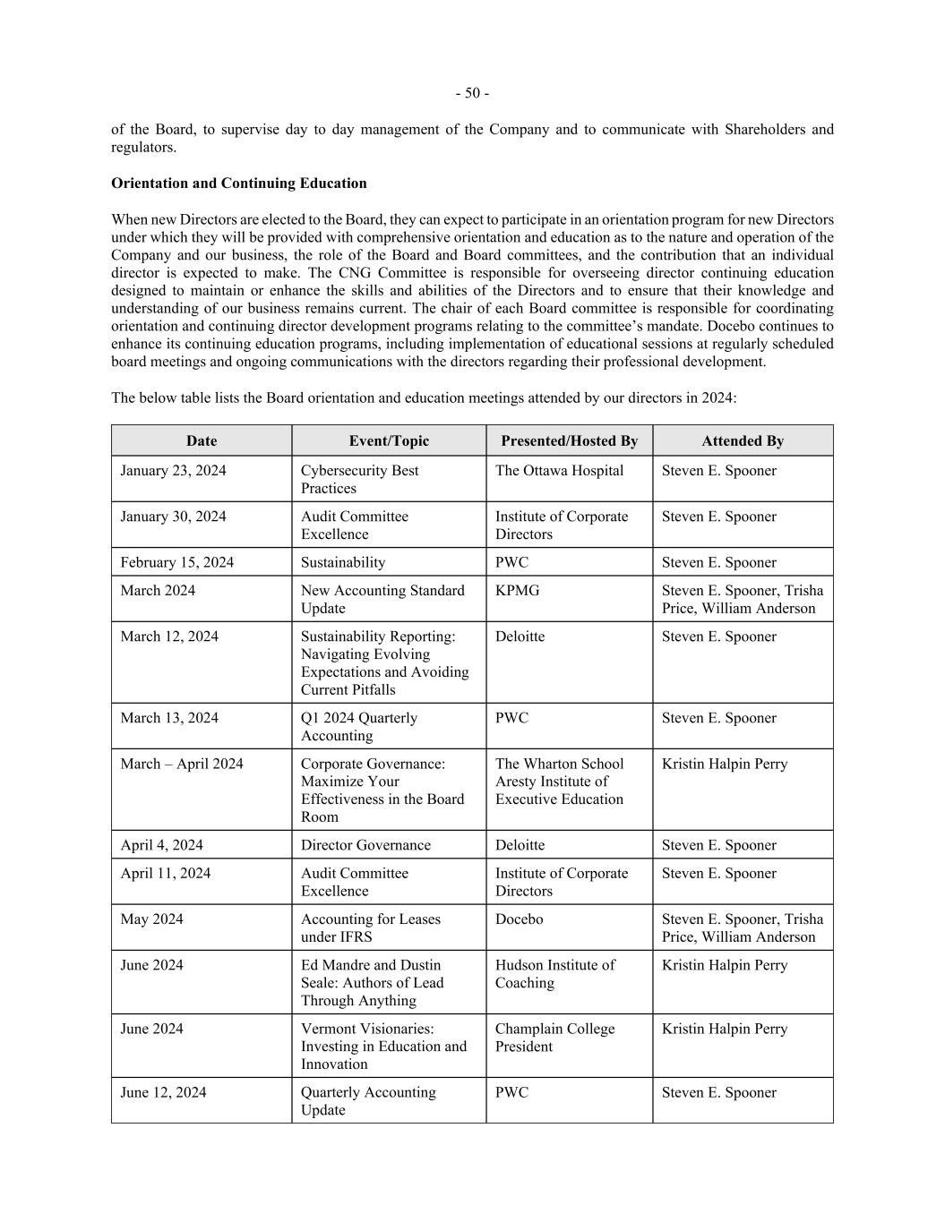 - 50 - of the Board, to supervise day to day management of the Company and to communicate with Shareholders and regulators. Orientation and Continuing Education When new Directors are elected to the Board, they can expect to participate in an orientation program for new Directors under which they will be provided with comprehensive orientation and education as to the nature and operation of the Company and our business, the role of the Board and Board committees, and the contribution that an individual director is expected to make. The CNG Committee is responsible for overseeing director continuing education designed to maintain or enhance the skills and abilities of the Directors and to ensure that their knowledge and understanding of our business remains current. The chair of each Board committee is responsible for coordinating orientation and continuing director development programs relating to the committee’s mandate. Docebo continues to enhance its continuing education programs, including implementation of educational sessions at regularly scheduled board meetings and ongoing communications with the directors regarding their professional development. The below table lists the Board orientation and education meetings attended by our directors in 2024: Date Event/Topic Presented/Hosted By Attended By January 23, 2024 Cybersecurity Best Practices The Ottawa Hospital Steven E. Spooner January 30, 2024 Audit Committee Excellence Institute of Corporate Directors Steven E. Spooner February 15, 2024 Sustainability PWC Steven E. Spooner March 2024 New Accounting Standard Update KPMG Steven E. Spooner, Trisha Price, William Anderson March 12, 2024 Sustainability Reporting: Navigating Evolving Expectations and Avoiding Current Pitfalls Deloitte Steven E. Spooner March 13, 2024 Q1 2024 Quarterly Accounting PWC Steven E. Spooner March – April 2024 Corporate Governance: Maximize Your Effectiveness in the Board Room The Wharton School Aresty Institute of Executive Education Kristin Halpin Perry April 4, 2024 Director Governance Deloitte Steven E. Spooner April 11, 2024 Audit Committee Excellence Institute of Corporate Directors Steven E. Spooner May 2024 Accounting for Leases under IFRS Docebo Steven E. Spooner, Trisha Price, William Anderson June 2024 Ed Mandre and Dustin Seale: Authors of Lead Through Anything Hudson Institute of Coaching Kristin Halpin Perry June 2024 Vermont Visionaries: Investing in Education and Innovation Champlain College President Kristin Halpin Perry June 12, 2024 Quarterly Accounting Update PWC Steven E. Spooner