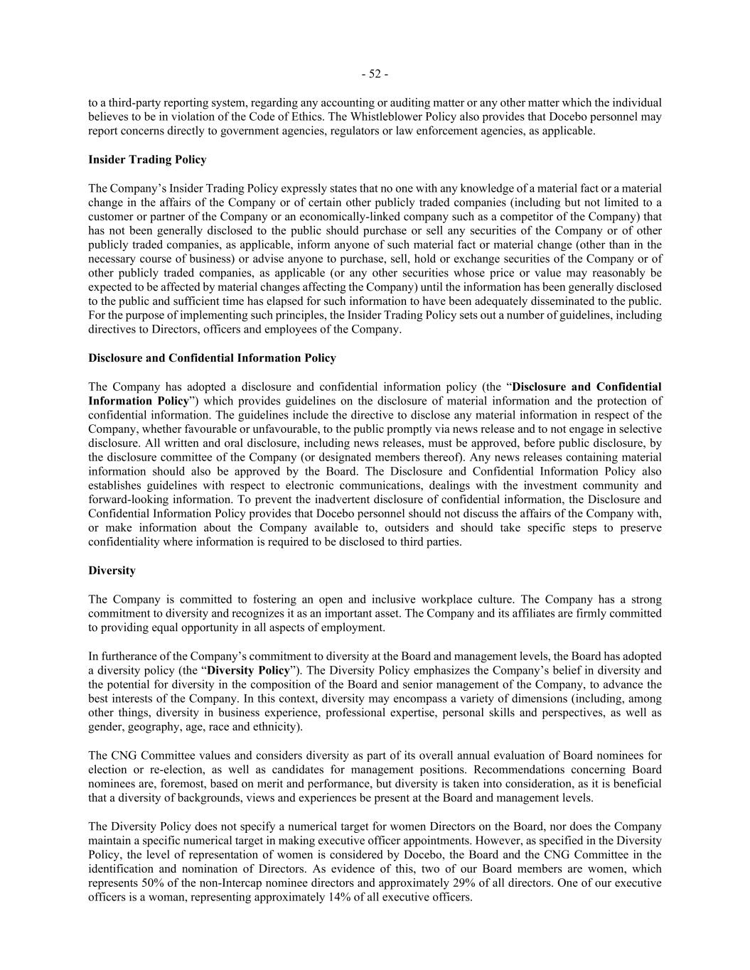 - 52 - to a third-party reporting system, regarding any accounting or auditing matter or any other matter which the individual believes to be in violation of the Code of Ethics. The Whistleblower Policy also provides that Docebo personnel may report concerns directly to government agencies, regulators or law enforcement agencies, as applicable. Insider Trading Policy The Company’s Insider Trading Policy expressly states that no one with any knowledge of a material fact or a material change in the affairs of the Company or of certain other publicly traded companies (including but not limited to a customer or partner of the Company or an economically-linked company such as a competitor of the Company) that has not been generally disclosed to the public should purchase or sell any securities of the Company or of other publicly traded companies, as applicable, inform anyone of such material fact or material change (other than in the necessary course of business) or advise anyone to purchase, sell, hold or exchange securities of the Company or of other publicly traded companies, as applicable (or any other securities whose price or value may reasonably be expected to be affected by material changes affecting the Company) until the information has been generally disclosed to the public and sufficient time has elapsed for such information to have been adequately disseminated to the public. For the purpose of implementing such principles, the Insider Trading Policy sets out a number of guidelines, including directives to Directors, officers and employees of the Company. Disclosure and Confidential Information Policy The Company has adopted a disclosure and confidential information policy (the “Disclosure and Confidential Information Policy”) which provides guidelines on the disclosure of material information and the protection of confidential information. The guidelines include the directive to disclose any material information in respect of the Company, whether favourable or unfavourable, to the public promptly via news release and to not engage in selective disclosure. All written and oral disclosure, including news releases, must be approved, before public disclosure, by the disclosure committee of the Company (or designated members thereof). Any news releases containing material information should also be approved by the Board. The Disclosure and Confidential Information Policy also establishes guidelines with respect to electronic communications, dealings with the investment community and forward-looking information. To prevent the inadvertent disclosure of confidential information, the Disclosure and Confidential Information Policy provides that Docebo personnel should not discuss the affairs of the Company with, or make information about the Company available to, outsiders and should take specific steps to preserve confidentiality where information is required to be disclosed to third parties. Diversity The Company is committed to fostering an open and inclusive workplace culture. The Company has a strong commitment to diversity and recognizes it as an important asset. The Company and its affiliates are firmly committed to providing equal opportunity in all aspects of employment. In furtherance of the Company’s commitment to diversity at the Board and management levels, the Board has adopted a diversity policy (the “Diversity Policy”). The Diversity Policy emphasizes the Company’s belief in diversity and the potential for diversity in the composition of the Board and senior management of the Company, to advance the best interests of the Company. In this context, diversity may encompass a variety of dimensions (including, among other things, diversity in business experience, professional expertise, personal skills and perspectives, as well as gender, geography, age, race and ethnicity). The CNG Committee values and considers diversity as part of its overall annual evaluation of Board nominees for election or re-election, as well as candidates for management positions. Recommendations concerning Board nominees are, foremost, based on merit and performance, but diversity is taken into consideration, as it is beneficial that a diversity of backgrounds, views and experiences be present at the Board and management levels. The Diversity Policy does not specify a numerical target for women Directors on the Board, nor does the Company maintain a specific numerical target in making executive officer appointments. However, as specified in the Diversity Policy, the level of representation of women is considered by Docebo, the Board and the CNG Committee in the identification and nomination of Directors. As evidence of this, two of our Board members are women, which represents 50% of the non-Intercap nominee directors and approximately 29% of all directors. One of our executive officers is a woman, representing approximately 14% of all executive officers.