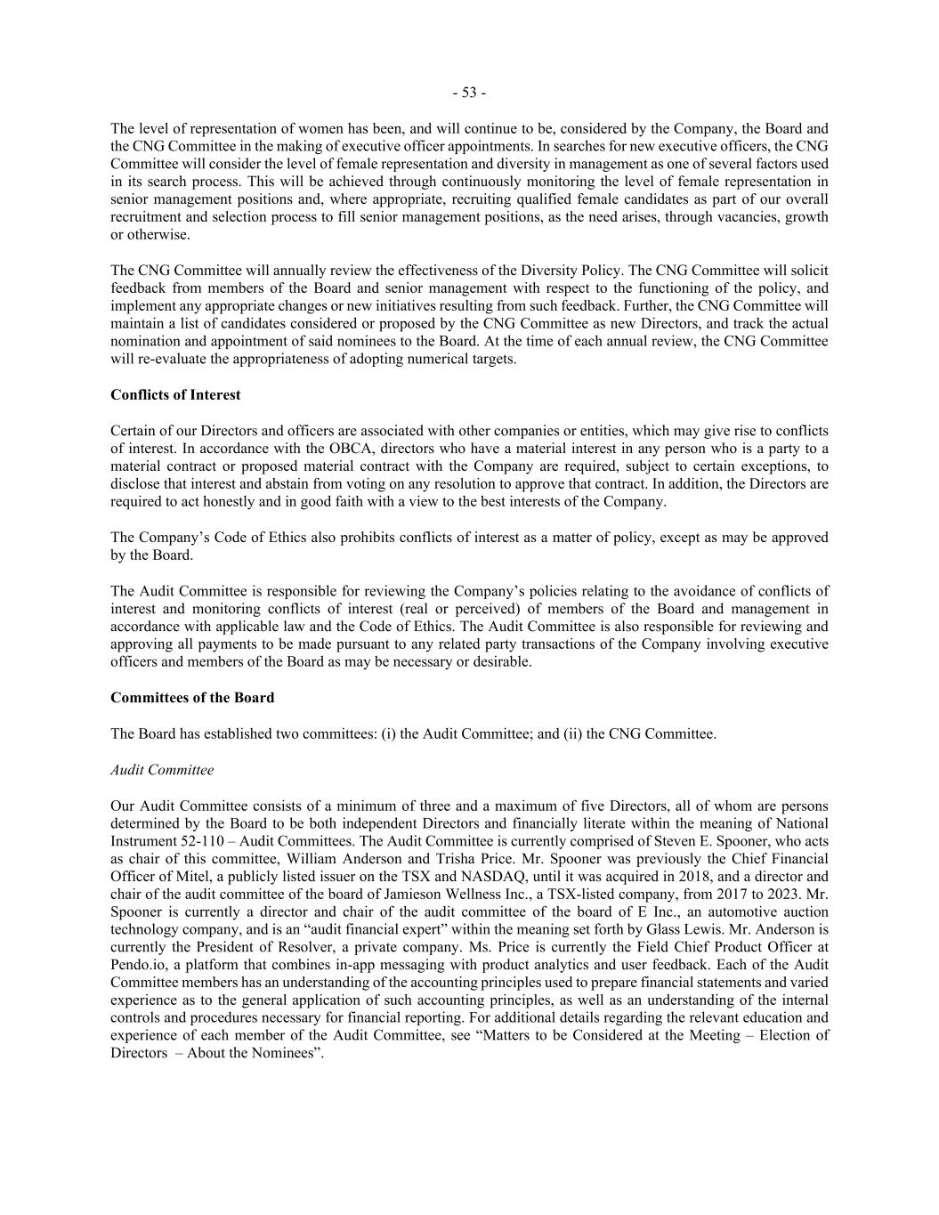 - 53 - The level of representation of women has been, and will continue to be, considered by the Company, the Board and the CNG Committee in the making of executive officer appointments. In searches for new executive officers, the CNG Committee will consider the level of female representation and diversity in management as one of several factors used in its search process. This will be achieved through continuously monitoring the level of female representation in senior management positions and, where appropriate, recruiting qualified female candidates as part of our overall recruitment and selection process to fill senior management positions, as the need arises, through vacancies, growth or otherwise. The CNG Committee will annually review the effectiveness of the Diversity Policy. The CNG Committee will solicit feedback from members of the Board and senior management with respect to the functioning of the policy, and implement any appropriate changes or new initiatives resulting from such feedback. Further, the CNG Committee will maintain a list of candidates considered or proposed by the CNG Committee as new Directors, and track the actual nomination and appointment of said nominees to the Board. At the time of each annual review, the CNG Committee will re-evaluate the appropriateness of adopting numerical targets. Conflicts of Interest Certain of our Directors and officers are associated with other companies or entities, which may give rise to conflicts of interest. In accordance with the OBCA, directors who have a material interest in any person who is a party to a material contract or proposed material contract with the Company are required, subject to certain exceptions, to disclose that interest and abstain from voting on any resolution to approve that contract. In addition, the Directors are required to act honestly and in good faith with a view to the best interests of the Company. The Company’s Code of Ethics also prohibits conflicts of interest as a matter of policy, except as may be approved by the Board. The Audit Committee is responsible for reviewing the Company’s policies relating to the avoidance of conflicts of interest and monitoring conflicts of interest (real or perceived) of members of the Board and management in accordance with applicable law and the Code of Ethics. The Audit Committee is also responsible for reviewing and approving all payments to be made pursuant to any related party transactions of the Company involving executive officers and members of the Board as may be necessary or desirable. Committees of the Board The Board has established two committees: (i) the Audit Committee; and (ii) the CNG Committee. Audit Committee Our Audit Committee consists of a minimum of three and a maximum of five Directors, all of whom are persons determined by the Board to be both independent Directors and financially literate within the meaning of National Instrument 52-110 – Audit Committees. The Audit Committee is currently comprised of Steven E. Spooner, who acts as chair of this committee, William Anderson and Trisha Price. Mr. Spooner was previously the Chief Financial Officer of Mitel, a publicly listed issuer on the TSX and NASDAQ, until it was acquired in 2018, and a director and chair of the audit committee of the board of Jamieson Wellness Inc., a TSX-listed company, from 2017 to 2023. Mr. Spooner is currently a director and chair of the audit committee of the board of E Inc., an automotive auction technology company, and is an “audit financial expert” within the meaning set forth by Glass Lewis. Mr. Anderson is currently the President of Resolver, a private company. Ms. Price is currently the Field Chief Product Officer at Pendo.io, a platform that combines in-app messaging with product analytics and user feedback. Each of the Audit Committee members has an understanding of the accounting principles used to prepare financial statements and varied experience as to the general application of such accounting principles, as well as an understanding of the internal controls and procedures necessary for financial reporting. For additional details regarding the relevant education and experience of each member of the Audit Committee, see “Matters to be Considered at the Meeting – Election of Directors – About the Nominees”.