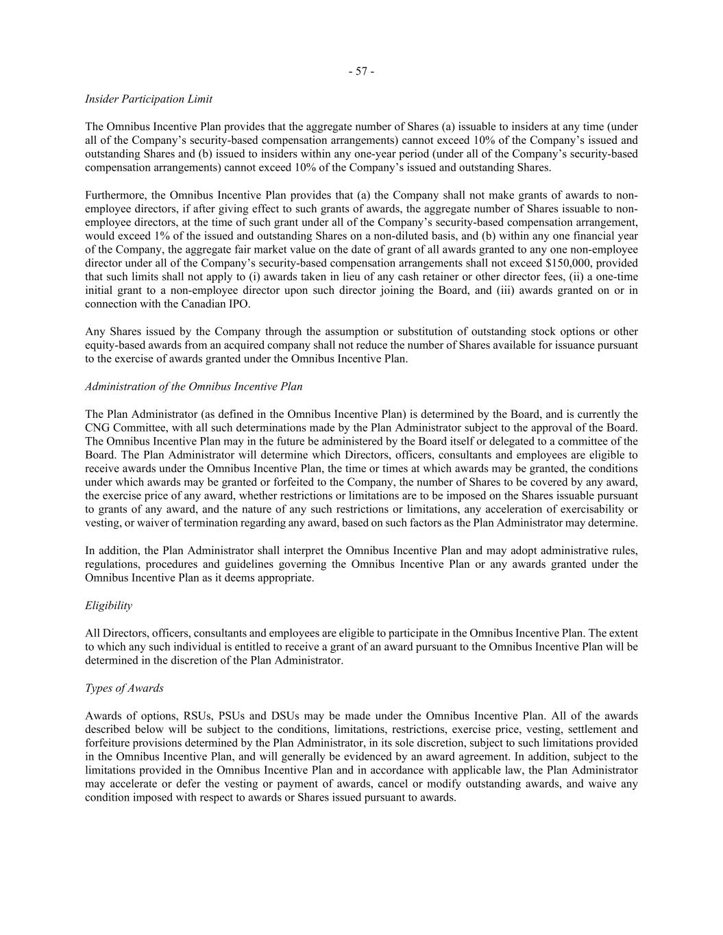 - 57 - Insider Participation Limit The Omnibus Incentive Plan provides that the aggregate number of Shares (a) issuable to insiders at any time (under all of the Company’s security-based compensation arrangements) cannot exceed 10% of the Company’s issued and outstanding Shares and (b) issued to insiders within any one-year period (under all of the Company’s security-based compensation arrangements) cannot exceed 10% of the Company’s issued and outstanding Shares. Furthermore, the Omnibus Incentive Plan provides that (a) the Company shall not make grants of awards to non- employee directors, if after giving effect to such grants of awards, the aggregate number of Shares issuable to non- employee directors, at the time of such grant under all of the Company’s security-based compensation arrangement, would exceed 1% of the issued and outstanding Shares on a non-diluted basis, and (b) within any one financial year of the Company, the aggregate fair market value on the date of grant of all awards granted to any one non-employee director under all of the Company’s security-based compensation arrangements shall not exceed $150,000, provided that such limits shall not apply to (i) awards taken in lieu of any cash retainer or other director fees, (ii) a one-time initial grant to a non-employee director upon such director joining the Board, and (iii) awards granted on or in connection with the Canadian IPO. Any Shares issued by the Company through the assumption or substitution of outstanding stock options or other equity-based awards from an acquired company shall not reduce the number of Shares available for issuance pursuant to the exercise of awards granted under the Omnibus Incentive Plan. Administration of the Omnibus Incentive Plan The Plan Administrator (as defined in the Omnibus Incentive Plan) is determined by the Board, and is currently the CNG Committee, with all such determinations made by the Plan Administrator subject to the approval of the Board. The Omnibus Incentive Plan may in the future be administered by the Board itself or delegated to a committee of the Board. The Plan Administrator will determine which Directors, officers, consultants and employees are eligible to receive awards under the Omnibus Incentive Plan, the time or times at which awards may be granted, the conditions under which awards may be granted or forfeited to the Company, the number of Shares to be covered by any award, the exercise price of any award, whether restrictions or limitations are to be imposed on the Shares issuable pursuant to grants of any award, and the nature of any such restrictions or limitations, any acceleration of exercisability or vesting, or waiver of termination regarding any award, based on such factors as the Plan Administrator may determine. In addition, the Plan Administrator shall interpret the Omnibus Incentive Plan and may adopt administrative rules, regulations, procedures and guidelines governing the Omnibus Incentive Plan or any awards granted under the Omnibus Incentive Plan as it deems appropriate. Eligibility All Directors, officers, consultants and employees are eligible to participate in the Omnibus Incentive Plan. The extent to which any such individual is entitled to receive a grant of an award pursuant to the Omnibus Incentive Plan will be determined in the discretion of the Plan Administrator. Types of Awards Awards of options, RSUs, PSUs and DSUs may be made under the Omnibus Incentive Plan. All of the awards described below will be subject to the conditions, limitations, restrictions, exercise price, vesting, settlement and forfeiture provisions determined by the Plan Administrator, in its sole discretion, subject to such limitations provided in the Omnibus Incentive Plan, and will generally be evidenced by an award agreement. In addition, subject to the limitations provided in the Omnibus Incentive Plan and in accordance with applicable law, the Plan Administrator may accelerate or defer the vesting or payment of awards, cancel or modify outstanding awards, and waive any condition imposed with respect to awards or Shares issued pursuant to awards.