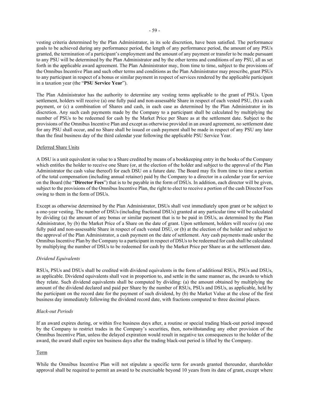 - 59 - vesting criteria determined by the Plan Administrator, in its sole discretion, have been satisfied. The performance goals to be achieved during any performance period, the length of any performance period, the amount of any PSUs granted, the termination of a participant’s employment and the amount of any payment or transfer to be made pursuant to any PSU will be determined by the Plan Administrator and by the other terms and conditions of any PSU, all as set forth in the applicable award agreement. The Plan Administrator may, from time to time, subject to the provisions of the Omnibus Incentive Plan and such other terms and conditions as the Plan Administrator may prescribe, grant PSUs to any participant in respect of a bonus or similar payment in respect of services rendered by the applicable participant in a taxation year (the “PSU Service Year”). The Plan Administrator has the authority to determine any vesting terms applicable to the grant of PSUs. Upon settlement, holders will receive (a) one fully paid and non-assessable Share in respect of each vested PSU, (b) a cash payment, or (c) a combination of Shares and cash, in each case as determined by the Plan Administrator in its discretion. Any such cash payments made by the Company to a participant shall be calculated by multiplying the number of PSUs to be redeemed for cash by the Market Price per Share as at the settlement date. Subject to the provisions of the Omnibus Incentive Plan and except as otherwise provided in an award agreement, no settlement date for any PSU shall occur, and no Share shall be issued or cash payment shall be made in respect of any PSU any later than the final business day of the third calendar year following the applicable PSU Service Year. Deferred Share Units A DSU is a unit equivalent in value to a Share credited by means of a bookkeeping entry in the books of the Company which entitles the holder to receive one Share (or, at the election of the holder and subject to the approval of the Plan Administrator the cash value thereof) for each DSU on a future date. The Board may fix from time to time a portion of the total compensation (including annual retainer) paid by the Company to a director in a calendar year for service on the Board (the “Director Fees”) that is to be payable in the form of DSUs. In addition, each director will be given, subject to the provisions of the Omnibus Incentive Plan, the right to elect to receive a portion of the cash Director Fees owing to them in the form of DSUs. Except as otherwise determined by the Plan Administrator, DSUs shall vest immediately upon grant or be subject to a one-year vesting. The number of DSUs (including fractional DSUs) granted at any particular time will be calculated by dividing (a) the amount of any bonus or similar payment that is to be paid in DSUs, as determined by the Plan Administrator, by (b) the Market Price of a Share on the date of grant. Upon settlement, holders will receive (a) one fully paid and non-assessable Share in respect of each vested DSU, or (b) at the election of the holder and subject to the approval of the Plan Administrator, a cash payment on the date of settlement. Any cash payments made under the Omnibus Incentive Plan by the Company to a participant in respect of DSUs to be redeemed for cash shall be calculated by multiplying the number of DSUs to be redeemed for cash by the Market Price per Share as at the settlement date. Dividend Equivalents RSUs, PSUs and DSUs shall be credited with dividend equivalents in the form of additional RSUs, PSUs and DSUs, as applicable. Dividend equivalents shall vest in proportion to, and settle in the same manner as, the awards to which they relate. Such dividend equivalents shall be computed by dividing: (a) the amount obtained by multiplying the amount of the dividend declared and paid per Share by the number of RSUs, PSUs and DSUs, as applicable, held by the participant on the record date for the payment of such dividend, by (b) the Market Value at the close of the first business day immediately following the dividend record date, with fractions computed to three decimal places. Black-out Periods If an award expires during, or within five business days after, a routine or special trading black-out period imposed by the Company to restrict trades in the Company’s securities, then, notwithstanding any other provision of the Omnibus Incentive Plan, unless the delayed expiration would result in negative tax consequences to the holder of the award, the award shall expire ten business days after the trading black-out period is lifted by the Company. Term While the Omnibus Incentive Plan will not stipulate a specific term for awards granted thereunder, shareholder approval shall be required to permit an award to be exercisable beyond 10 years from its date of grant, except where