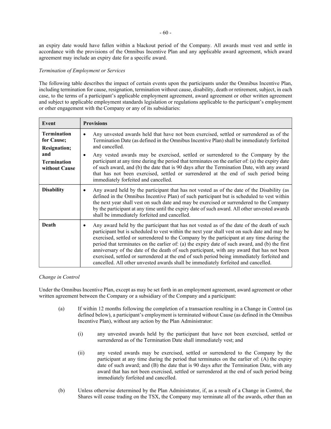 - 60 - an expiry date would have fallen within a blackout period of the Company. All awards must vest and settle in accordance with the provisions of the Omnibus Incentive Plan and any applicable award agreement, which award agreement may include an expiry date for a specific award. Termination of Employment or Services The following table describes the impact of certain events upon the participants under the Omnibus Incentive Plan, including termination for cause, resignation, termination without cause, disability, death or retirement, subject, in each case, to the terms of a participant’s applicable employment agreement, award agreement or other written agreement and subject to applicable employment standards legislation or regulations applicable to the participant’s employment or other engagement with the Company or any of its subsidiaries: Event Provisions Termination for Cause; Resignation; and Termination without Cause • Any unvested awards held that have not been exercised, settled or surrendered as of the Termination Date (as defined in the Omnibus Incentive Plan) shall be immediately forfeited and cancelled. • Any vested awards may be exercised, settled or surrendered to the Company by the participant at any time during the period that terminates on the earlier of: (a) the expiry date of such award, and (b) the date that is 90 days after the Termination Date, with any award that has not been exercised, settled or surrendered at the end of such period being immediately forfeited and cancelled. Disability • Any award held by the participant that has not vested as of the date of the Disability (as defined in the Omnibus Incentive Plan) of such participant but is scheduled to vest within the next year shall vest on such date and may be exercised or surrendered to the Company by the participant at any time until the expiry date of such award. All other unvested awards shall be immediately forfeited and cancelled. Death • Any award held by the participant that has not vested as of the date of the death of such participant but is scheduled to vest within the next year shall vest on such date and may be exercised, settled or surrendered to the Company by the participant at any time during the period that terminates on the earlier of: (a) the expiry date of such award, and (b) the first anniversary of the date of the death of such participant, with any award that has not been exercised, settled or surrendered at the end of such period being immediately forfeited and cancelled. All other unvested awards shall be immediately forfeited and cancelled. Change in Control Under the Omnibus Incentive Plan, except as may be set forth in an employment agreement, award agreement or other written agreement between the Company or a subsidiary of the Company and a participant: (a) If within 12 months following the completion of a transaction resulting in a Change in Control (as defined below), a participant’s employment is terminated without Cause (as defined in the Omnibus Incentive Plan), without any action by the Plan Administrator: (i) any unvested awards held by the participant that have not been exercised, settled or surrendered as of the Termination Date shall immediately vest; and (ii) any vested awards may be exercised, settled or surrendered to the Company by the participant at any time during the period that terminates on the earlier of: (A) the expiry date of such award; and (B) the date that is 90 days after the Termination Date, with any award that has not been exercised, settled or surrendered at the end of such period being immediately forfeited and cancelled. (b) Unless otherwise determined by the Plan Administrator, if, as a result of a Change in Control, the Shares will cease trading on the TSX, the Company may terminate all of the awards, other than an