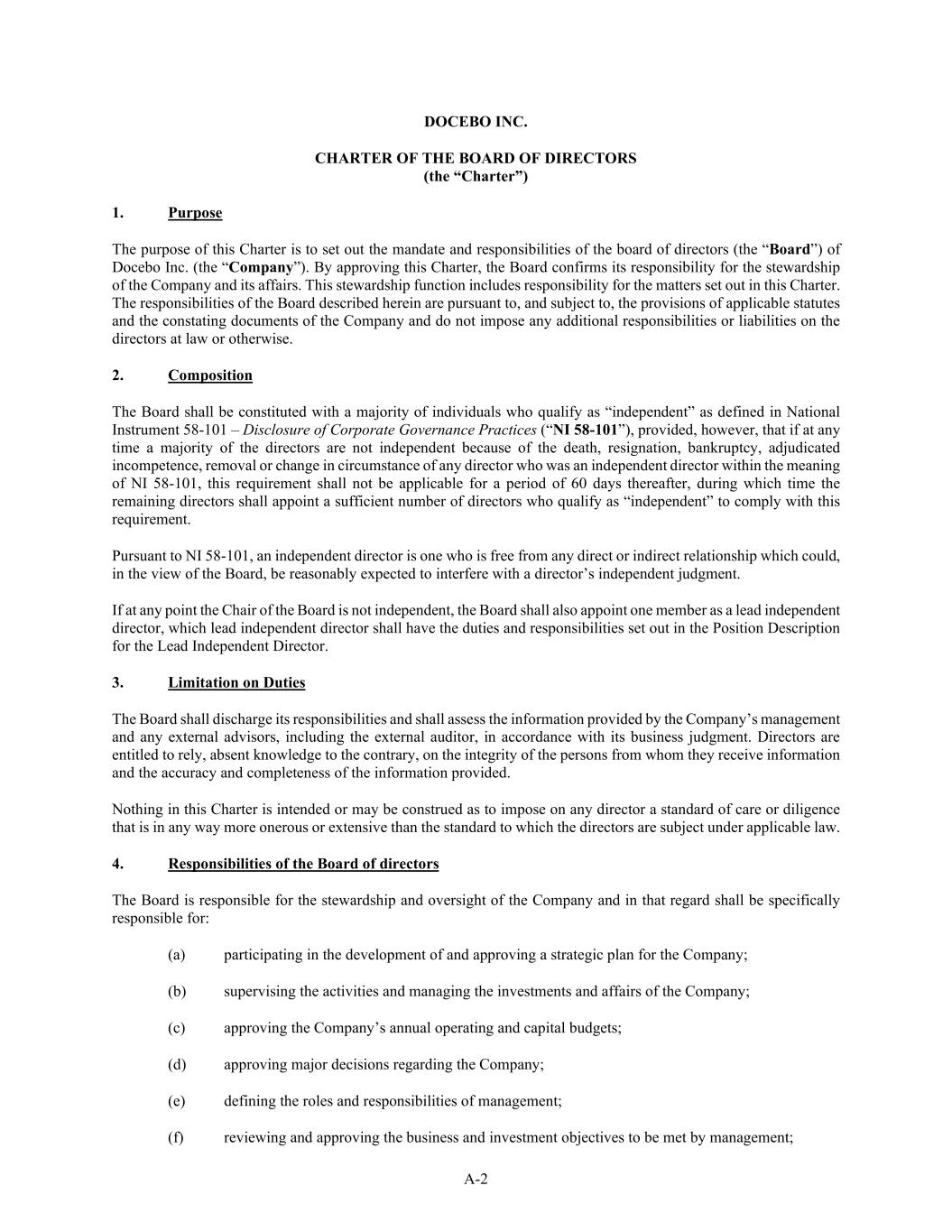 A-2 DOCEBO INC. CHARTER OF THE BOARD OF DIRECTORS (the “Charter”) 1. Purpose The purpose of this Charter is to set out the mandate and responsibilities of the board of directors (the “Board”) of Docebo Inc. (the “Company”). By approving this Charter, the Board confirms its responsibility for the stewardship of the Company and its affairs. This stewardship function includes responsibility for the matters set out in this Charter. The responsibilities of the Board described herein are pursuant to, and subject to, the provisions of applicable statutes and the constating documents of the Company and do not impose any additional responsibilities or liabilities on the directors at law or otherwise. 2. Composition The Board shall be constituted with a majority of individuals who qualify as “independent” as defined in National Instrument 58-101 – Disclosure of Corporate Governance Practices (“NI 58-101”), provided, however, that if at any time a majority of the directors are not independent because of the death, resignation, bankruptcy, adjudicated incompetence, removal or change in circumstance of any director who was an independent director within the meaning of NI 58-101, this requirement shall not be applicable for a period of 60 days thereafter, during which time the remaining directors shall appoint a sufficient number of directors who qualify as “independent” to comply with this requirement. Pursuant to NI 58-101, an independent director is one who is free from any direct or indirect relationship which could, in the view of the Board, be reasonably expected to interfere with a director’s independent judgment. If at any point the Chair of the Board is not independent, the Board shall also appoint one member as a lead independent director, which lead independent director shall have the duties and responsibilities set out in the Position Description for the Lead Independent Director. 3. Limitation on Duties The Board shall discharge its responsibilities and shall assess the information provided by the Company’s management and any external advisors, including the external auditor, in accordance with its business judgment. Directors are entitled to rely, absent knowledge to the contrary, on the integrity of the persons from whom they receive information and the accuracy and completeness of the information provided. Nothing in this Charter is intended or may be construed as to impose on any director a standard of care or diligence that is in any way more onerous or extensive than the standard to which the directors are subject under applicable law. 4. Responsibilities of the Board of directors The Board is responsible for the stewardship and oversight of the Company and in that regard shall be specifically responsible for: (a) participating in the development of and approving a strategic plan for the Company; (b) supervising the activities and managing the investments and affairs of the Company; (c) approving the Company’s annual operating and capital budgets; (d) approving major decisions regarding the Company; (e) defining the roles and responsibilities of management; (f) reviewing and approving the business and investment objectives to be met by management;