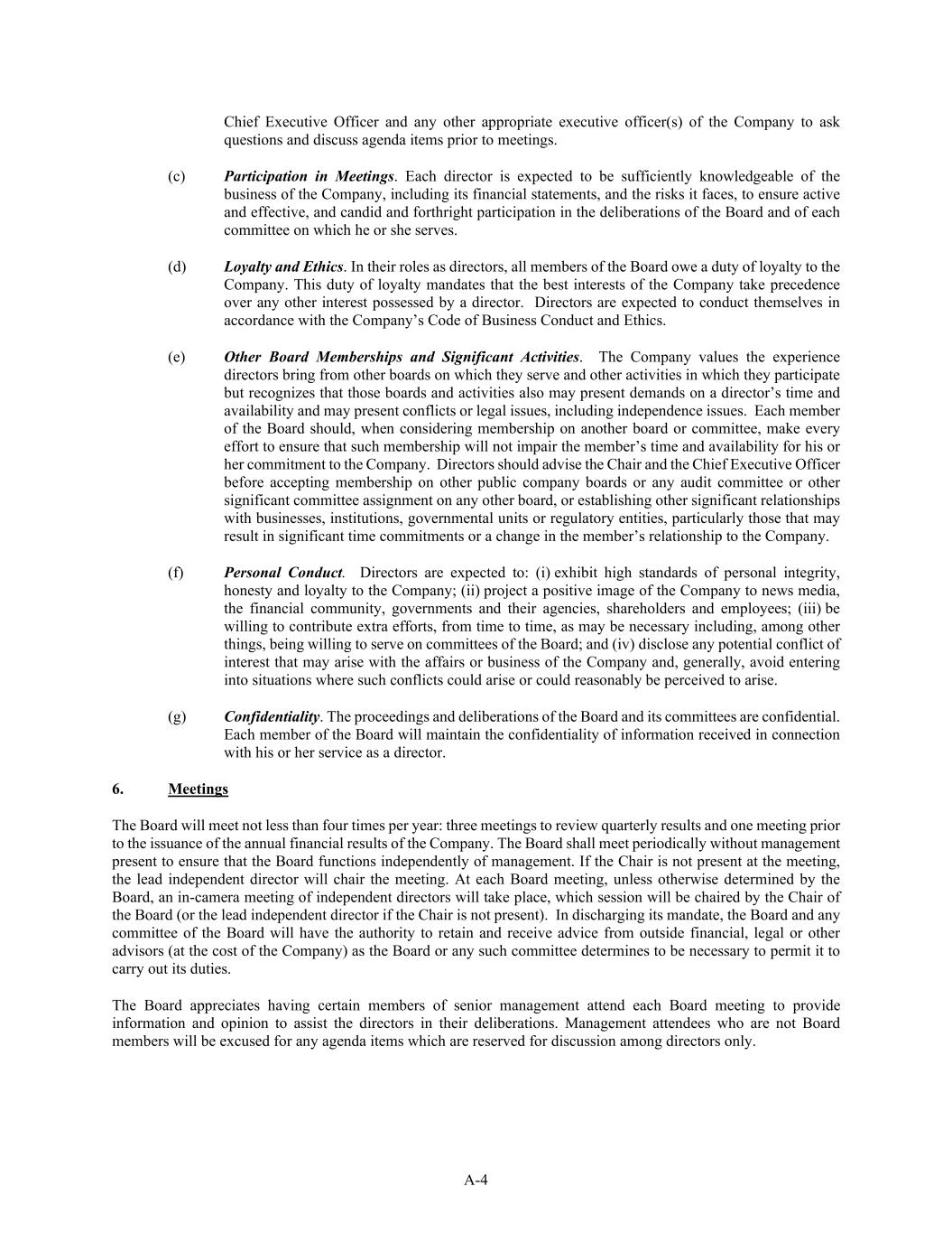 A-4 Chief Executive Officer and any other appropriate executive officer(s) of the Company to ask questions and discuss agenda items prior to meetings. (c) Participation in Meetings. Each director is expected to be sufficiently knowledgeable of the business of the Company, including its financial statements, and the risks it faces, to ensure active and effective, and candid and forthright participation in the deliberations of the Board and of each committee on which he or she serves. (d) Loyalty and Ethics. In their roles as directors, all members of the Board owe a duty of loyalty to the Company. This duty of loyalty mandates that the best interests of the Company take precedence over any other interest possessed by a director. Directors are expected to conduct themselves in accordance with the Company’s Code of Business Conduct and Ethics. (e) Other Board Memberships and Significant Activities. The Company values the experience directors bring from other boards on which they serve and other activities in which they participate but recognizes that those boards and activities also may present demands on a director’s time and availability and may present conflicts or legal issues, including independence issues. Each member of the Board should, when considering membership on another board or committee, make every effort to ensure that such membership will not impair the member’s time and availability for his or her commitment to the Company. Directors should advise the Chair and the Chief Executive Officer before accepting membership on other public company boards or any audit committee or other significant committee assignment on any other board, or establishing other significant relationships with businesses, institutions, governmental units or regulatory entities, particularly those that may result in significant time commitments or a change in the member’s relationship to the Company. (f) Personal Conduct. Directors are expected to: (i) exhibit high standards of personal integrity, honesty and loyalty to the Company; (ii) project a positive image of the Company to news media, the financial community, governments and their agencies, shareholders and employees; (iii) be willing to contribute extra efforts, from time to time, as may be necessary including, among other things, being willing to serve on committees of the Board; and (iv) disclose any potential conflict of interest that may arise with the affairs or business of the Company and, generally, avoid entering into situations where such conflicts could arise or could reasonably be perceived to arise. (g) Confidentiality. The proceedings and deliberations of the Board and its committees are confidential. Each member of the Board will maintain the confidentiality of information received in connection with his or her service as a director. 6. Meetings The Board will meet not less than four times per year: three meetings to review quarterly results and one meeting prior to the issuance of the annual financial results of the Company. The Board shall meet periodically without management present to ensure that the Board functions independently of management. If the Chair is not present at the meeting, the lead independent director will chair the meeting. At each Board meeting, unless otherwise determined by the Board, an in-camera meeting of independent directors will take place, which session will be chaired by the Chair of the Board (or the lead independent director if the Chair is not present). In discharging its mandate, the Board and any committee of the Board will have the authority to retain and receive advice from outside financial, legal or other advisors (at the cost of the Company) as the Board or any such committee determines to be necessary to permit it to carry out its duties. The Board appreciates having certain members of senior management attend each Board meeting to provide information and opinion to assist the directors in their deliberations. Management attendees who are not Board members will be excused for any agenda items which are reserved for discussion among directors only.