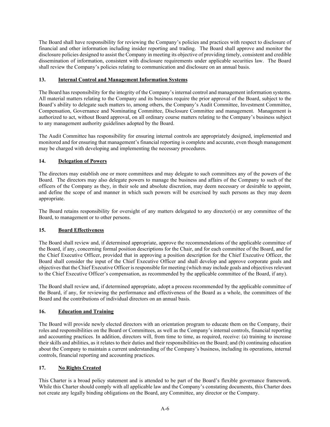 A-6 The Board shall have responsibility for reviewing the Company’s policies and practices with respect to disclosure of financial and other information including insider reporting and trading. The Board shall approve and monitor the disclosure policies designed to assist the Company in meeting its objective of providing timely, consistent and credible dissemination of information, consistent with disclosure requirements under applicable securities law. The Board shall review the Company’s policies relating to communication and disclosure on an annual basis. 13. Internal Control and Management Information Systems The Board has responsibility for the integrity of the Company’s internal control and management information systems. All material matters relating to the Company and its business require the prior approval of the Board, subject to the Board’s ability to delegate such matters to, among others, the Company’s Audit Committee, Investment Committee, Compensation, Governance and Nominating Committee, Disclosure Committee and management. Management is authorized to act, without Board approval, on all ordinary course matters relating to the Company’s business subject to any management authority guidelines adopted by the Board. The Audit Committee has responsibility for ensuring internal controls are appropriately designed, implemented and monitored and for ensuring that management’s financial reporting is complete and accurate, even though management may be charged with developing and implementing the necessary procedures. 14. Delegation of Powers The directors may establish one or more committees and may delegate to such committees any of the powers of the Board. The directors may also delegate powers to manage the business and affairs of the Company to such of the officers of the Company as they, in their sole and absolute discretion, may deem necessary or desirable to appoint, and define the scope of and manner in which such powers will be exercised by such persons as they may deem appropriate. The Board retains responsibility for oversight of any matters delegated to any director(s) or any committee of the Board, to management or to other persons. 15. Board Effectiveness The Board shall review and, if determined appropriate, approve the recommendations of the applicable committee of the Board, if any, concerning formal position descriptions for the Chair, and for each committee of the Board, and for the Chief Executive Officer, provided that in approving a position description for the Chief Executive Officer, the Board shall consider the input of the Chief Executive Officer and shall develop and approve corporate goals and objectives that the Chief Executive Officer is responsible for meeting (which may include goals and objectives relevant to the Chief Executive Officer’s compensation, as recommended by the applicable committee of the Board, if any). The Board shall review and, if determined appropriate, adopt a process recommended by the applicable committee of the Board, if any, for reviewing the performance and effectiveness of the Board as a whole, the committees of the Board and the contributions of individual directors on an annual basis. 16. Education and Training The Board will provide newly elected directors with an orientation program to educate them on the Company, their roles and responsibilities on the Board or Committees, as well as the Company’s internal controls, financial reporting and accounting practices. In addition, directors will, from time to time, as required, receive: (a) training to increase their skills and abilities, as it relates to their duties and their responsibilities on the Board; and (b) continuing education about the Company to maintain a current understanding of the Company’s business, including its operations, internal controls, financial reporting and accounting practices. 17. No Rights Created This Charter is a broad policy statement and is attended to be part of the Board’s flexible governance framework. While this Charter should comply with all applicable law and the Company’s constating documents, this Charter does not create any legally binding obligations on the Board, any Committee, any director or the Company.