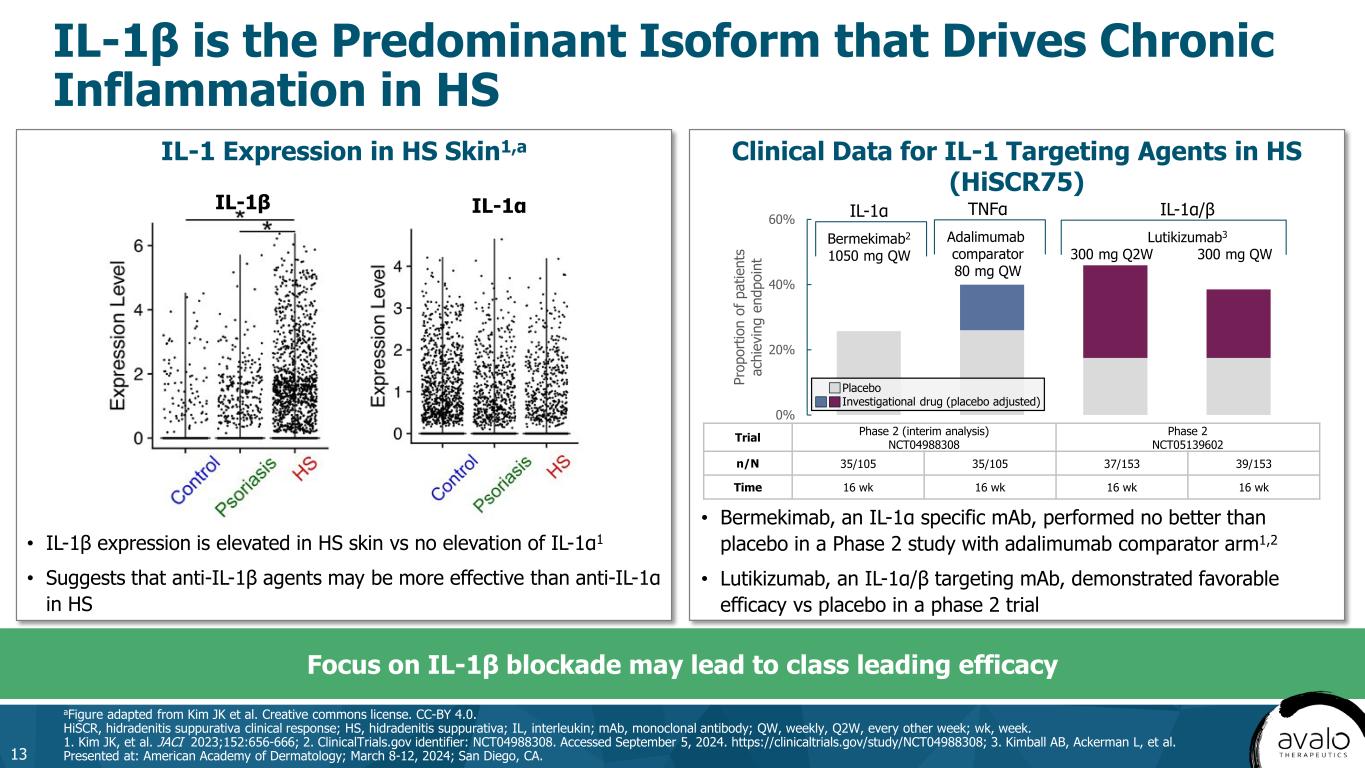 IL-1β is the Predominant Isoform that Drives Chronic Inflammation in HS 13 aFigure adapted from Kim JK et al. Creative commons license. CC-BY 4.0. HiSCR, hidradenitis suppurativa clinical response; HS, hidradenitis suppurativa; IL, interleukin; mAb, monoclonal antibody; QW, weekly, Q2W, every other week; wk, week. 1. Kim JK, et al. JACI 2023;152:656-666; 2. ClinicalTrials.gov identifier: NCT04988308. Accessed September 5, 2024. https://clinicaltrials.gov/study/NCT04988308; 3. Kimball AB, Ackerman L, et al. Presented at: American Academy of Dermatology; March 8-12, 2024; San Diego, CA. IL-1 Expression in HS Skin1,a Focus on IL-1β blockade may lead to class leading efficacy • IL-1β expression is elevated in HS skin vs no elevation of IL-1α1 • Suggests that anti-IL-1β agents may be more effective than anti-IL-1α in HS Trial Phase 2 (interim analysis) NCT04988308 Phase 2 NCT05139602 n/N 35/105 35/105 37/153 39/153 Time 16 wk 16 wk 16 wk 16 wk Clinical Data for IL-1 Targeting Agents in HS (HiSCR75) 0% 20% 40% 60% Pr op or tio n of p at ie nt s ac hi ev in g en dp oi nt IL-1α Bermekimab2 1050 mg QW IL-1α/β Lutikizumab3 300 mg Q2W 300 mg QW Placebo Investigational drug (placebo adjusted) TNFα Adalimumab comparator 80 mg QW IL-1β IL-1α • Bermekimab, an IL-1α specific mAb, performed no better than placebo in a Phase 2 study with adalimumab comparator arm1,2 • Lutikizumab, an IL-1α/β targeting mAb, demonstrated favorable efficacy vs placebo in a phase 2 trial