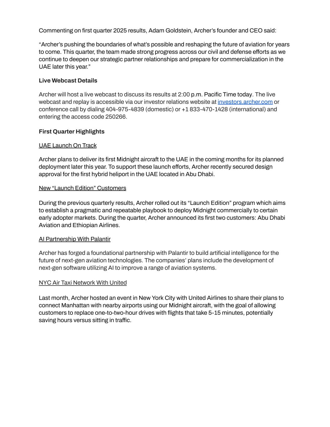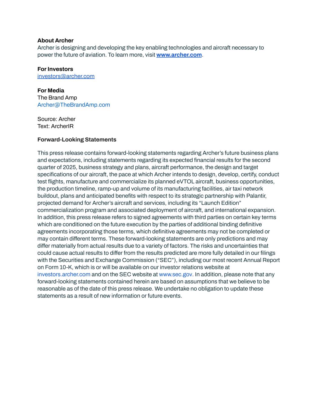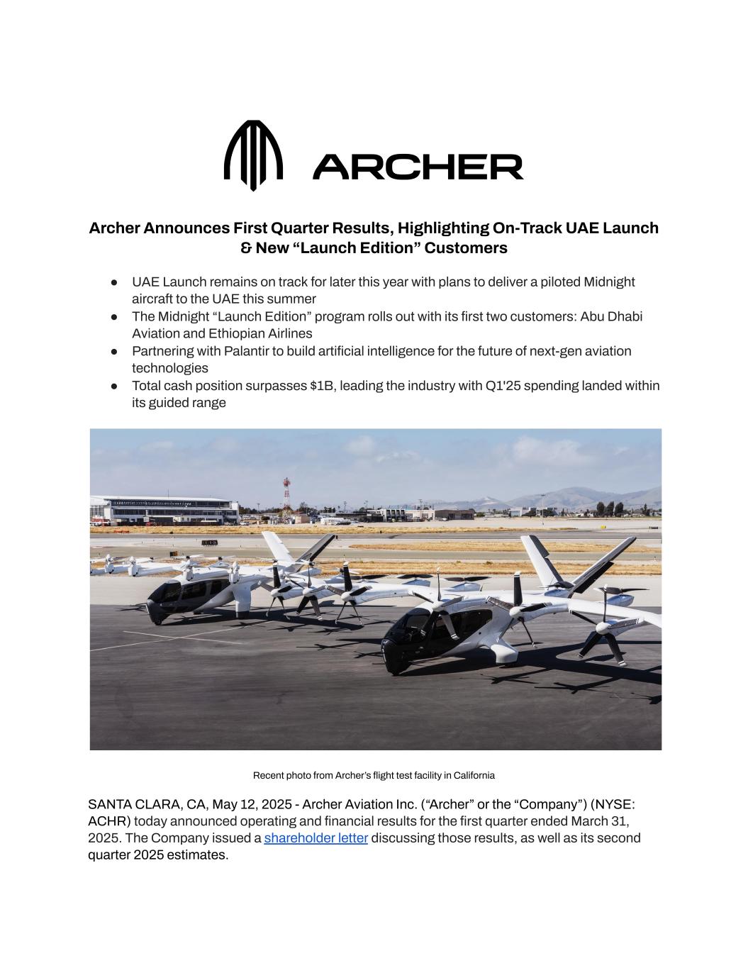 o 2025年5月12日、アーチャー・アビエーション社(以下「アーチャー社」または「当社」)は、2025年3月31日に終了する第1四半期の経営成績および財務成績に関する電話会議を開催する予定です。アーチャー社はまた、株主宛書簡(以下「株主書簡」)およびプレスリリース(以下「プレスリリース」)を発行し、2025年3月31日に終了する第1四半期の経営成績および財務成績を発表する。株主宛書簡およびプレスリリースのコピーは、本フォーム8-Kの別紙99.1および99.2として添付されています。
