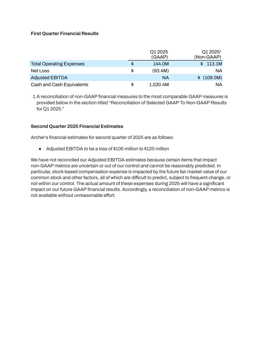アーチャーは、株主通信、プレスリリース、および電話会議において、非GAAPベースの財務情報に言及し、または言及する予定です。GAAPベースの業績と非GAAPベースの業績の調整表は、本フォーム8-Kカレント・レポートに添付されている株主通信およびプレスリリースに記載されています。