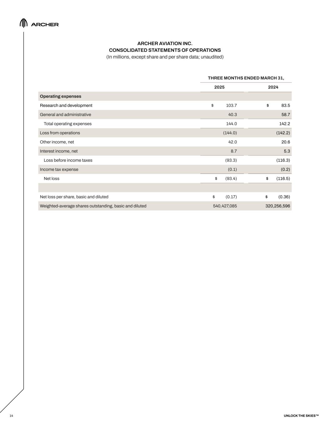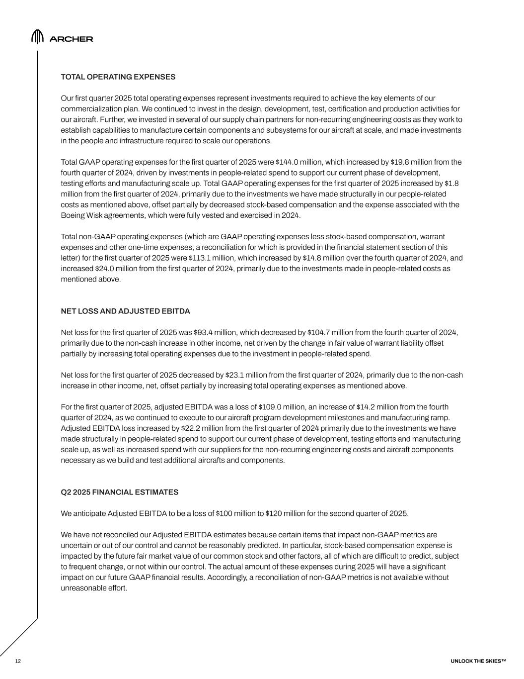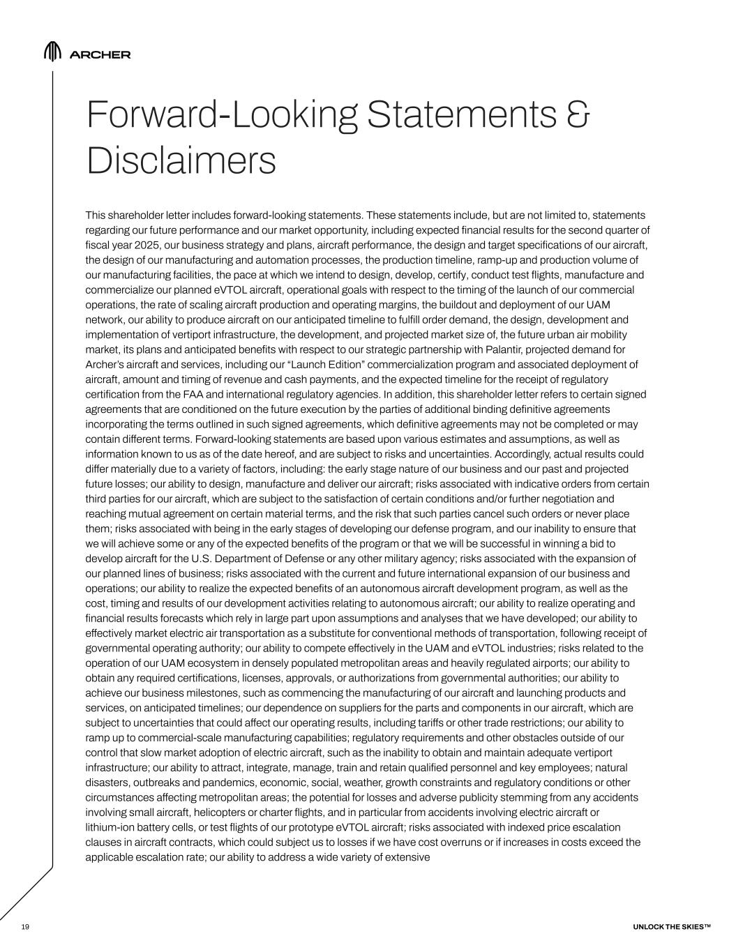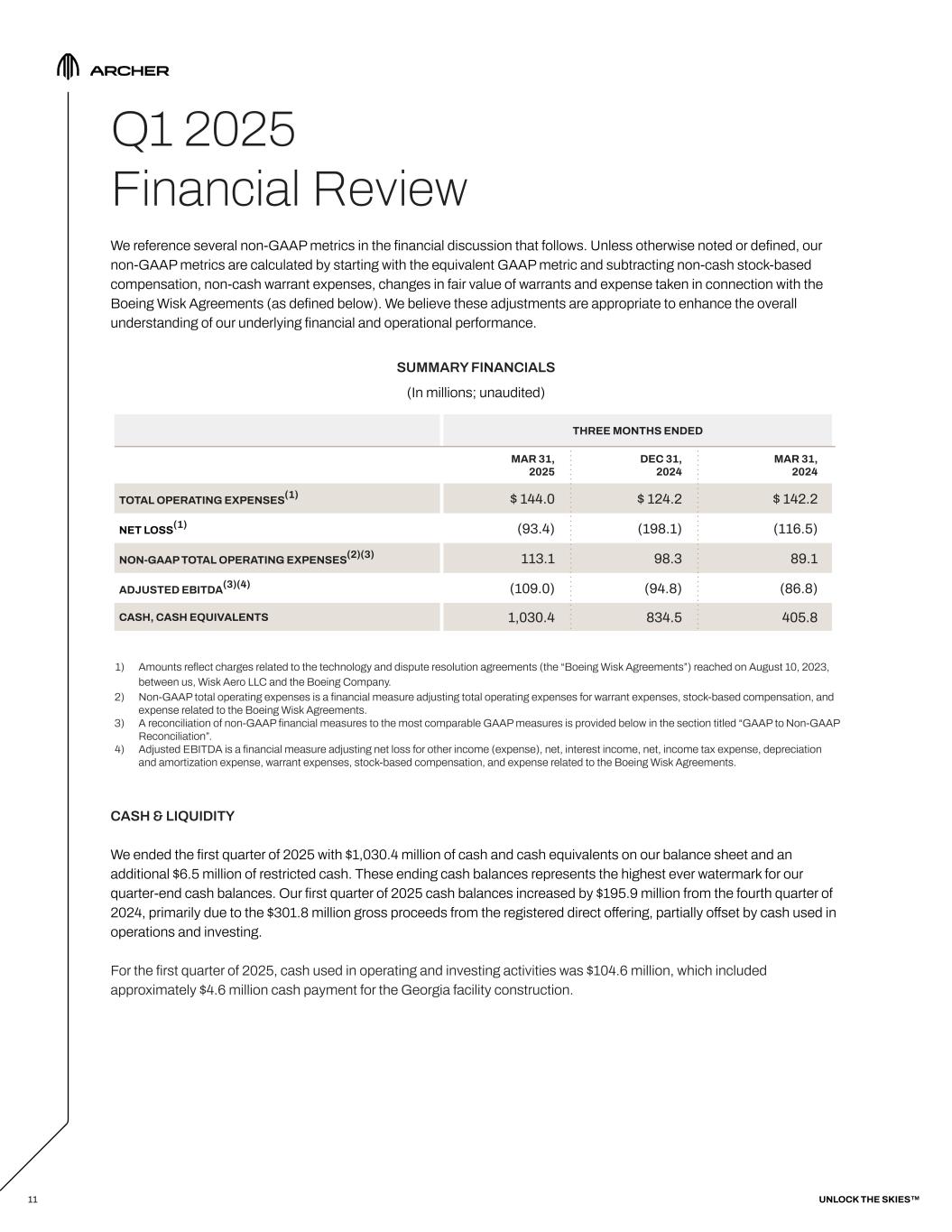 Strong Financial Position Total Cash Position Surpasses $1B, Leading the Industry. Our Q1’25 capital raise further strengthened our balance sheet helping enable us to execute on early commercial deployment opportunities. Quarterly Spend On Target. Our Q1'25 spending landed within our guided range and included strategic investments to support the company's growth trajectory. 2 AI PARTNERSHIP WITH PALANTIR We have forged a foundational partnership with Palantir to build artificial intelligence for the future of next-gen aviation technologies. Our plans include the development of next-gen software utilizing AI to improve a range of aviation systems. NEW LAUNCH EDITION CUSTOMERS Last earnings we rolled out our “Launch Edition” program which aims to establish a pragmatic and repeatable playbook to deploy Midnight commercially to certain early adopter markets. During the quarter, we announced our first two customers: Abu Dhabi Aviation and Ethiopian Airlines. NYC AIR TAXI NETWORK WITH UNITED We recently hosted an event in NYC with United Airlines to share our plans to connect Manhattan with nearby airports using our Midnight aircraft, with the goal of allowing customers to replace one-to-two-hour drives with flights that take 5-15 minutes, potentially saving hours versus sitting in traffic. UNLOCK THE SKIES™ UAE LAUNCH ON TRACK We plan to deliver our first Midnight aircraft to the UAE in the coming months for its planned deployment later this year. To support these launch efforts, we recently secured design approval for the first hybrid heliport in the UAE located in Abu Dhabi.