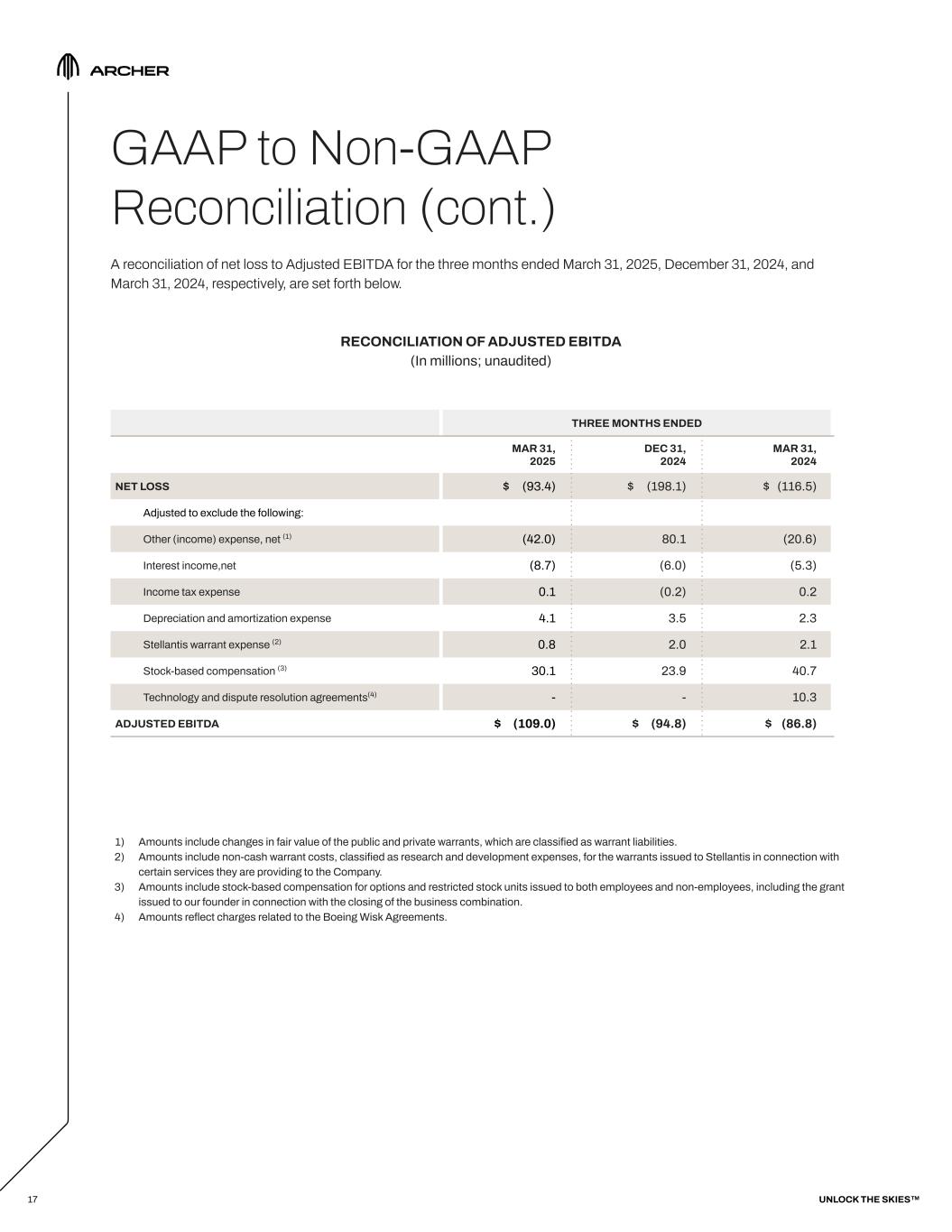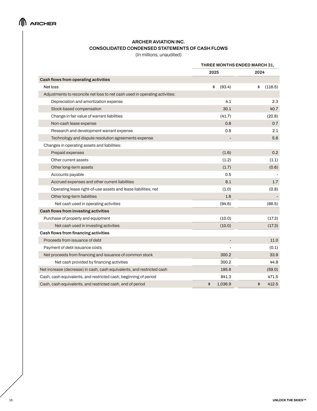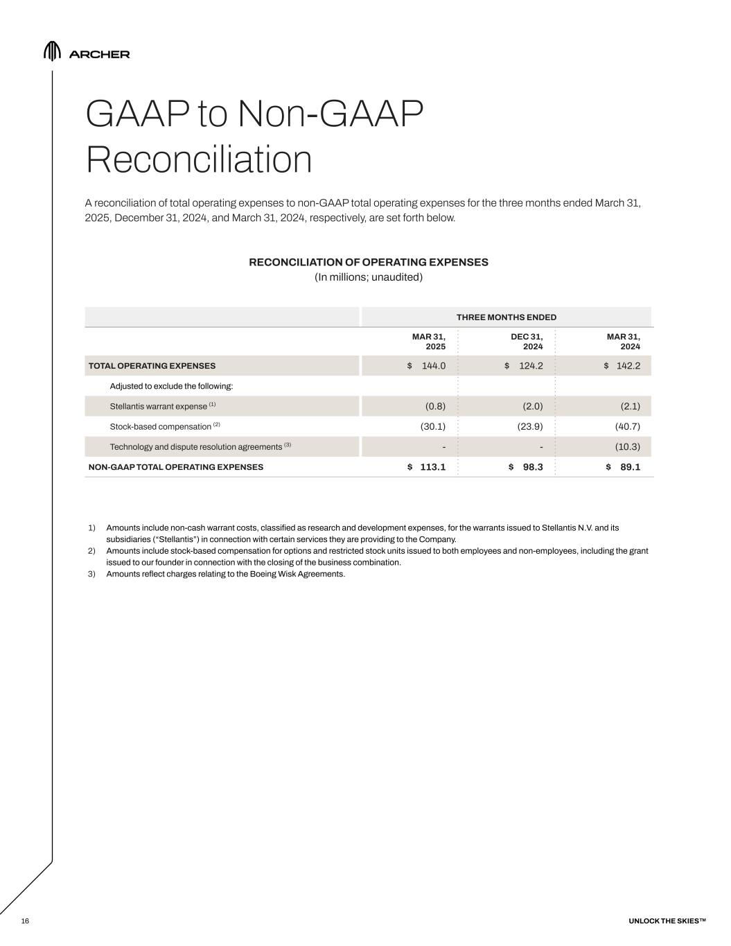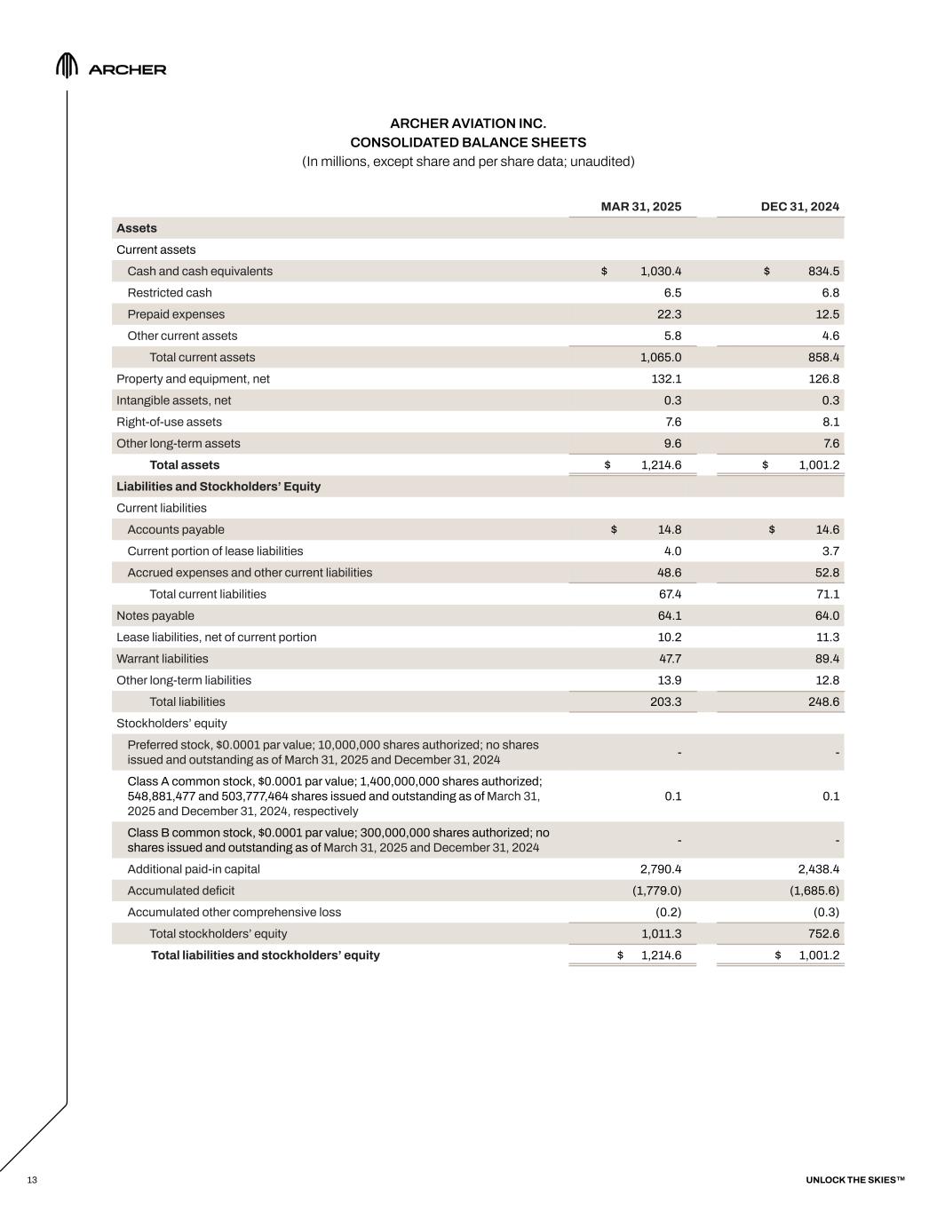 Strong Financial Position Total Cash Position Surpasses $1B, Leading the Industry. Our Q1’25 capital raise further strengthened our balance sheet helping enable us to execute on early commercial deployment opportunities. Quarterly Spend On Target. Our Q1'25 spending landed within our guided range and included strategic investments to support the company's growth trajectory. 2 AI PARTNERSHIP WITH PALANTIR We have forged a foundational partnership with Palantir to build artificial intelligence for the future of next-gen aviation technologies. Our plans include the development of next-gen software utilizing AI to improve a range of aviation systems. NEW LAUNCH EDITION CUSTOMERS Last earnings we rolled out our “Launch Edition” program which aims to establish a pragmatic and repeatable playbook to deploy Midnight commercially to certain early adopter markets. During the quarter, we announced our first two customers: Abu Dhabi Aviation and Ethiopian Airlines. NYC AIR TAXI NETWORK WITH UNITED We recently hosted an event in NYC with United Airlines to share our plans to connect Manhattan with nearby airports using our Midnight aircraft, with the goal of allowing customers to replace one-to-two-hour drives with flights that take 5-15 minutes, potentially saving hours versus sitting in traffic. UNLOCK THE SKIES™ UAE LAUNCH ON TRACK We plan to deliver our first Midnight aircraft to the UAE in the coming months for its planned deployment later this year. To support these launch efforts, we recently secured design approval for the first hybrid heliport in the UAE located in Abu Dhabi.