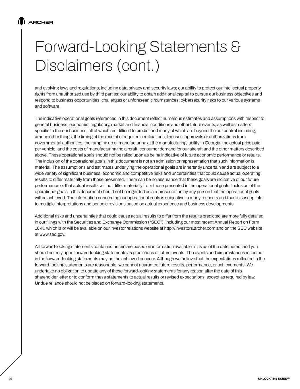3 UAE LAUNCH ON TRACK UNLOCK THE SKIES™ AIRCRAFT DELIVERY First Midnight aircraft bound for the UAE in flight testing. Scheduled to be delivered in the coming months. Archer Midnight pictured in the UAE GOVERNMENT SUPPORT Abu Dhabi Investment Office accelerating air taxi launch under UAE’s Smart & Autonomous Systems Council. Archer executives with His Highness Sheikh Zayed bin Hamdan, Chairman of 2PointZero, a subsidiary of UAE’S largest listed entity, IHC REGULATORY PATHWAY Partnership with UAE regulator, GCAA, to chart regulatory pathway for expedited launch of eVTOLs Archer leadership in Abu Dhabi with His Excellency Mohamed Saif Al Suwaidi, Director General of the UAE General Civil Aviation Authority OPERATING PARTNER First Launch Edition customer, Abu Dhabi Aviation, to integrate Midnight into existing air taxi operations Signing ceremony with first “Launch Edition” customer, Abu Dhabi Aviation Chairman His Excellency Nader Ahmed Al Hammadi PILOT TRAINING Midnight simulator delivered to Etihad Aviation Training, with initial training of pilots underway Pilot training session at Etihad headquarters between Archer, Abu Dhabi Aviation pilots, and Etihad Aviation Training staff LAUNCH INFRASTRUCTURE UAE’s first hybrid heliport conversion approved by the GCAA, on track to be electrified later this year Rendering of future hybrid vertiport at Abu Dhabi Cruise Terminal