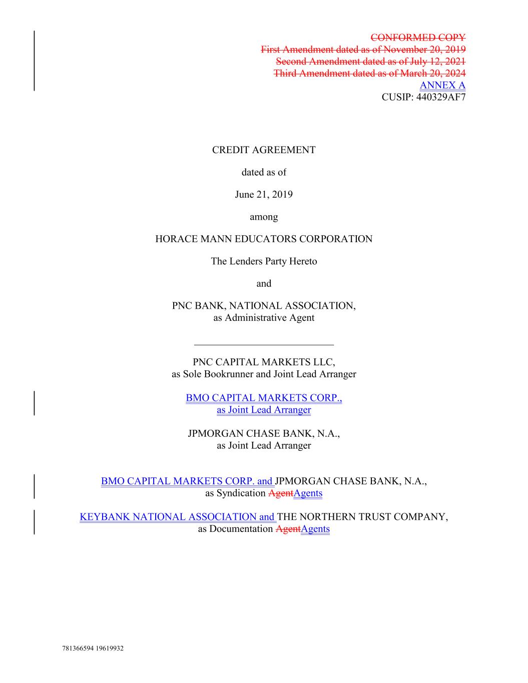 CONFORMED COPY First Amendment dated as of November 20, 2019 Second Amendment dated as of July 12, 2021 Third Amendment dated as of March 20, 2024 ANNEX A 781366594 19619932 CREDIT AGREEMENT dated as of June 21, 2019 among HORACE MANN EDUCATORS CORPORATION The Lenders Party Hereto and PNC BANK, NATIONAL ASSOCIATION, as Administrative Agent ___________________________ PNC CAPITAL MARKETS LLC, as Sole Bookrunner and Joint Lead Arranger BMO CAPITAL MARKETS CORP., as Joint Lead Arranger JPMORGAN CHASE BANK, N.A., as Joint Lead Arranger BMO CAPITAL MARKETS CORP. and JPMORGAN CHASE BANK, N.A., as Syndication AgentAgents KEYBANK NATIONAL ASSOCIATION and THE NORTHERN TRUST COMPANY, as Documentation AgentAgents CUSIP: 440329AF7