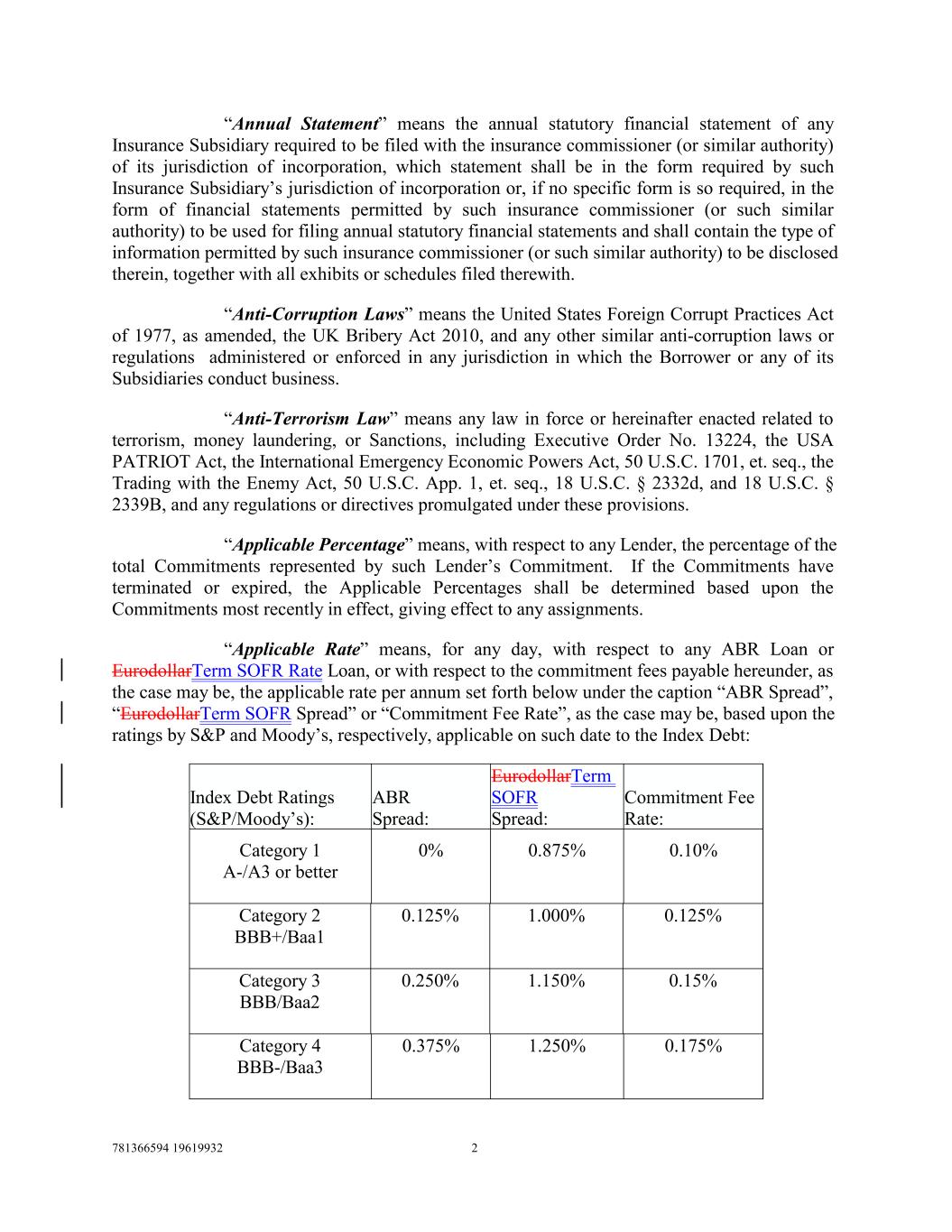 781366594 19619932 2 Commitment Fee Rate: 0.125% 1.000% 0.125% Index Debt Ratings (S&P/Moody’s): Category 1 A-/A3 or better Category 3 BBB/Baa2 0.250% 0% 1.150% ABR Spread: 0.15% 0.875% “Annual Statement” means the annual statutory financial statement of any Insurance Subsidiary required to be filed with the insurance commissioner (or similar authority) of its jurisdiction of incorporation, which statement shall be in the form required by such Insurance Subsidiary’s jurisdiction of incorporation or, if no specific form is so required, in the form of financial statements permitted by such insurance commissioner (or such similar authority) to be used for filing annual statutory financial statements and shall contain the type of information permitted by such insurance commissioner (or such similar authority) to be disclosed therein, together with all exhibits or schedules filed therewith. “Anti-Corruption Laws” means the United States Foreign Corrupt Practices Act of 1977, as amended, the UK Bribery Act 2010, and any other similar anti-corruption laws or regulations administered or enforced in any jurisdiction in which the Borrower or any of its Subsidiaries conduct business. “Anti-Terrorism Law” means any law in force or hereinafter enacted related to terrorism, money laundering, or Sanctions, including Executive Order No. 13224, the USA PATRIOT Act, the International Emergency Economic Powers Act, 50 U.S.C. 1701, et. seq., the Trading with the Enemy Act, 50 U.S.C. App. 1, et. seq., 18 U.S.C. § 2332d, and 18 U.S.C. § 2339B, and any regulations or directives promulgated under these provisions. “Applicable Percentage” means, with respect to any Lender, the percentage of the total Commitments represented by such Lender’s Commitment. If the Commitments have terminated or expired, the Applicable Percentages shall be determined based upon the Commitments most recently in effect, giving effect to any assignments. “Applicable Rate” means, for any day, with respect to any ABR Loan or EurodollarTerm SOFR Rate Loan, or with respect to the commitment fees payable hereunder, as the case may be, the applicable rate per annum set forth below under the caption “ABR Spread”, “EurodollarTerm SOFR Spread” or “Commitment Fee Rate”, as the case may be, based upon the ratings by S&P and Moody’s, respectively, applicable on such date to the Index Debt: Category 4 BBB-/Baa3 0.10% 0.375% EurodollarTerm SOFR Spread: 1.250% 0.175% Category 2 BBB+/Baa1