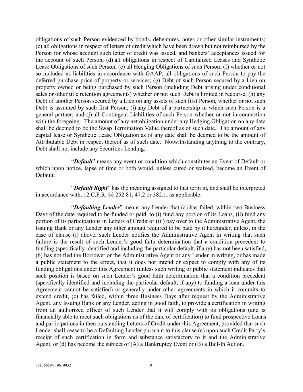 obligations of such Person evidenced by bonds, debentures, notes or other similar instruments; (c) all obligations in respect of letters of credit which have been drawn but not reimbursed by the Person for whose account such letter of credit was issued, and bankers’ acceptances issued for the account of such Person; (d) all obligations in respect of Capitalized Leases and Synthetic Lease Obligations of such Person; (e) all Hedging Obligations of such Person; (f) whether or not so included as liabilities in accordance with GAAP, all obligations of such Person to pay the deferred purchase price of property or services; (g) Debt of such Person secured by a Lien on property owned or being purchased by such Person (including Debt arising under conditional sales or other title retention agreements) whether or not such Debt is limited in recourse; (h) any Debt of another Person secured by a Lien on any assets of such first Person, whether or not such Debt is assumed by such first Person; (i) any Debt of a partnership in which such Person is a general partner; and (j) all Contingent Liabilities of such Person whether or not in connection with the foregoing. The amount of any net obligation under any Hedging Obligation on any date shall be deemed to be the Swap Termination Value thereof as of such date. The amount of any capital lease or Synthetic Lease Obligation as of any date shall be deemed to be the amount of Attributable Debt in respect thereof as of such date. Notwithstanding anything to the contrary, Debt shall not include any Securities Lending. “Default” means any event or condition which constitutes an Event of Default or which upon notice, lapse of time or both would, unless cured or waived, become an Event of Default. “Default Right” has the meaning assigned to that term in, and shall be interpreted in accordance with, 12 C.F.R. §§ 252.81, 47.2 or 382.1, as applicable. “Defaulting Lender” means any Lender that (a) has failed, within two Business Days of the date required to be funded or paid, to (i) fund any portion of its Loans, (ii) fund any portion of its participations in Letters of Credit or (iii) pay over to the Administrative Agent, the Issuing Bank or any Lender any other amount required to be paid by it hereunder, unless, in the case of clause (i) above, such Lender notifies the Administrative Agent in writing that such failure is the result of such Lender’s good faith determination that a condition precedent to funding (specifically identified and including the particular default, if any) has not been satisfied, (b) has notified the Borrower or the Administrative Agent or any Lender in writing, or has made a public statement to the effect, that it does not intend or expect to comply with any of its funding obligations under this Agreement (unless such writing or public statement indicates that such position is based on such Lender’s good faith determination that a condition precedent (specifically identified and including the particular default, if any) to funding a loan under this Agreement cannot be satisfied) or generally under other agreements in which it commits to extend credit, (c) has failed, within three Business Days after request by the Administrative Agent, any Issuing Bank or any Lender, acting in good faith, to provide a certification in writing from an authorized officer of such Lender that it will comply with its obligations (and is financially able to meet such obligations as of the date of certification) to fund prospective Loans and participations in then outstanding Letters of Credit under this Agreement, provided that such Lender shall cease to be a Defaulting Lender pursuant to this clause (c) upon such Credit Party’s receipt of such certification in form and substance satisfactory to it and the Administrative Agent, or (d) has become the subject of (A) a Bankruptcy Event or (B) a Bail-In Action. 781366594 19619932 9