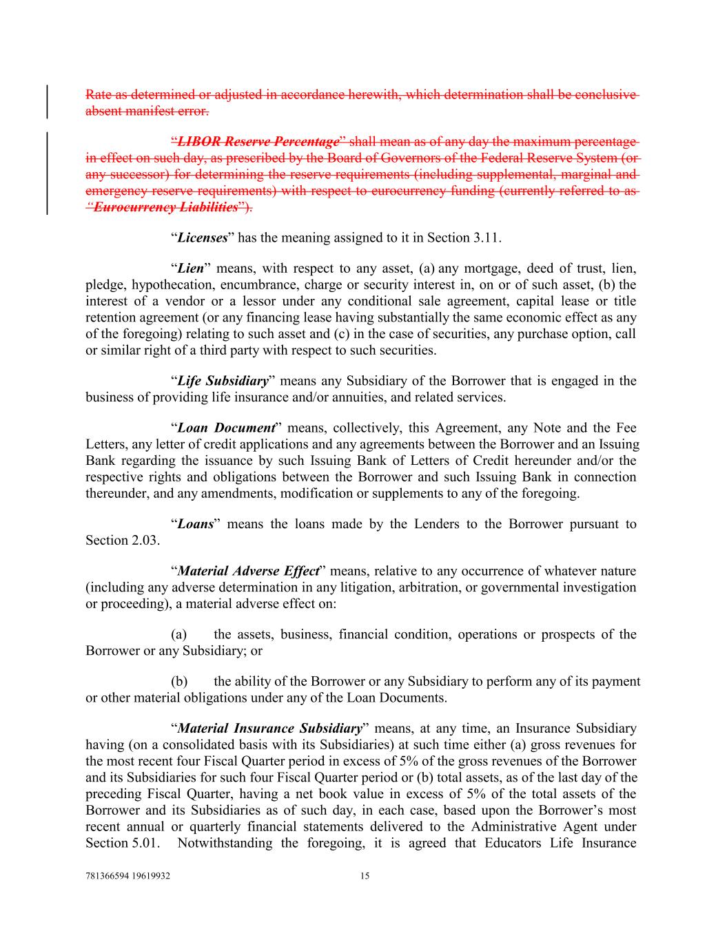 Rate as determined or adjusted in accordance herewith, which determination shall be conclusive absent manifest error. “LIBOR Reserve Percentage” shall mean as of any day the maximum percentage in effect on such day, as prescribed by the Board of Governors of the Federal Reserve System (or any successor) for determining the reserve requirements (including supplemental, marginal and emergency reserve requirements) with respect to eurocurrency funding (currently referred to as “Eurocurrency Liabilities”). “Licenses” has the meaning assigned to it in Section 3.11. “Lien” means, with respect to any asset, (a) any mortgage, deed of trust, lien, pledge, hypothecation, encumbrance, charge or security interest in, on or of such asset, (b) the interest of a vendor or a lessor under any conditional sale agreement, capital lease or title retention agreement (or any financing lease having substantially the same economic effect as any of the foregoing) relating to such asset and (c) in the case of securities, any purchase option, call or similar right of a third party with respect to such securities. “Life Subsidiary” means any Subsidiary of the Borrower that is engaged in the business of providing life insurance and/or annuities, and related services. “Loan Document” means, collectively, this Agreement, any Note and the Fee Letters, any letter of credit applications and any agreements between the Borrower and an Issuing Bank regarding the issuance by such Issuing Bank of Letters of Credit hereunder and/or the respective rights and obligations between the Borrower and such Issuing Bank in connection thereunder, and any amendments, modification or supplements to any of the foregoing. “Loans” means the loans made by the Lenders to the Borrower pursuant to Section 2.03. “Material Adverse Effect” means, relative to any occurrence of whatever nature (including any adverse determination in any litigation, arbitration, or governmental investigation or proceeding), a material adverse effect on: (a) the assets, business, financial condition, operations or prospects of the Borrower or any Subsidiary; or (b) the ability of the Borrower or any Subsidiary to perform any of its payment or other material obligations under any of the Loan Documents. “Material Insurance Subsidiary” means, at any time, an Insurance Subsidiary having (on a consolidated basis with its Subsidiaries) at such time either (a) gross revenues for the most recent four Fiscal Quarter period in excess of 5% of the gross revenues of the Borrower and its Subsidiaries for such four Fiscal Quarter period or (b) total assets, as of the last day of the preceding Fiscal Quarter, having a net book value in excess of 5% of the total assets of the Borrower and its Subsidiaries as of such day, in each case, based upon the Borrower’s most recent annual or quarterly financial statements delivered to the Administrative Agent under Section 5.01. Notwithstanding the foregoing, it is agreed that Educators Life Insurance 781366594 19619932 15