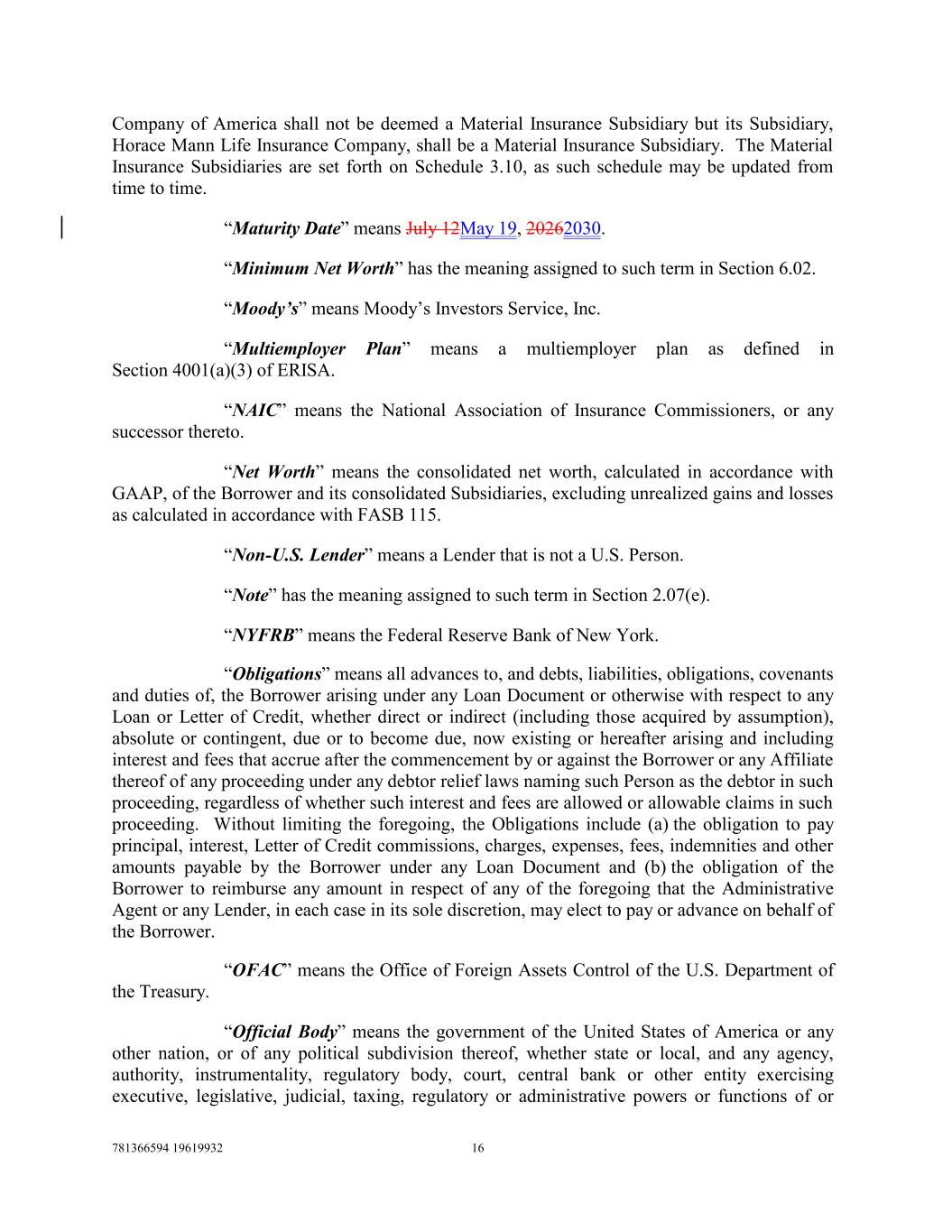 Company of America shall not be deemed a Material Insurance Subsidiary but its Subsidiary, Horace Mann Life Insurance Company, shall be a Material Insurance Subsidiary. The Material Insurance Subsidiaries are set forth on Schedule 3.10, as such schedule may be updated from time to time. “Maturity Date” means July 12May 19, 20262030. “Minimum Net Worth” has the meaning assigned to such term in Section 6.02. “Moody’s” means Moody’s Investors Service, Inc. “Multiemployer Plan” means a multiemployer plan as defined in Section 4001(a)(3) of ERISA. “NAIC” means the National Association of Insurance Commissioners, or any successor thereto. “Net Worth” means the consolidated net worth, calculated in accordance with GAAP, of the Borrower and its consolidated Subsidiaries, excluding unrealized gains and losses as calculated in accordance with FASB 115. “Non-U.S. Lender” means a Lender that is not a U.S. Person. “Note” has the meaning assigned to such term in Section 2.07(e). “NYFRB” means the Federal Reserve Bank of New York. “Obligations” means all advances to, and debts, liabilities, obligations, covenants and duties of, the Borrower arising under any Loan Document or otherwise with respect to any Loan or Letter of Credit, whether direct or indirect (including those acquired by assumption), absolute or contingent, due or to become due, now existing or hereafter arising and including interest and fees that accrue after the commencement by or against the Borrower or any Affiliate thereof of any proceeding under any debtor relief laws naming such Person as the debtor in such proceeding, regardless of whether such interest and fees are allowed or allowable claims in such proceeding. Without limiting the foregoing, the Obligations include (a) the obligation to pay principal, interest, Letter of Credit commissions, charges, expenses, fees, indemnities and other amounts payable by the Borrower under any Loan Document and (b) the obligation of the Borrower to reimburse any amount in respect of any of the foregoing that the Administrative Agent or any Lender, in each case in its sole discretion, may elect to pay or advance on behalf of the Borrower. “OFAC” means the Office of Foreign Assets Control of the U.S. Department of the Treasury. “Official Body” means the government of the United States of America or any other nation, or of any political subdivision thereof, whether state or local, and any agency, authority, instrumentality, regulatory body, court, central bank or other entity exercising executive, legislative, judicial, taxing, regulatory or administrative powers or functions of or 781366594 19619932 16