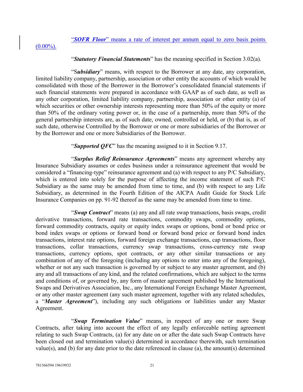 “SOFR Floor” means a rate of interest per annum equal to zero basis points (0.00%). “Statutory Financial Statements” has the meaning specified in Section 3.02(a). “Subsidiary” means, with respect to the Borrower at any date, any corporation, limited liability company, partnership, association or other entity the accounts of which would be consolidated with those of the Borrower in the Borrower’s consolidated financial statements if such financial statements were prepared in accordance with GAAP as of such date, as well as any other corporation, limited liability company, partnership, association or other entity (a) of which securities or other ownership interests representing more than 50% of the equity or more than 50% of the ordinary voting power or, in the case of a partnership, more than 50% of the general partnership interests are, as of such date, owned, controlled or held, or (b) that is, as of such date, otherwise Controlled by the Borrower or one or more subsidiaries of the Borrower or by the Borrower and one or more Subsidiaries of the Borrower. “Supported QFC” has the meaning assigned to it in Section 9.17. “Surplus Relief Reinsurance Agreements” means any agreement whereby any Insurance Subsidiary assumes or cedes business under a reinsurance agreement that would be considered a “financing-type” reinsurance agreement and (a) with respect to any P/C Subsidiary, which is entered into solely for the purpose of affecting the income statement of such P/C Subsidiary as the same may be amended from time to time, and (b) with respect to any Life Subsidiary, as determined in the Fourth Edition of the AICPA Audit Guide for Stock Life Insurance Companies on pp. 91-92 thereof as the same may be amended from time to time. “Swap Contract” means (a) any and all rate swap transactions, basis swaps, credit derivative transactions, forward rate transactions, commodity swaps, commodity options, forward commodity contracts, equity or equity index swaps or options, bond or bond price or bond index swaps or options or forward bond or forward bond price or forward bond index transactions, interest rate options, forward foreign exchange transactions, cap transactions, floor transactions, collar transactions, currency swap transactions, cross-currency rate swap transactions, currency options, spot contracts, or any other similar transactions or any combination of any of the foregoing (including any options to enter into any of the foregoing), whether or not any such transaction is governed by or subject to any master agreement, and (b) any and all transactions of any kind, and the related confirmations, which are subject to the terms and conditions of, or governed by, any form of master agreement published by the International Swaps and Derivatives Association, Inc., any International Foreign Exchange Master Agreement, or any other master agreement (any such master agreement, together with any related schedules, a “Master Agreement”), including any such obligations or liabilities under any Master Agreement. “Swap Termination Value” means, in respect of any one or more Swap Contracts, after taking into account the effect of any legally enforceable netting agreement relating to such Swap Contracts, (a) for any date on or after the date such Swap Contracts have been closed out and termination value(s) determined in accordance therewith, such termination value(s), and (b) for any date prior to the date referenced in clause (a), the amount(s) determined 781366594 19619932 21