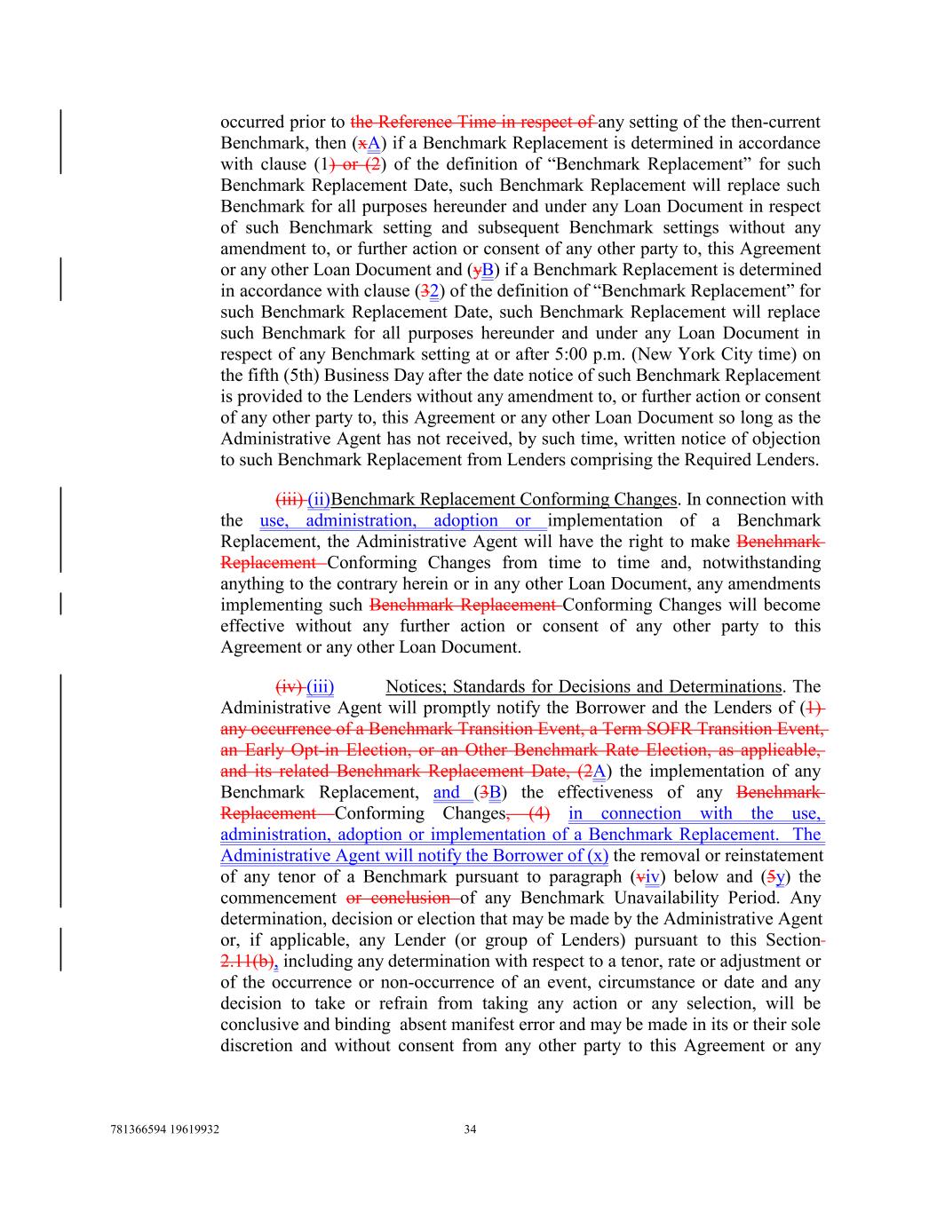 occurred prior to the Reference Time in respect of any setting of the then-current Benchmark, then (xA) if a Benchmark Replacement is determined in accordance with clause (1) or (2) of the definition of “Benchmark Replacement” for such Benchmark Replacement Date, such Benchmark Replacement will replace such Benchmark for all purposes hereunder and under any Loan Document in respect of such Benchmark setting and subsequent Benchmark settings without any amendment to, or further action or consent of any other party to, this Agreement or any other Loan Document and (yB) if a Benchmark Replacement is determined in accordance with clause (32) of the definition of “Benchmark Replacement” for such Benchmark Replacement Date, such Benchmark Replacement will replace such Benchmark for all purposes hereunder and under any Loan Document in respect of any Benchmark setting at or after 5:00 p.m. (New York City time) on the fifth (5th) Business Day after the date notice of such Benchmark Replacement is provided to the Lenders without any amendment to, or further action or consent of any other party to, this Agreement or any other Loan Document so long as the Administrative Agent has not received, by such time, written notice of objection to such Benchmark Replacement from Lenders comprising the Required Lenders. (iii) (ii)Benchmark Replacement Conforming Changes. In connection with the use, administration, adoption or implementation of a Benchmark Replacement, the Administrative Agent will have the right to make Benchmark Replacement Conforming Changes from time to time and, notwithstanding anything to the contrary herein or in any other Loan Document, any amendments implementing such Benchmark Replacement Conforming Changes will become effective without any further action or consent of any other party to this Agreement or any other Loan Document. (iv) (iii) Notices; Standards for Decisions and Determinations. The Administrative Agent will promptly notify the Borrower and the Lenders of (1) any occurrence of a Benchmark Transition Event, a Term SOFR Transition Event, an Early Opt-in Election, or an Other Benchmark Rate Election, as applicable, and its related Benchmark Replacement Date, (2A) the implementation of any Benchmark Replacement, and (3B) the effectiveness of any Benchmark Replacement Conforming Changes, (4) in connection with the use, administration, adoption or implementation of a Benchmark Replacement. The Administrative Agent will notify the Borrower of (x) the removal or reinstatement of any tenor of a Benchmark pursuant to paragraph (viv) below and (5y) the commencement or conclusion of any Benchmark Unavailability Period. Any determination, decision or election that may be made by the Administrative Agent or, if applicable, any Lender (or group of Lenders) pursuant to this Section 2.11(b), including any determination with respect to a tenor, rate or adjustment or of the occurrence or non-occurrence of an event, circumstance or date and any decision to take or refrain from taking any action or any selection, will be conclusive and binding absent manifest error and may be made in its or their sole discretion and without consent from any other party to this Agreement or any 781366594 19619932 34