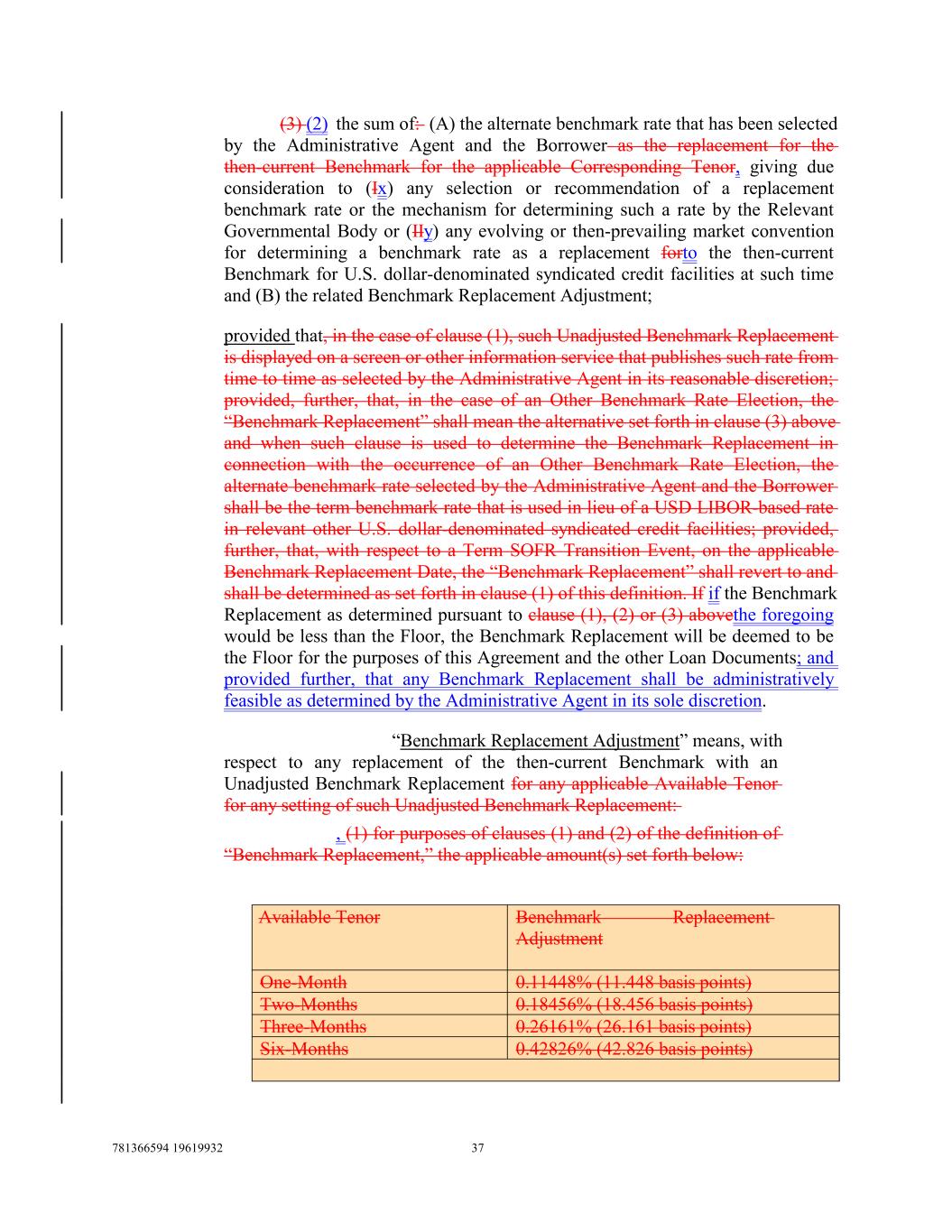 781366594 19619932 37 Benchmark Replacement Adjustment 0.18456% (18.456 basis points) (3) (2) the sum of: (A) the alternate benchmark rate that has been selected by the Administrative Agent and the Borrower as the replacement for the then-current Benchmark for the applicable Corresponding Tenor, giving due consideration to (Ix) any selection or recommendation of a replacement benchmark rate or the mechanism for determining such a rate by the Relevant Governmental Body or (IIy) any evolving or then-prevailing market convention for determining a benchmark rate as a replacement forto the then-current Benchmark for U.S. dollar-denominated syndicated credit facilities at such time and (B) the related Benchmark Replacement Adjustment; provided that, in the case of clause (1), such Unadjusted Benchmark Replacement is displayed on a screen or other information service that publishes such rate from time to time as selected by the Administrative Agent in its reasonable discretion; provided, further, that, in the case of an Other Benchmark Rate Election, the “Benchmark Replacement” shall mean the alternative set forth in clause (3) above and when such clause is used to determine the Benchmark Replacement in connection with the occurrence of an Other Benchmark Rate Election, the alternate benchmark rate selected by the Administrative Agent and the Borrower shall be the term benchmark rate that is used in lieu of a USD LIBOR-based rate in relevant other U.S. dollar-denominated syndicated credit facilities; provided, further, that, with respect to a Term SOFR Transition Event, on the applicable Benchmark Replacement Date, the “Benchmark Replacement” shall revert to and shall be determined as set forth in clause (1) of this definition. If if the Benchmark Replacement as determined pursuant to clause (1), (2) or (3) abovethe foregoing would be less than the Floor, the Benchmark Replacement will be deemed to be the Floor for the purposes of this Agreement and the other Loan Documents; and provided further, that any Benchmark Replacement shall be administratively feasible as determined by the Administrative Agent in its sole discretion. “Benchmark Replacement Adjustment” means, with respect to any replacement of the then-current Benchmark with an Unadjusted Benchmark Replacement for any applicable Available Tenor for any setting of such Unadjusted Benchmark Replacement: , (1) for purposes of clauses (1) and (2) of the definition of “Benchmark Replacement,” the applicable amount(s) set forth below: Three-Months 0.26161% (26.161 basis points) One-Month Six-Months 0.11448% (11.448 basis points) 0.42826% (42.826 basis points) Available Tenor Two-Months