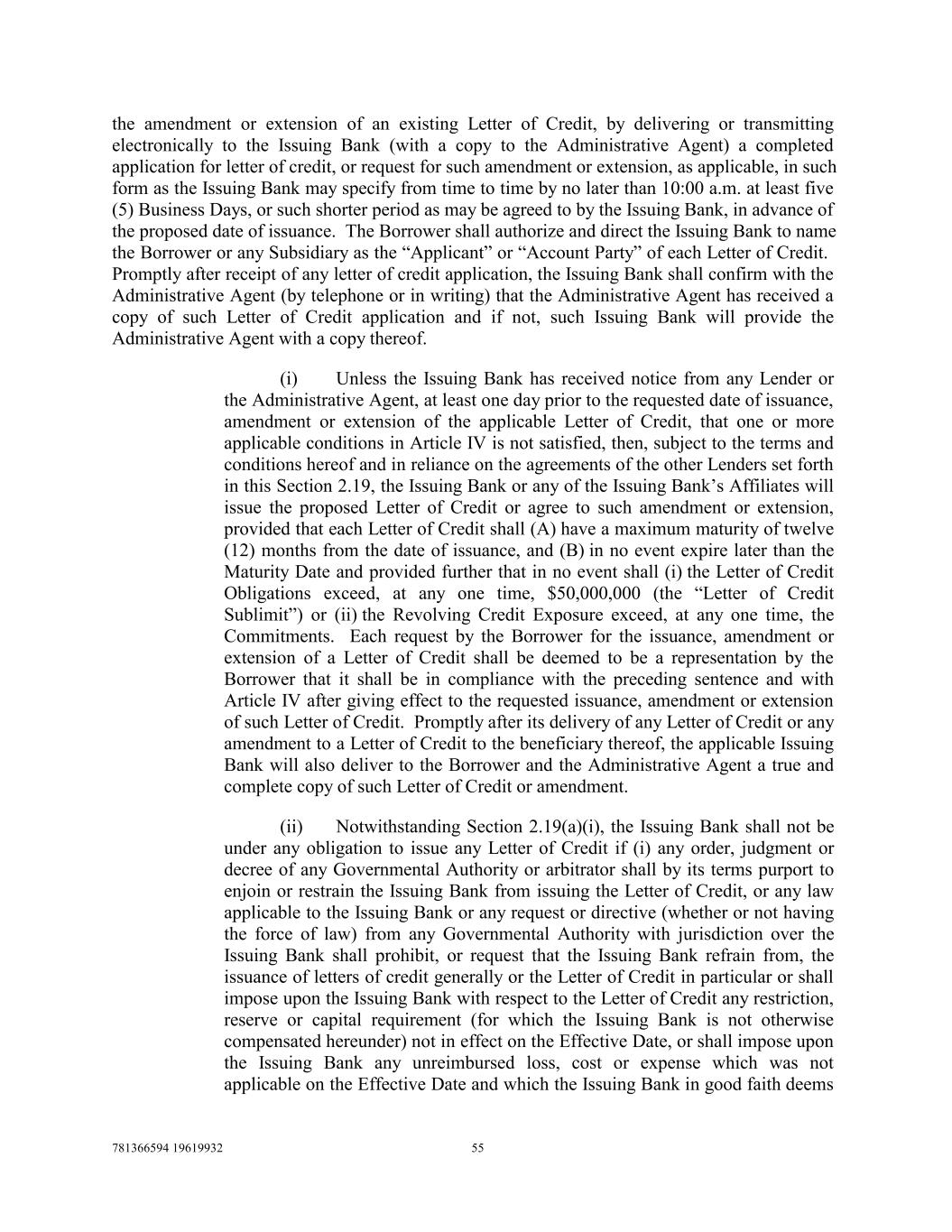the amendment or extension of an existing Letter of Credit, by delivering or transmitting electronically to the Issuing Bank (with a copy to the Administrative Agent) a completed application for letter of credit, or request for such amendment or extension, as applicable, in such form as the Issuing Bank may specify from time to time by no later than 10:00 a.m. at least five (5) Business Days, or such shorter period as may be agreed to by the Issuing Bank, in advance of the proposed date of issuance. The Borrower shall authorize and direct the Issuing Bank to name the Borrower or any Subsidiary as the “Applicant” or “Account Party” of each Letter of Credit. Promptly after receipt of any letter of credit application, the Issuing Bank shall confirm with the Administrative Agent (by telephone or in writing) that the Administrative Agent has received a copy of such Letter of Credit application and if not, such Issuing Bank will provide the Administrative Agent with a copy thereof. (i) Unless the Issuing Bank has received notice from any Lender or the Administrative Agent, at least one day prior to the requested date of issuance, amendment or extension of the applicable Letter of Credit, that one or more applicable conditions in Article IV is not satisfied, then, subject to the terms and conditions hereof and in reliance on the agreements of the other Lenders set forth in this Section 2.19, the Issuing Bank or any of the Issuing Bank’s Affiliates will issue the proposed Letter of Credit or agree to such amendment or extension, provided that each Letter of Credit shall (A) have a maximum maturity of twelve (12) months from the date of issuance, and (B) in no event expire later than the Maturity Date and provided further that in no event shall (i) the Letter of Credit Obligations exceed, at any one time, $50,000,000 (the “Letter of Credit Sublimit”) or (ii) the Revolving Credit Exposure exceed, at any one time, the Commitments. Each request by the Borrower for the issuance, amendment or extension of a Letter of Credit shall be deemed to be a representation by the Borrower that it shall be in compliance with the preceding sentence and with Article IV after giving effect to the requested issuance, amendment or extension of such Letter of Credit. Promptly after its delivery of any Letter of Credit or any amendment to a Letter of Credit to the beneficiary thereof, the applicable Issuing Bank will also deliver to the Borrower and the Administrative Agent a true and complete copy of such Letter of Credit or amendment. (ii) Notwithstanding Section 2.19(a)(i), the Issuing Bank shall not be under any obligation to issue any Letter of Credit if (i) any order, judgment or decree of any Governmental Authority or arbitrator shall by its terms purport to enjoin or restrain the Issuing Bank from issuing the Letter of Credit, or any law applicable to the Issuing Bank or any request or directive (whether or not having the force of law) from any Governmental Authority with jurisdiction over the Issuing Bank shall prohibit, or request that the Issuing Bank refrain from, the issuance of letters of credit generally or the Letter of Credit in particular or shall impose upon the Issuing Bank with respect to the Letter of Credit any restriction, reserve or capital requirement (for which the Issuing Bank is not otherwise compensated hereunder) not in effect on the Effective Date, or shall impose upon the Issuing Bank any unreimbursed loss, cost or expense which was not applicable on the Effective Date and which the Issuing Bank in good faith deems 781366594 19619932 55