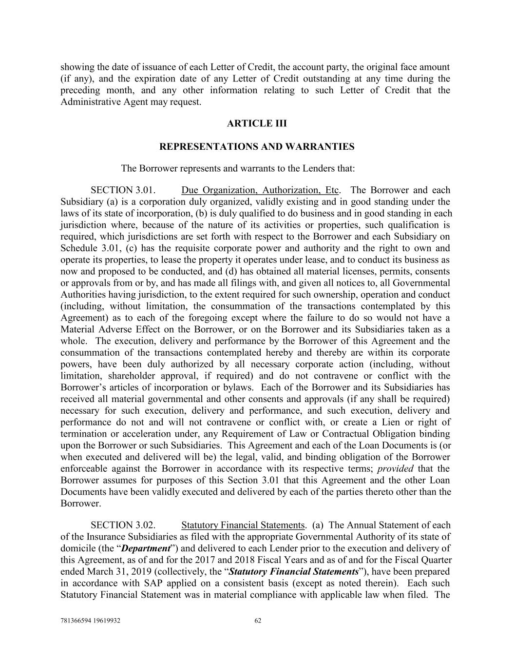 showing the date of issuance of each Letter of Credit, the account party, the original face amount (if any), and the expiration date of any Letter of Credit outstanding at any time during the preceding month, and any other information relating to such Letter of Credit that the Administrative Agent may request. ARTICLE III REPRESENTATIONS AND WARRANTIES The Borrower represents and warrants to the Lenders that: SECTION 3.01. Due Organization, Authorization, Etc. The Borrower and each Subsidiary (a) is a corporation duly organized, validly existing and in good standing under the laws of its state of incorporation, (b) is duly qualified to do business and in good standing in each jurisdiction where, because of the nature of its activities or properties, such qualification is required, which jurisdictions are set forth with respect to the Borrower and each Subsidiary on Schedule 3.01, (c) has the requisite corporate power and authority and the right to own and operate its properties, to lease the property it operates under lease, and to conduct its business as now and proposed to be conducted, and (d) has obtained all material licenses, permits, consents or approvals from or by, and has made all filings with, and given all notices to, all Governmental Authorities having jurisdiction, to the extent required for such ownership, operation and conduct (including, without limitation, the consummation of the transactions contemplated by this Agreement) as to each of the foregoing except where the failure to do so would not have a Material Adverse Effect on the Borrower, or on the Borrower and its Subsidiaries taken as a whole. The execution, delivery and performance by the Borrower of this Agreement and the consummation of the transactions contemplated hereby and thereby are within its corporate powers, have been duly authorized by all necessary corporate action (including, without limitation, shareholder approval, if required) and do not contravene or conflict with the Borrower’s articles of incorporation or bylaws. Each of the Borrower and its Subsidiaries has received all material governmental and other consents and approvals (if any shall be required) necessary for such execution, delivery and performance, and such execution, delivery and performance do not and will not contravene or conflict with, or create a Lien or right of termination or acceleration under, any Requirement of Law or Contractual Obligation binding upon the Borrower or such Subsidiaries. This Agreement and each of the Loan Documents is (or when executed and delivered will be) the legal, valid, and binding obligation of the Borrower enforceable against the Borrower in accordance with its respective terms; provided that the Borrower assumes for purposes of this Section 3.01 that this Agreement and the other Loan Documents have been validly executed and delivered by each of the parties thereto other than the Borrower. SECTION 3.02. Statutory Financial Statements. (a) The Annual Statement of each of the Insurance Subsidiaries as filed with the appropriate Governmental Authority of its state of domicile (the “Department”) and delivered to each Lender prior to the execution and delivery of this Agreement, as of and for the 2017 and 2018 Fiscal Years and as of and for the Fiscal Quarter ended March 31, 2019 (collectively, the “Statutory Financial Statements”), have been prepared in accordance with SAP applied on a consistent basis (except as noted therein). Each such Statutory Financial Statement was in material compliance with applicable law when filed. The 781366594 19619932 62