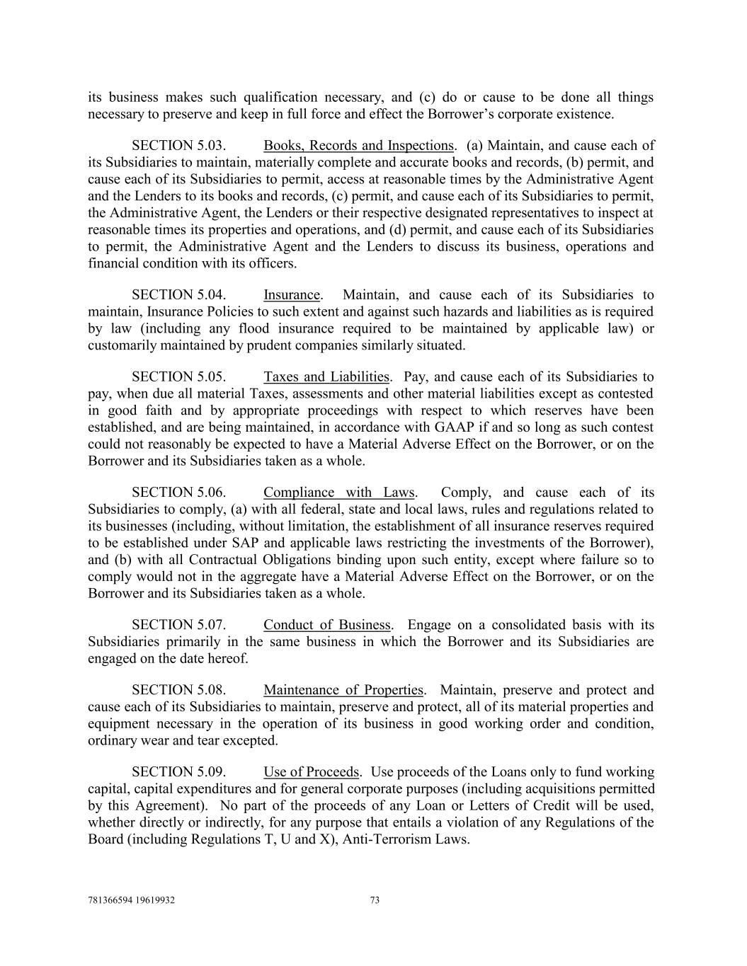 its business makes such qualification necessary, and (c) do or cause to be done all things necessary to preserve and keep in full force and effect the Borrower’s corporate existence. SECTION 5.03. Books, Records and Inspections. (a) Maintain, and cause each of its Subsidiaries to maintain, materially complete and accurate books and records, (b) permit, and cause each of its Subsidiaries to permit, access at reasonable times by the Administrative Agent and the Lenders to its books and records, (c) permit, and cause each of its Subsidiaries to permit, the Administrative Agent, the Lenders or their respective designated representatives to inspect at reasonable times its properties and operations, and (d) permit, and cause each of its Subsidiaries to permit, the Administrative Agent and the Lenders to discuss its business, operations and financial condition with its officers. SECTION 5.04. Insurance. Maintain, and cause each of its Subsidiaries to maintain, Insurance Policies to such extent and against such hazards and liabilities as is required by law (including any flood insurance required to be maintained by applicable law) or customarily maintained by prudent companies similarly situated. SECTION 5.05. Taxes and Liabilities. Pay, and cause each of its Subsidiaries to pay, when due all material Taxes, assessments and other material liabilities except as contested in good faith and by appropriate proceedings with respect to which reserves have been established, and are being maintained, in accordance with GAAP if and so long as such contest could not reasonably be expected to have a Material Adverse Effect on the Borrower, or on the Borrower and its Subsidiaries taken as a whole. SECTION 5.06. Compliance with Laws. Comply, and cause each of its Subsidiaries to comply, (a) with all federal, state and local laws, rules and regulations related to its businesses (including, without limitation, the establishment of all insurance reserves required to be established under SAP and applicable laws restricting the investments of the Borrower), and (b) with all Contractual Obligations binding upon such entity, except where failure so to comply would not in the aggregate have a Material Adverse Effect on the Borrower, or on the Borrower and its Subsidiaries taken as a whole. SECTION 5.07. Conduct of Business. Engage on a consolidated basis with its Subsidiaries primarily in the same business in which the Borrower and its Subsidiaries are engaged on the date hereof. SECTION 5.08. Maintenance of Properties. Maintain, preserve and protect and cause each of its Subsidiaries to maintain, preserve and protect, all of its material properties and equipment necessary in the operation of its business in good working order and condition, ordinary wear and tear excepted. SECTION 5.09. Use of Proceeds. Use proceeds of the Loans only to fund working capital, capital expenditures and for general corporate purposes (including acquisitions permitted by this Agreement). No part of the proceeds of any Loan or Letters of Credit will be used, whether directly or indirectly, for any purpose that entails a violation of any Regulations of the Board (including Regulations T, U and X), Anti-Terrorism Laws. 781366594 19619932 73