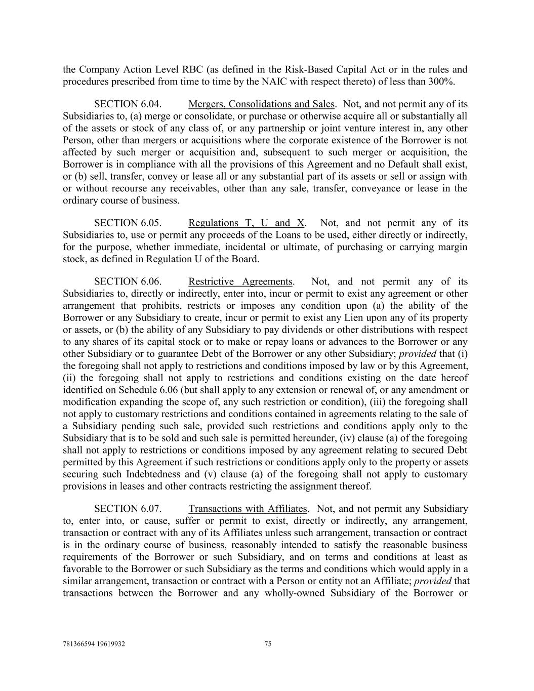 the Company Action Level RBC (as defined in the Risk-Based Capital Act or in the rules and procedures prescribed from time to time by the NAIC with respect thereto) of less than 300%. SECTION 6.04. Mergers, Consolidations and Sales. Not, and not permit any of its Subsidiaries to, (a) merge or consolidate, or purchase or otherwise acquire all or substantially all of the assets or stock of any class of, or any partnership or joint venture interest in, any other Person, other than mergers or acquisitions where the corporate existence of the Borrower is not affected by such merger or acquisition and, subsequent to such merger or acquisition, the Borrower is in compliance with all the provisions of this Agreement and no Default shall exist, or (b) sell, transfer, convey or lease all or any substantial part of its assets or sell or assign with or without recourse any receivables, other than any sale, transfer, conveyance or lease in the ordinary course of business. SECTION 6.05. Regulations T, U and X. Not, and not permit any of its Subsidiaries to, use or permit any proceeds of the Loans to be used, either directly or indirectly, for the purpose, whether immediate, incidental or ultimate, of purchasing or carrying margin stock, as defined in Regulation U of the Board. SECTION 6.06. Restrictive Agreements. Not, and not permit any of its Subsidiaries to, directly or indirectly, enter into, incur or permit to exist any agreement or other arrangement that prohibits, restricts or imposes any condition upon (a) the ability of the Borrower or any Subsidiary to create, incur or permit to exist any Lien upon any of its property or assets, or (b) the ability of any Subsidiary to pay dividends or other distributions with respect to any shares of its capital stock or to make or repay loans or advances to the Borrower or any other Subsidiary or to guarantee Debt of the Borrower or any other Subsidiary; provided that (i) the foregoing shall not apply to restrictions and conditions imposed by law or by this Agreement, (ii) the foregoing shall not apply to restrictions and conditions existing on the date hereof identified on Schedule 6.06 (but shall apply to any extension or renewal of, or any amendment or modification expanding the scope of, any such restriction or condition), (iii) the foregoing shall not apply to customary restrictions and conditions contained in agreements relating to the sale of a Subsidiary pending such sale, provided such restrictions and conditions apply only to the Subsidiary that is to be sold and such sale is permitted hereunder, (iv) clause (a) of the foregoing shall not apply to restrictions or conditions imposed by any agreement relating to secured Debt permitted by this Agreement if such restrictions or conditions apply only to the property or assets securing such Indebtedness and (v) clause (a) of the foregoing shall not apply to customary provisions in leases and other contracts restricting the assignment thereof. SECTION 6.07. Transactions with Affiliates. Not, and not permit any Subsidiary to, enter into, or cause, suffer or permit to exist, directly or indirectly, any arrangement, transaction or contract with any of its Affiliates unless such arrangement, transaction or contract is in the ordinary course of business, reasonably intended to satisfy the reasonable business requirements of the Borrower or such Subsidiary, and on terms and conditions at least as favorable to the Borrower or such Subsidiary as the terms and conditions which would apply in a similar arrangement, transaction or contract with a Person or entity not an Affiliate; provided that transactions between the Borrower and any wholly-owned Subsidiary of the Borrower or 781366594 19619932 75