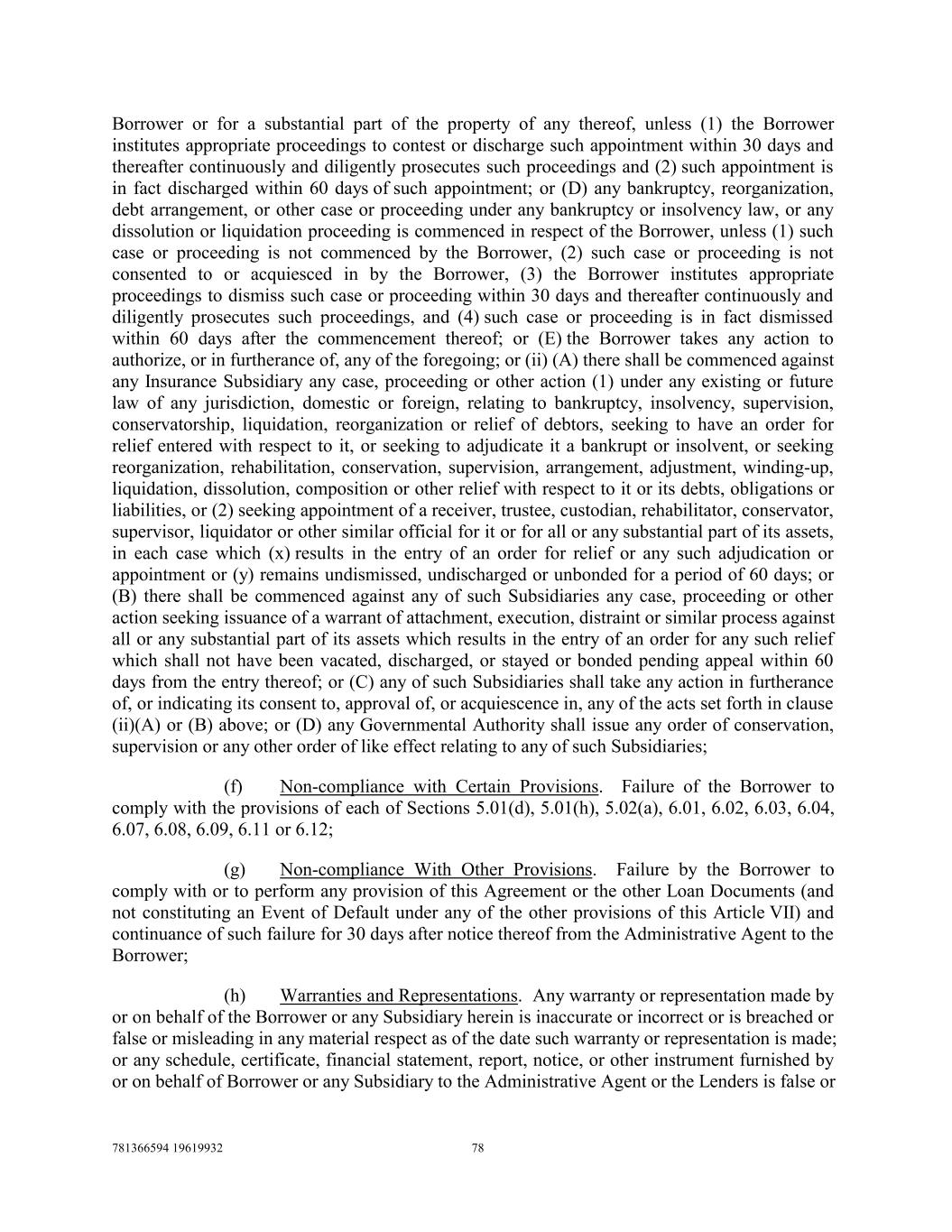 Borrower or for a substantial part of the property of any thereof, unless (1) the Borrower institutes appropriate proceedings to contest or discharge such appointment within 30 days and thereafter continuously and diligently prosecutes such proceedings and (2) such appointment is in fact discharged within 60 days of such appointment; or (D) any bankruptcy, reorganization, debt arrangement, or other case or proceeding under any bankruptcy or insolvency law, or any dissolution or liquidation proceeding is commenced in respect of the Borrower, unless (1) such case or proceeding is not commenced by the Borrower, (2) such case or proceeding is not consented to or acquiesced in by the Borrower, (3) the Borrower institutes appropriate proceedings to dismiss such case or proceeding within 30 days and thereafter continuously and diligently prosecutes such proceedings, and (4) such case or proceeding is in fact dismissed within 60 days after the commencement thereof; or (E) the Borrower takes any action to authorize, or in furtherance of, any of the foregoing; or (ii) (A) there shall be commenced against any Insurance Subsidiary any case, proceeding or other action (1) under any existing or future law of any jurisdiction, domestic or foreign, relating to bankruptcy, insolvency, supervision, conservatorship, liquidation, reorganization or relief of debtors, seeking to have an order for relief entered with respect to it, or seeking to adjudicate it a bankrupt or insolvent, or seeking reorganization, rehabilitation, conservation, supervision, arrangement, adjustment, winding-up, liquidation, dissolution, composition or other relief with respect to it or its debts, obligations or liabilities, or (2) seeking appointment of a receiver, trustee, custodian, rehabilitator, conservator, supervisor, liquidator or other similar official for it or for all or any substantial part of its assets, in each case which (x) results in the entry of an order for relief or any such adjudication or appointment or (y) remains undismissed, undischarged or unbonded for a period of 60 days; or (B) there shall be commenced against any of such Subsidiaries any case, proceeding or other action seeking issuance of a warrant of attachment, execution, distraint or similar process against all or any substantial part of its assets which results in the entry of an order for any such relief which shall not have been vacated, discharged, or stayed or bonded pending appeal within 60 days from the entry thereof; or (C) any of such Subsidiaries shall take any action in furtherance of, or indicating its consent to, approval of, or acquiescence in, any of the acts set forth in clause (ii)(A) or (B) above; or (D) any Governmental Authority shall issue any order of conservation, supervision or any other order of like effect relating to any of such Subsidiaries; (f) Non-compliance with Certain Provisions. Failure of the Borrower to comply with the provisions of each of Sections 5.01(d), 5.01(h), 5.02(a), 6.01, 6.02, 6.03, 6.04, 6.07, 6.08, 6.09, 6.11 or 6.12; (g) Non-compliance With Other Provisions. Failure by the Borrower to comply with or to perform any provision of this Agreement or the other Loan Documents (and not constituting an Event of Default under any of the other provisions of this Article VII) and continuance of such failure for 30 days after notice thereof from the Administrative Agent to the Borrower; (h) Warranties and Representations. Any warranty or representation made by or on behalf of the Borrower or any Subsidiary herein is inaccurate or incorrect or is breached or false or misleading in any material respect as of the date such warranty or representation is made; or any schedule, certificate, financial statement, report, notice, or other instrument furnished by or on behalf of Borrower or any Subsidiary to the Administrative Agent or the Lenders is false or 781366594 19619932 78