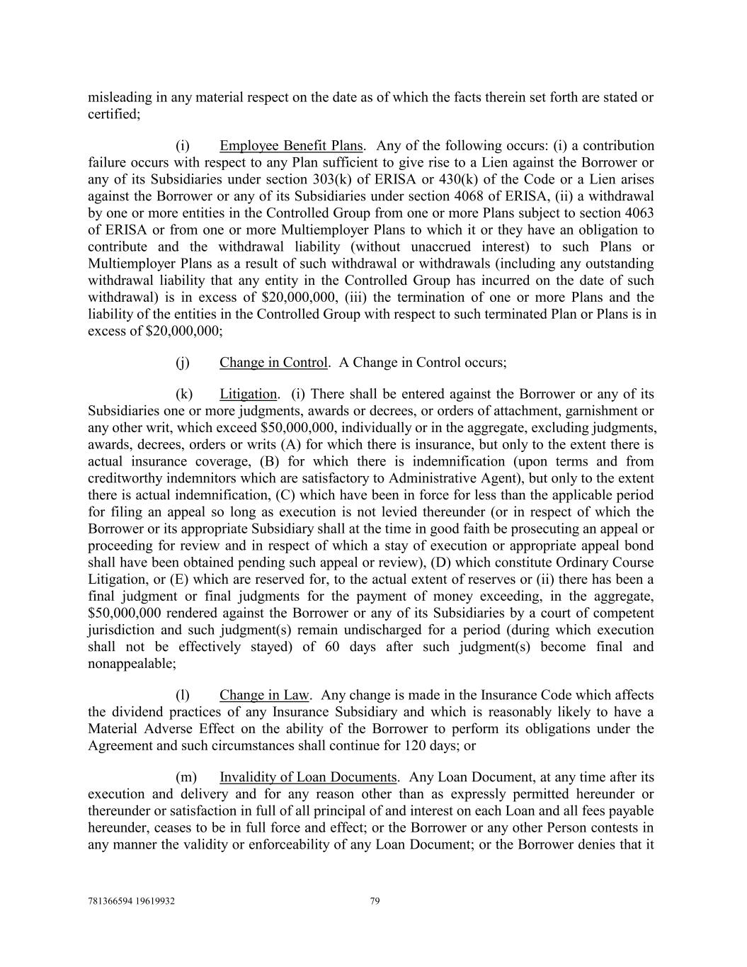 misleading in any material respect on the date as of which the facts therein set forth are stated or certified; (i) Employee Benefit Plans. Any of the following occurs: (i) a contribution failure occurs with respect to any Plan sufficient to give rise to a Lien against the Borrower or any of its Subsidiaries under section 303(k) of ERISA or 430(k) of the Code or a Lien arises against the Borrower or any of its Subsidiaries under section 4068 of ERISA, (ii) a withdrawal by one or more entities in the Controlled Group from one or more Plans subject to section 4063 of ERISA or from one or more Multiemployer Plans to which it or they have an obligation to contribute and the withdrawal liability (without unaccrued interest) to such Plans or Multiemployer Plans as a result of such withdrawal or withdrawals (including any outstanding withdrawal liability that any entity in the Controlled Group has incurred on the date of such withdrawal) is in excess of $20,000,000, (iii) the termination of one or more Plans and the liability of the entities in the Controlled Group with respect to such terminated Plan or Plans is in excess of $20,000,000; (j) Change in Control. A Change in Control occurs; (k) Litigation. (i) There shall be entered against the Borrower or any of its Subsidiaries one or more judgments, awards or decrees, or orders of attachment, garnishment or any other writ, which exceed $50,000,000, individually or in the aggregate, excluding judgments, awards, decrees, orders or writs (A) for which there is insurance, but only to the extent there is actual insurance coverage, (B) for which there is indemnification (upon terms and from creditworthy indemnitors which are satisfactory to Administrative Agent), but only to the extent there is actual indemnification, (C) which have been in force for less than the applicable period for filing an appeal so long as execution is not levied thereunder (or in respect of which the Borrower or its appropriate Subsidiary shall at the time in good faith be prosecuting an appeal or proceeding for review and in respect of which a stay of execution or appropriate appeal bond shall have been obtained pending such appeal or review), (D) which constitute Ordinary Course Litigation, or (E) which are reserved for, to the actual extent of reserves or (ii) there has been a final judgment or final judgments for the payment of money exceeding, in the aggregate, $50,000,000 rendered against the Borrower or any of its Subsidiaries by a court of competent jurisdiction and such judgment(s) remain undischarged for a period (during which execution shall not be effectively stayed) of 60 days after such judgment(s) become final and nonappealable; (l) Change in Law. Any change is made in the Insurance Code which affects the dividend practices of any Insurance Subsidiary and which is reasonably likely to have a Material Adverse Effect on the ability of the Borrower to perform its obligations under the Agreement and such circumstances shall continue for 120 days; or (m) Invalidity of Loan Documents. Any Loan Document, at any time after its execution and delivery and for any reason other than as expressly permitted hereunder or thereunder or satisfaction in full of all principal of and interest on each Loan and all fees payable hereunder, ceases to be in full force and effect; or the Borrower or any other Person contests in any manner the validity or enforceability of any Loan Document; or the Borrower denies that it 781366594 19619932 79
