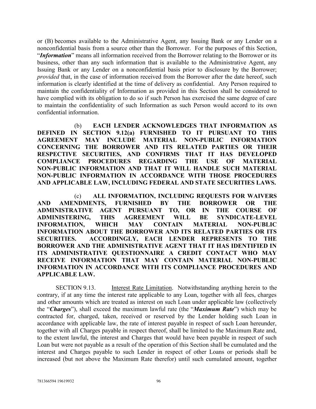 or (B) becomes available to the Administrative Agent, any Issuing Bank or any Lender on a nonconfidential basis from a source other than the Borrower. For the purposes of this Section, “Information” means all information received from the Borrower relating to the Borrower or its business, other than any such information that is available to the Administrative Agent, any Issuing Bank or any Lender on a nonconfidential basis prior to disclosure by the Borrower; provided that, in the case of information received from the Borrower after the date hereof, such information is clearly identified at the time of delivery as confidential. Any Person required to maintain the confidentiality of Information as provided in this Section shall be considered to have complied with its obligation to do so if such Person has exercised the same degree of care to maintain the confidentiality of such Information as such Person would accord to its own confidential information. (b) EACH LENDER ACKNOWLEDGES THAT INFORMATION AS DEFINED IN SECTION 9.12(a) FURNISHED TO IT PURSUANT TO THIS AGREEMENT MAY INCLUDE MATERIAL NON-PUBLIC INFORMATION CONCERNING THE BORROWER AND ITS RELATED PARTIES OR THEIR RESPECTIVE SECURITIES, AND CONFIRMS THAT IT HAS DEVELOPED COMPLIANCE PROCEDURES REGARDING THE USE OF MATERIAL NON-PUBLIC INFORMATION AND THAT IT WILL HANDLE SUCH MATERIAL NON-PUBLIC INFORMATION IN ACCORDANCE WITH THOSE PROCEDURES AND APPLICABLE LAW, INCLUDING FEDERAL AND STATE SECURITIES LAWS. (c) ALL INFORMATION, INCLUDING REQUESTS FOR WAIVERS AND AMENDMENTS, FURNISHED BY THE BORROWER OR THE ADMINISTRATIVE AGENT PURSUANT TO, OR IN THE COURSE OF ADMINISTERING, THIS AGREEMENT WILL BE SYNDICATE-LEVEL INFORMATION, WHICH MAY CONTAIN MATERIAL NON-PUBLIC INFORMATION ABOUT THE BORROWER AND ITS RELATED PARTIES OR ITS SECURITIES. ACCORDINGLY, EACH LENDER REPRESENTS TO THE BORROWER AND THE ADMINISTRATIVE AGENT THAT IT HAS IDENTIFIED IN ITS ADMINISTRATIVE QUESTIONNAIRE A CREDIT CONTACT WHO MAY RECEIVE INFORMATION THAT MAY CONTAIN MATERIAL NON-PUBLIC INFORMATION IN ACCORDANCE WITH ITS COMPLIANCE PROCEDURES AND APPLICABLE LAW. SECTION 9.13. Interest Rate Limitation. Notwithstanding anything herein to the contrary, if at any time the interest rate applicable to any Loan, together with all fees, charges and other amounts which are treated as interest on such Loan under applicable law (collectively the “Charges”), shall exceed the maximum lawful rate (the “Maximum Rate”) which may be contracted for, charged, taken, received or reserved by the Lender holding such Loan in accordance with applicable law, the rate of interest payable in respect of such Loan hereunder, together with all Charges payable in respect thereof, shall be limited to the Maximum Rate and, to the extent lawful, the interest and Charges that would have been payable in respect of such Loan but were not payable as a result of the operation of this Section shall be cumulated and the interest and Charges payable to such Lender in respect of other Loans or periods shall be increased (but not above the Maximum Rate therefor) until such cumulated amount, together 781366594 19619932 96