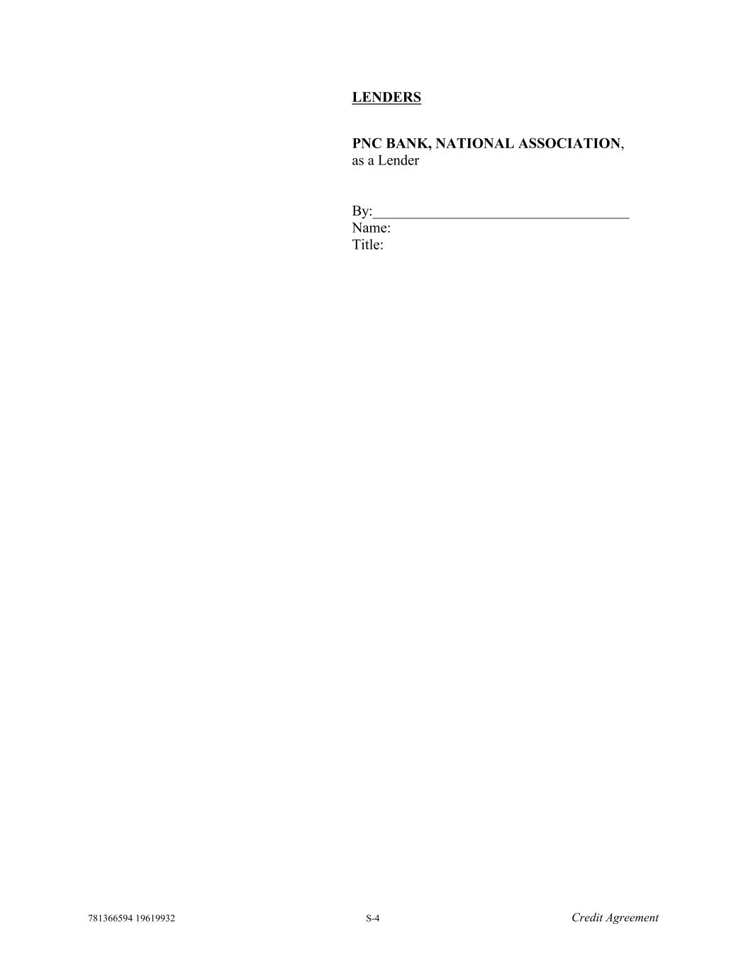 LENDERS PNC BANK, NATIONAL ASSOCIATION, as a Lender By:___________________________________ Name: Title: 781366594 19619932 S-4 Credit Agreement