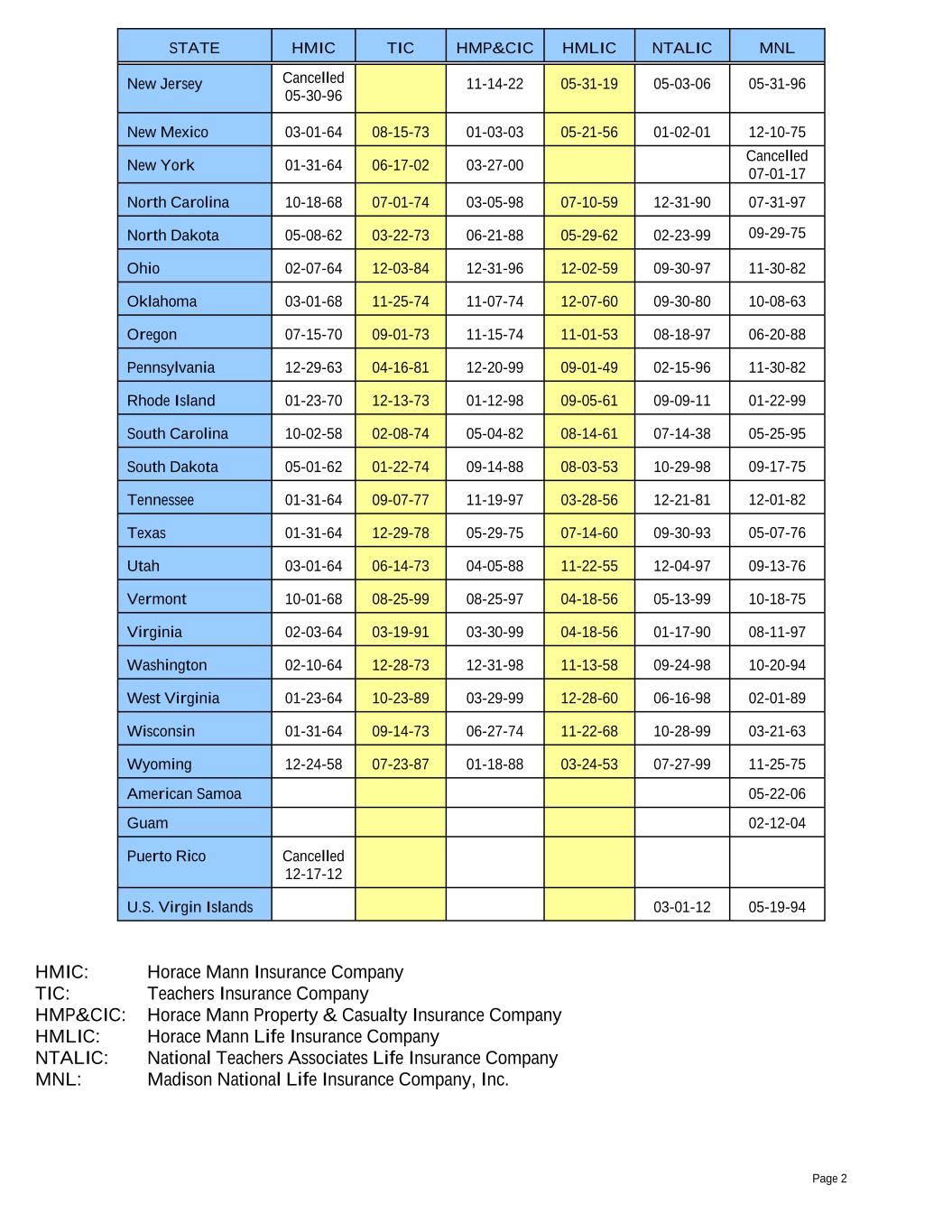 781366594 19619932 05-01-62 X Virginia HMP&C IC 02-03-64 03-19-91 01-22-74 03-30-99 Texas 04-18-56 STATE 01-31-64 X 09-14-88 12-29-78 Washington HMLIC 02-10-64 05-29-75 12-28-73 08-03-53 12-31-98 07-14-60 11-13-58 09-20-57 06-26-68 X 09-10-7 3 West Virginia ELICA 01-23-64 10-23-89 X 03-29-99 Utah 12-28-60 HMIC 03-01-64 X 06-14-73 Wisconsin HMSC 01-31-64 04-05-88 09-14-73 Tennessee 06-27-74 11-22-55 11-22-68 X 01-31-64 X Wyoming 12-24-58 07-23-87 09-07-77 01-18-88 Vermont 03-24-53 TIC 10-01-68 X 11-19-97 08-25-99 Puerto Rico South Dakota Cancelle d 12-17-12 08-25-97 03-28-56 04-18-56 HMIC: Horace Mann Insurance Company TIC: Teachers Insurance Company HMP&CIC: Horace Mann Property & Casualty Insurance Company HMLIC: Horace Mann Life Insurance Company HMSC: Horace Mann Service Corporation ELICA: Educators Life Insurance Company of America X