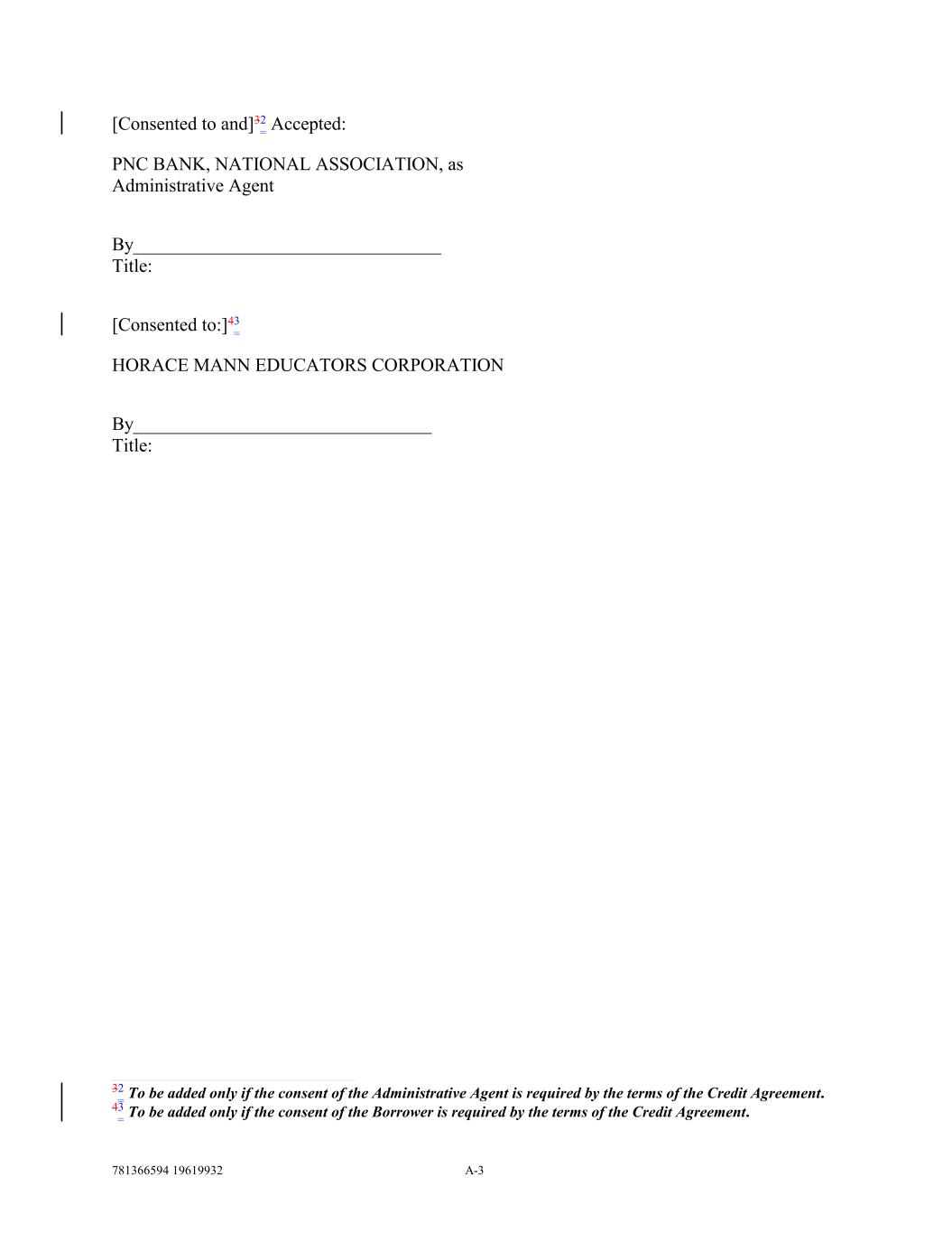 781366594 19619932 A-3 [Consented to:]43 HORACE MANN EDUCATORS CORPORATION By________________________________ Title: [Consented to and]32 Accepted: PNC BANK, NATIONAL ASSOCIATION, as Administrative Agent By_________________________________ Title: 32 To be added only if the consent of the Administrative Agent is required by the terms of the Credit Agreement. 43 To be added only if the consent of the Borrower is required by the terms of the Credit Agreement.