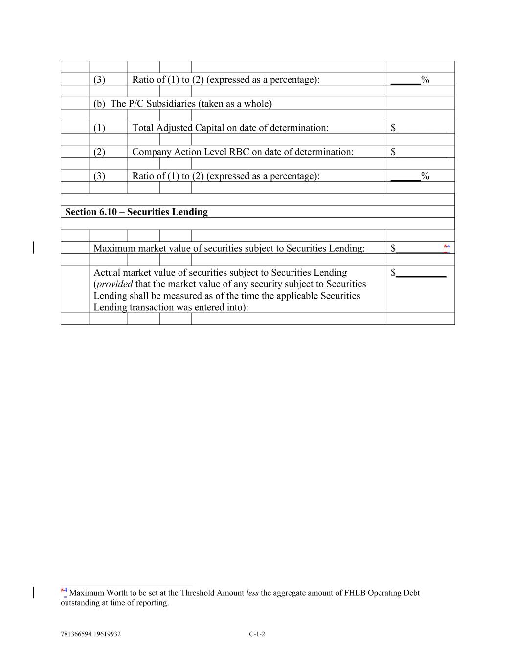 781366594 19619932 C-1-2 ______% (3) Ratio of (1) to (2) (expressed as a percentage): ______% (1) Total Adjusted Capital on date of determination: Section 6.10 – Securities Lending $__________ Maximum market value of securities subject to Securities Lending: $ 54 (3) (2) (b) The P/C Subsidiaries (taken as a whole) Actual market value of securities subject to Securities Lending (provided that the market value of any security subject to Securities Lending shall be measured as of the time the applicable Securities Lending transaction was entered into): Company Action Level RBC on date of determination: $__________ $__________ Ratio of (1) to (2) (expressed as a percentage): 54 Maximum Worth to be set at the Threshold Amount less the aggregate amount of FHLB Operating Debt outstanding at time of reporting.