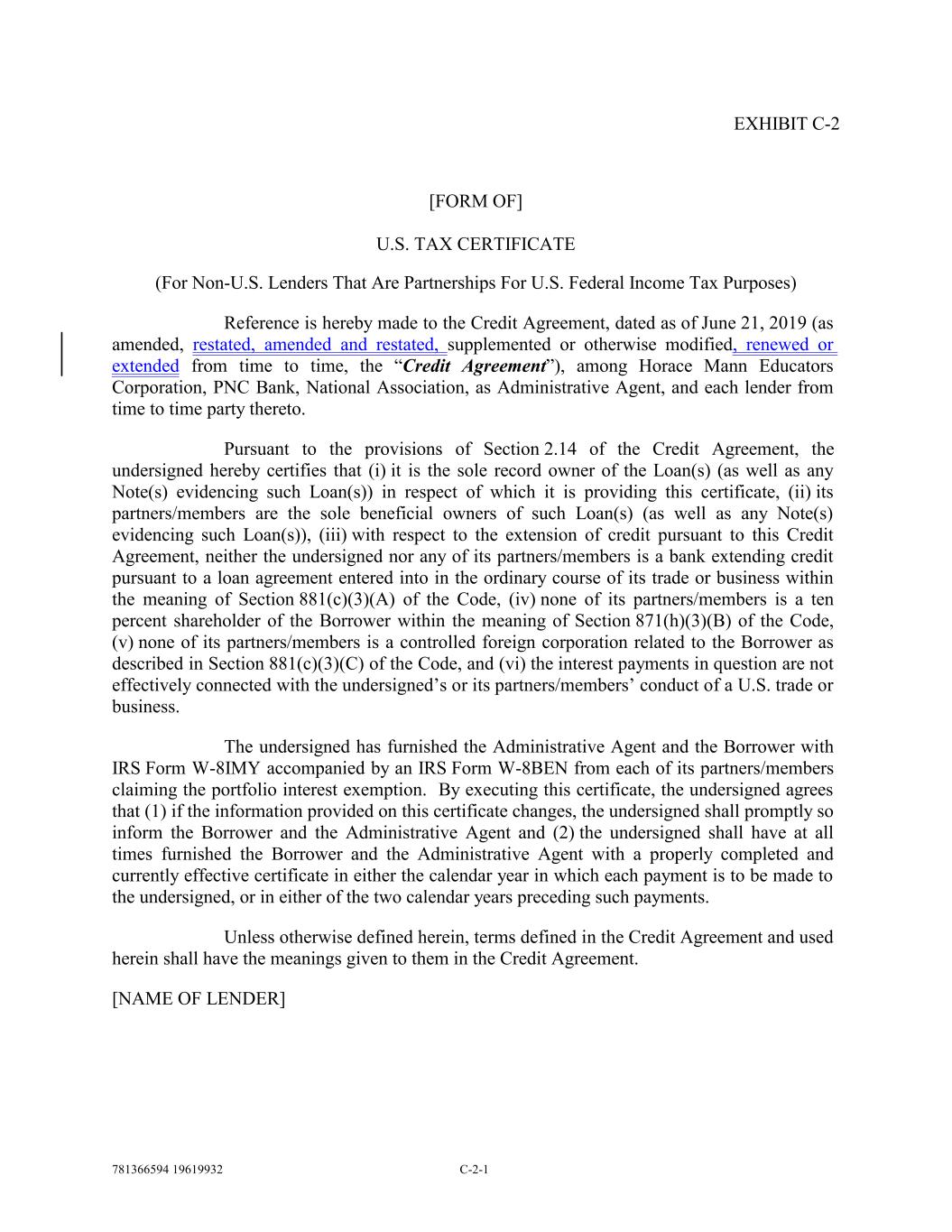 EXHIBIT C-2 [FORM OF] U.S. TAX CERTIFICATE (For Non-U.S. Lenders That Are Partnerships For U.S. Federal Income Tax Purposes) Reference is hereby made to the Credit Agreement, dated as of June 21, 2019 (as amended, restated, amended and restated, supplemented or otherwise modified, renewed or extended from time to time, the “Credit Agreement”), among Horace Mann Educators Corporation, PNC Bank, National Association, as Administrative Agent, and each lender from time to time party thereto. Pursuant to the provisions of Section 2.14 of the Credit Agreement, the undersigned hereby certifies that (i) it is the sole record owner of the Loan(s) (as well as any Note(s) evidencing such Loan(s)) in respect of which it is providing this certificate, (ii) its partners/members are the sole beneficial owners of such Loan(s) (as well as any Note(s) evidencing such Loan(s)), (iii) with respect to the extension of credit pursuant to this Credit Agreement, neither the undersigned nor any of its partners/members is a bank extending credit pursuant to a loan agreement entered into in the ordinary course of its trade or business within the meaning of Section 881(c)(3)(A) of the Code, (iv) none of its partners/members is a ten percent shareholder of the Borrower within the meaning of Section 871(h)(3)(B) of the Code, (v) none of its partners/members is a controlled foreign corporation related to the Borrower as described in Section 881(c)(3)(C) of the Code, and (vi) the interest payments in question are not effectively connected with the undersigned’s or its partners/members’ conduct of a U.S. trade or business. The undersigned has furnished the Administrative Agent and the Borrower with IRS Form W-8IMY accompanied by an IRS Form W-8BEN from each of its partners/members claiming the portfolio interest exemption. By executing this certificate, the undersigned agrees that (1) if the information provided on this certificate changes, the undersigned shall promptly so inform the Borrower and the Administrative Agent and (2) the undersigned shall have at all times furnished the Borrower and the Administrative Agent with a properly completed and currently effective certificate in either the calendar year in which each payment is to be made to the undersigned, or in either of the two calendar years preceding such payments. Unless otherwise defined herein, terms defined in the Credit Agreement and used herein shall have the meanings given to them in the Credit Agreement. [NAME OF LENDER] 781366594 19619932 C-2-1