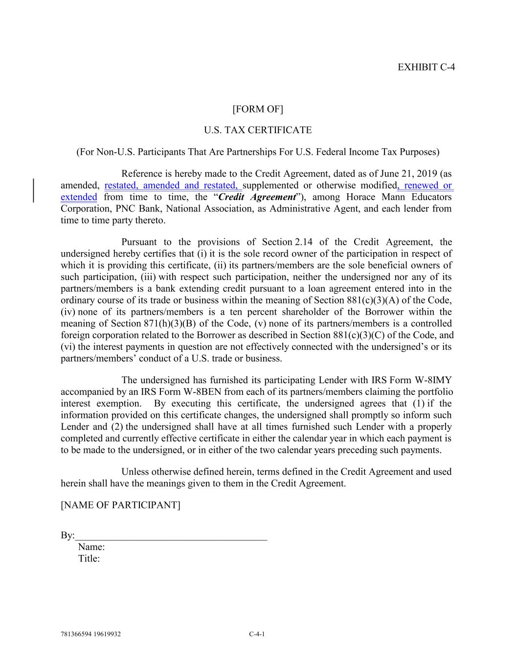 EXHIBIT C-4 [FORM OF] U.S. TAX CERTIFICATE (For Non-U.S. Participants That Are Partnerships For U.S. Federal Income Tax Purposes) Reference is hereby made to the Credit Agreement, dated as of June 21, 2019 (as amended, restated, amended and restated, supplemented or otherwise modified, renewed or extended from time to time, the “Credit Agreement”), among Horace Mann Educators Corporation, PNC Bank, National Association, as Administrative Agent, and each lender from time to time party thereto. Pursuant to the provisions of Section 2.14 of the Credit Agreement, the undersigned hereby certifies that (i) it is the sole record owner of the participation in respect of which it is providing this certificate, (ii) its partners/members are the sole beneficial owners of such participation, (iii) with respect such participation, neither the undersigned nor any of its partners/members is a bank extending credit pursuant to a loan agreement entered into in the ordinary course of its trade or business within the meaning of Section 881(c)(3)(A) of the Code, (iv) none of its partners/members is a ten percent shareholder of the Borrower within the meaning of Section 871(h)(3)(B) of the Code, (v) none of its partners/members is a controlled foreign corporation related to the Borrower as described in Section 881(c)(3)(C) of the Code, and (vi) the interest payments in question are not effectively connected with the undersigned’s or its partners/members’ conduct of a U.S. trade or business. The undersigned has furnished its participating Lender with IRS Form W-8IMY accompanied by an IRS Form W-8BEN from each of its partners/members claiming the portfolio interest exemption. By executing this certificate, the undersigned agrees that (1) if the information provided on this certificate changes, the undersigned shall promptly so inform such Lender and (2) the undersigned shall have at all times furnished such Lender with a properly completed and currently effective certificate in either the calendar year in which each payment is to be made to the undersigned, or in either of the two calendar years preceding such payments. Unless otherwise defined herein, terms defined in the Credit Agreement and used herein shall have the meanings given to them in the Credit Agreement. [NAME OF PARTICIPANT] By:______________________________________ Name: Title: 781366594 19619932 C-4-1