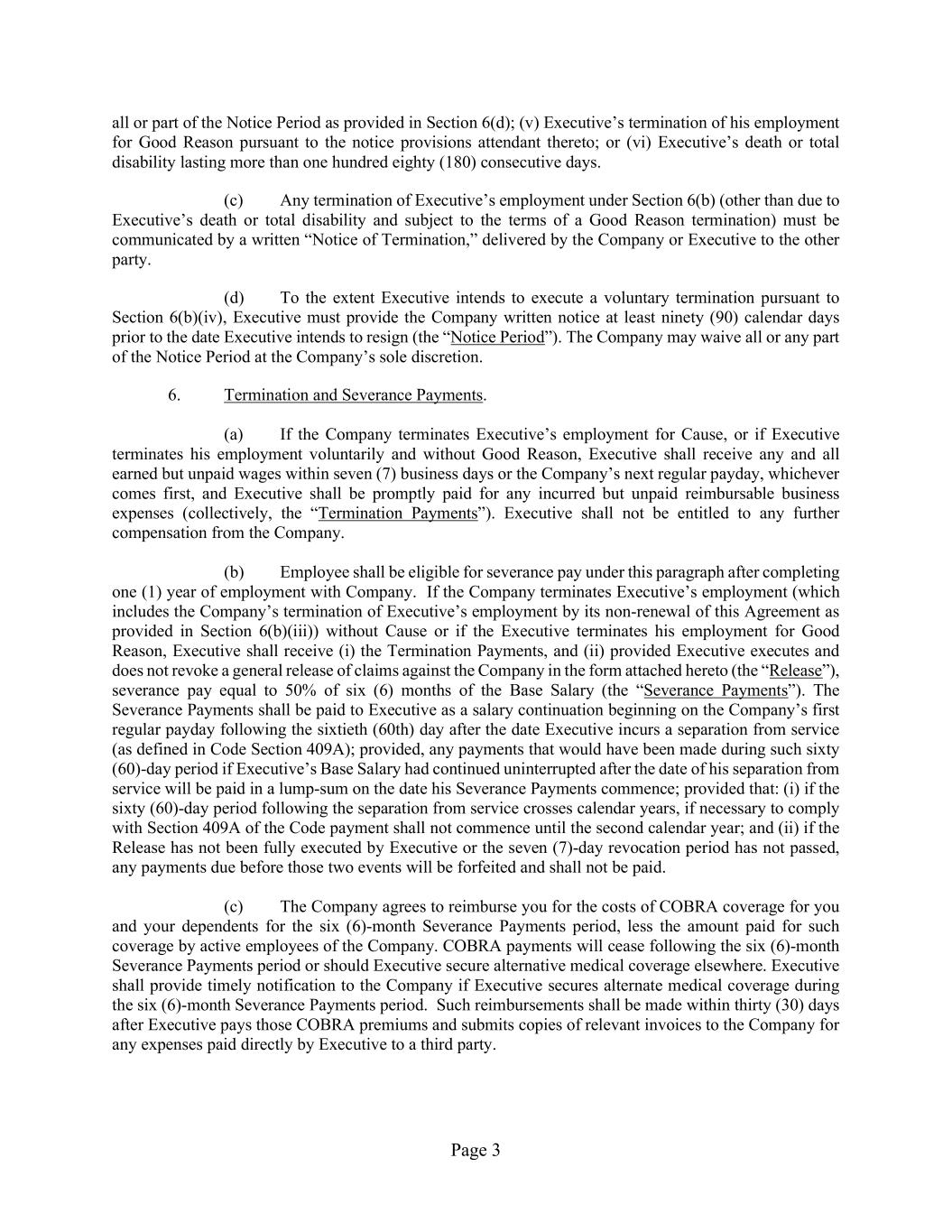 Page 3 all or part of the Notice Period as provided in Section 6(d); (v) Executive’s termination of his employment for Good Reason pursuant to the notice provisions attendant thereto; or (vi) Executive’s death or total disability lasting more than one hundred eighty (180) consecutive days. (c) Any termination of Executive’s employment under Section 6(b) (other than due to Executive’s death or total disability and subject to the terms of a Good Reason termination) must be communicated by a written “Notice of Termination,” delivered by the Company or Executive to the other party. (d) To the extent Executive intends to execute a voluntary termination pursuant to Section 6(b)(iv), Executive must provide the Company written notice at least ninety (90) calendar days prior to the date Executive intends to resign (the “Notice Period”). The Company may waive all or any part of the Notice Period at the Company’s sole discretion. 6. Termination and Severance Payments. (a) If the Company terminates Executive’s employment for Cause, or if Executive terminates his employment voluntarily and without Good Reason, Executive shall receive any and all earned but unpaid wages within seven (7) business days or the Company’s next regular payday, whichever comes first, and Executive shall be promptly paid for any incurred but unpaid reimbursable business expenses (collectively, the “Termination Payments”). Executive shall not be entitled to any further compensation from the Company. (b) Employee shall be eligible for severance pay under this paragraph after completing one (1) year of employment with Company. If the Company terminates Executive’s employment (which includes the Company’s termination of Executive’s employment by its non-renewal of this Agreement as provided in Section 6(b)(iii)) without Cause or if the Executive terminates his employment for Good Reason, Executive shall receive (i) the Termination Payments, and (ii) provided Executive executes and does not revoke a general release of claims against the Company in the form attached hereto (the “Release”), severance pay equal to 50% of six (6) months of the Base Salary (the “Severance Payments”). The Severance Payments shall be paid to Executive as a salary continuation beginning on the Company’s first regular payday following the sixtieth (60th) day after the date Executive incurs a separation from service (as defined in Code Section 409A); provided, any payments that would have been made during such sixty (60)-day period if Executive’s Base Salary had continued uninterrupted after the date of his separation from service will be paid in a lump-sum on the date his Severance Payments commence; provided that: (i) if the sixty (60)-day period following the separation from service crosses calendar years, if necessary to comply with Section 409A of the Code payment shall not commence until the second calendar year; and (ii) if the Release has not been fully executed by Executive or the seven (7)-day revocation period has not passed, any payments due before those two events will be forfeited and shall not be paid. (c) The Company agrees to reimburse you for the costs of COBRA coverage for you and your dependents for the six (6)-month Severance Payments period, less the amount paid for such coverage by active employees of the Company. COBRA payments will cease following the six (6)-month Severance Payments period or should Executive secure alternative medical coverage elsewhere. Executive shall provide timely notification to the Company if Executive secures alternate medical coverage during the six (6)-month Severance Payments period. Such reimbursements shall be made within thirty (30) days after Executive pays those COBRA premiums and submits copies of relevant invoices to the Company for any expenses paid directly by Executive to a third party.