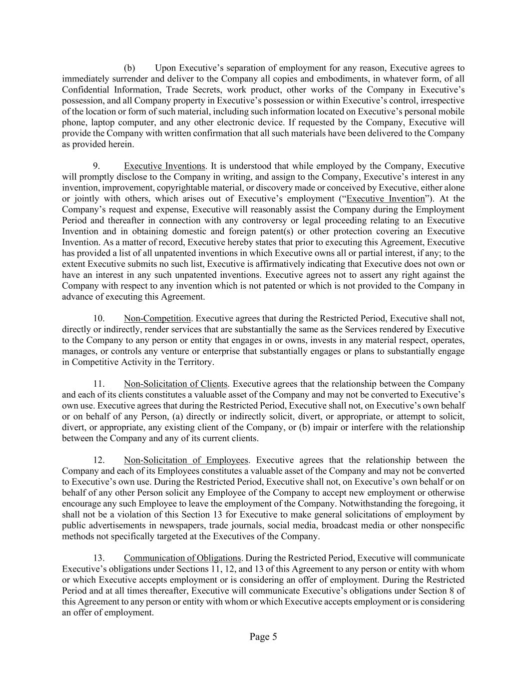 Page 5 (b) Upon Executive’s separation of employment for any reason, Executive agrees to immediately surrender and deliver to the Company all copies and embodiments, in whatever form, of all Confidential Information, Trade Secrets, work product, other works of the Company in Executive’s possession, and all Company property in Executive’s possession or within Executive’s control, irrespective of the location or form of such material, including such information located on Executive’s personal mobile phone, laptop computer, and any other electronic device. If requested by the Company, Executive will provide the Company with written confirmation that all such materials have been delivered to the Company as provided herein. 9. Executive Inventions. It is understood that while employed by the Company, Executive will promptly disclose to the Company in writing, and assign to the Company, Executive’s interest in any invention, improvement, copyrightable material, or discovery made or conceived by Executive, either alone or jointly with others, which arises out of Executive’s employment (“Executive Invention”). At the Company’s request and expense, Executive will reasonably assist the Company during the Employment Period and thereafter in connection with any controversy or legal proceeding relating to an Executive Invention and in obtaining domestic and foreign patent(s) or other protection covering an Executive Invention. As a matter of record, Executive hereby states that prior to executing this Agreement, Executive has provided a list of all unpatented inventions in which Executive owns all or partial interest, if any; to the extent Executive submits no such list, Executive is affirmatively indicating that Executive does not own or have an interest in any such unpatented inventions. Executive agrees not to assert any right against the Company with respect to any invention which is not patented or which is not provided to the Company in advance of executing this Agreement. 10. Non-Competition. Executive agrees that during the Restricted Period, Executive shall not, directly or indirectly, render services that are substantially the same as the Services rendered by Executive to the Company to any person or entity that engages in or owns, invests in any material respect, operates, manages, or controls any venture or enterprise that substantially engages or plans to substantially engage in Competitive Activity in the Territory. 11. Non-Solicitation of Clients. Executive agrees that the relationship between the Company and each of its clients constitutes a valuable asset of the Company and may not be converted to Executive’s own use. Executive agrees that during the Restricted Period, Executive shall not, on Executive’s own behalf or on behalf of any Person, (a) directly or indirectly solicit, divert, or appropriate, or attempt to solicit, divert, or appropriate, any existing client of the Company, or (b) impair or interfere with the relationship between the Company and any of its current clients. 12. Non-Solicitation of Employees. Executive agrees that the relationship between the Company and each of its Employees constitutes a valuable asset of the Company and may not be converted to Executive’s own use. During the Restricted Period, Executive shall not, on Executive’s own behalf or on behalf of any other Person solicit any Employee of the Company to accept new employment or otherwise encourage any such Employee to leave the employment of the Company. Notwithstanding the foregoing, it shall not be a violation of this Section 13 for Executive to make general solicitations of employment by public advertisements in newspapers, trade journals, social media, broadcast media or other nonspecific methods not specifically targeted at the Executives of the Company. 13. Communication of Obligations. During the Restricted Period, Executive will communicate Executive’s obligations under Sections 11, 12, and 13 of this Agreement to any person or entity with whom or which Executive accepts employment or is considering an offer of employment. During the Restricted Period and at all times thereafter, Executive will communicate Executive’s obligations under Section 8 of this Agreement to any person or entity with whom or which Executive accepts employment or is considering an offer of employment.