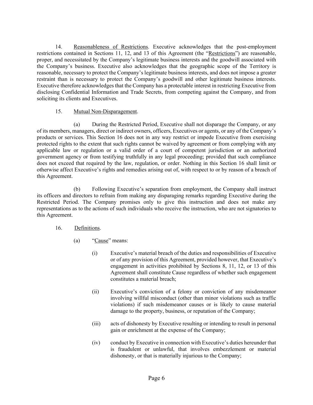 Page 6 14. Reasonableness of Restrictions. Executive acknowledges that the post-employment restrictions contained in Sections 11, 12, and 13 of this Agreement (the “Restrictions”) are reasonable, proper, and necessitated by the Company’s legitimate business interests and the goodwill associated with the Company’s business. Executive also acknowledges that the geographic scope of the Territory is reasonable, necessary to protect the Company’s legitimate business interests, and does not impose a greater restraint than is necessary to protect the Company’s goodwill and other legitimate business interests. Executive therefore acknowledges that the Company has a protectable interest in restricting Executive from disclosing Confidential Information and Trade Secrets, from competing against the Company, and from soliciting its clients and Executives. 15. Mutual Non-Disparagement. (a) During the Restricted Period, Executive shall not disparage the Company, or any of its members, managers, direct or indirect owners, officers, Executives or agents, or any of the Company’s products or services. This Section 16 does not in any way restrict or impede Executive from exercising protected rights to the extent that such rights cannot be waived by agreement or from complying with any applicable law or regulation or a valid order of a court of competent jurisdiction or an authorized government agency or from testifying truthfully in any legal proceeding; provided that such compliance does not exceed that required by the law, regulation, or order. Nothing in this Section 16 shall limit or otherwise affect Executive’s rights and remedies arising out of, with respect to or by reason of a breach of this Agreement. (b) Following Executive’s separation from employment, the Company shall instruct its officers and directors to refrain from making any disparaging remarks regarding Executive during the Restricted Period. The Company promises only to give this instruction and does not make any representations as to the actions of such individuals who receive the instruction, who are not signatories to this Agreement. 16. Definitions. (a) “Cause” means: (i) Executive’s material breach of the duties and responsibilities of Executive or of any provision of this Agreement, provided however, that Executive’s engagement in activities prohibited by Sections 8, 11, 12, or 13 of this Agreement shall constitute Cause regardless of whether such engagement constitutes a material breach; (ii) Executive’s conviction of a felony or conviction of any misdemeanor involving willful misconduct (other than minor violations such as traffic violations) if such misdemeanor causes or is likely to cause material damage to the property, business, or reputation of the Company; (iii) acts of dishonesty by Executive resulting or intending to result in personal gain or enrichment at the expense of the Company; (iv) conduct by Executive in connection with Executive’s duties hereunder that is fraudulent or unlawful, that involves embezzlement or material dishonesty, or that is materially injurious to the Company;