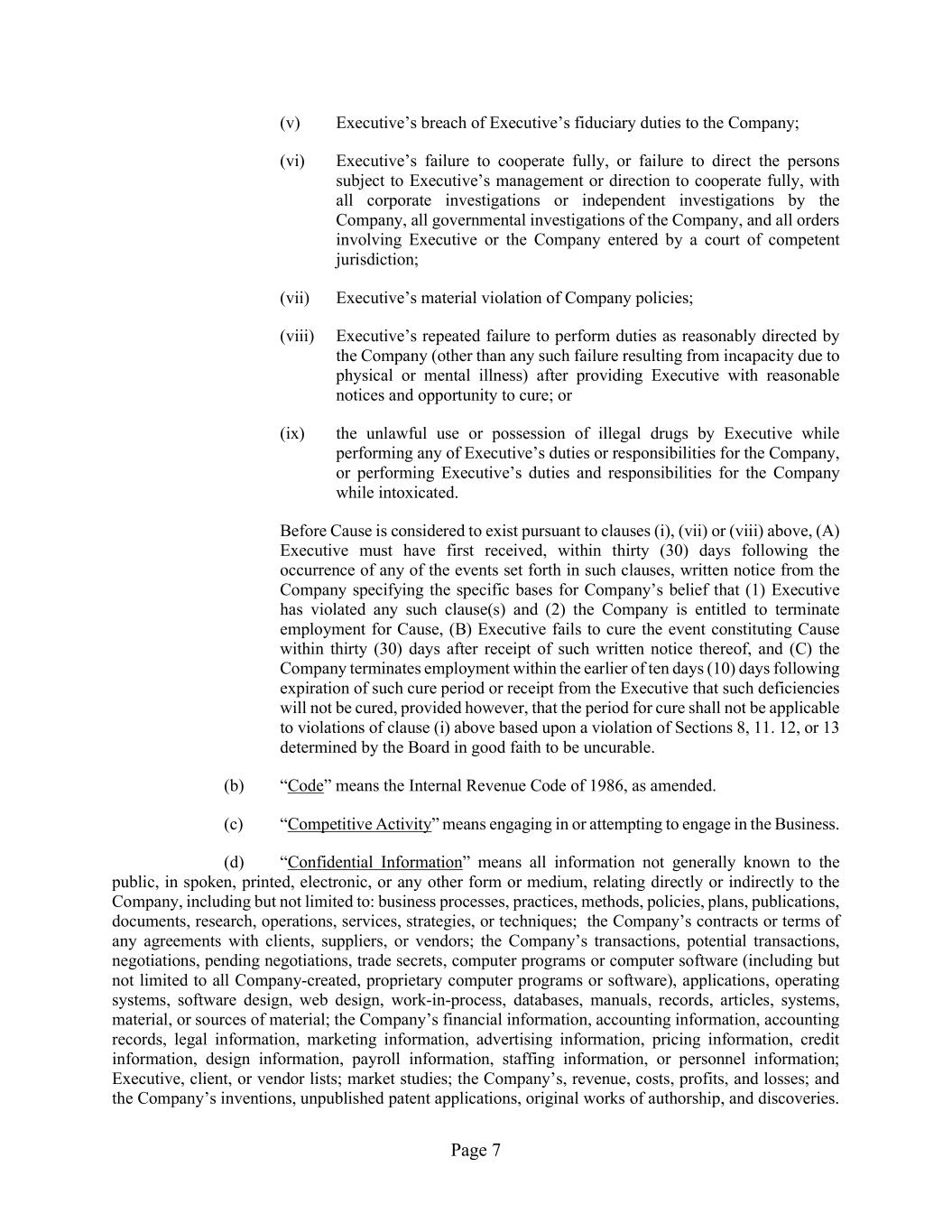 Page 7 (v) Executive’s breach of Executive’s fiduciary duties to the Company; (vi) Executive’s failure to cooperate fully, or failure to direct the persons subject to Executive’s management or direction to cooperate fully, with all corporate investigations or independent investigations by the Company, all governmental investigations of the Company, and all orders involving Executive or the Company entered by a court of competent jurisdiction; (vii) Executive’s material violation of Company policies; (viii) Executive’s repeated failure to perform duties as reasonably directed by the Company (other than any such failure resulting from incapacity due to physical or mental illness) after providing Executive with reasonable notices and opportunity to cure; or (ix) the unlawful use or possession of illegal drugs by Executive while performing any of Executive’s duties or responsibilities for the Company, or performing Executive’s duties and responsibilities for the Company while intoxicated. Before Cause is considered to exist pursuant to clauses (i), (vii) or (viii) above, (A) Executive must have first received, within thirty (30) days following the occurrence of any of the events set forth in such clauses, written notice from the Company specifying the specific bases for Company’s belief that (1) Executive has violated any such clause(s) and (2) the Company is entitled to terminate employment for Cause, (B) Executive fails to cure the event constituting Cause within thirty (30) days after receipt of such written notice thereof, and (C) the Company terminates employment within the earlier of ten days (10) days following expiration of such cure period or receipt from the Executive that such deficiencies will not be cured, provided however, that the period for cure shall not be applicable to violations of clause (i) above based upon a violation of Sections 8, 11. 12, or 13 determined by the Board in good faith to be uncurable. (b) “Code” means the Internal Revenue Code of 1986, as amended. (c) “Competitive Activity” means engaging in or attempting to engage in the Business. (d) “Confidential Information” means all information not generally known to the public, in spoken, printed, electronic, or any other form or medium, relating directly or indirectly to the Company, including but not limited to: business processes, practices, methods, policies, plans, publications, documents, research, operations, services, strategies, or techniques; the Company’s contracts or terms of any agreements with clients, suppliers, or vendors; the Company’s transactions, potential transactions, negotiations, pending negotiations, trade secrets, computer programs or computer software (including but not limited to all Company-created, proprietary computer programs or software), applications, operating systems, software design, web design, work-in-process, databases, manuals, records, articles, systems, material, or sources of material; the Company’s financial information, accounting information, accounting records, legal information, marketing information, advertising information, pricing information, credit information, design information, payroll information, staffing information, or personnel information; Executive, client, or vendor lists; market studies; the Company’s, revenue, costs, profits, and losses; and the Company’s inventions, unpublished patent applications, original works of authorship, and discoveries.